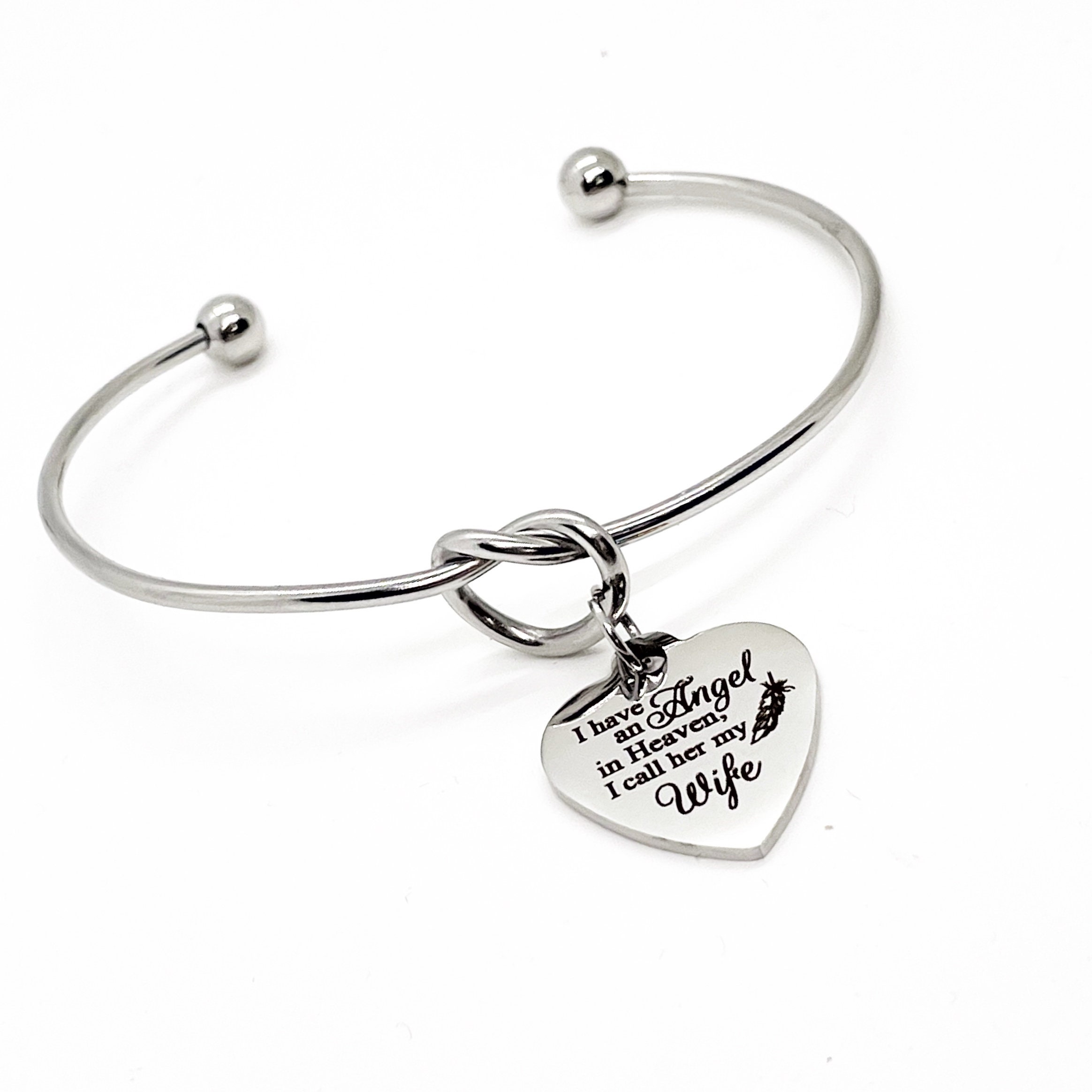 This is a beautiful knotted cuff bracelet with an engraved charm with “I have an angel in heaven. I call her my Wife” on it.