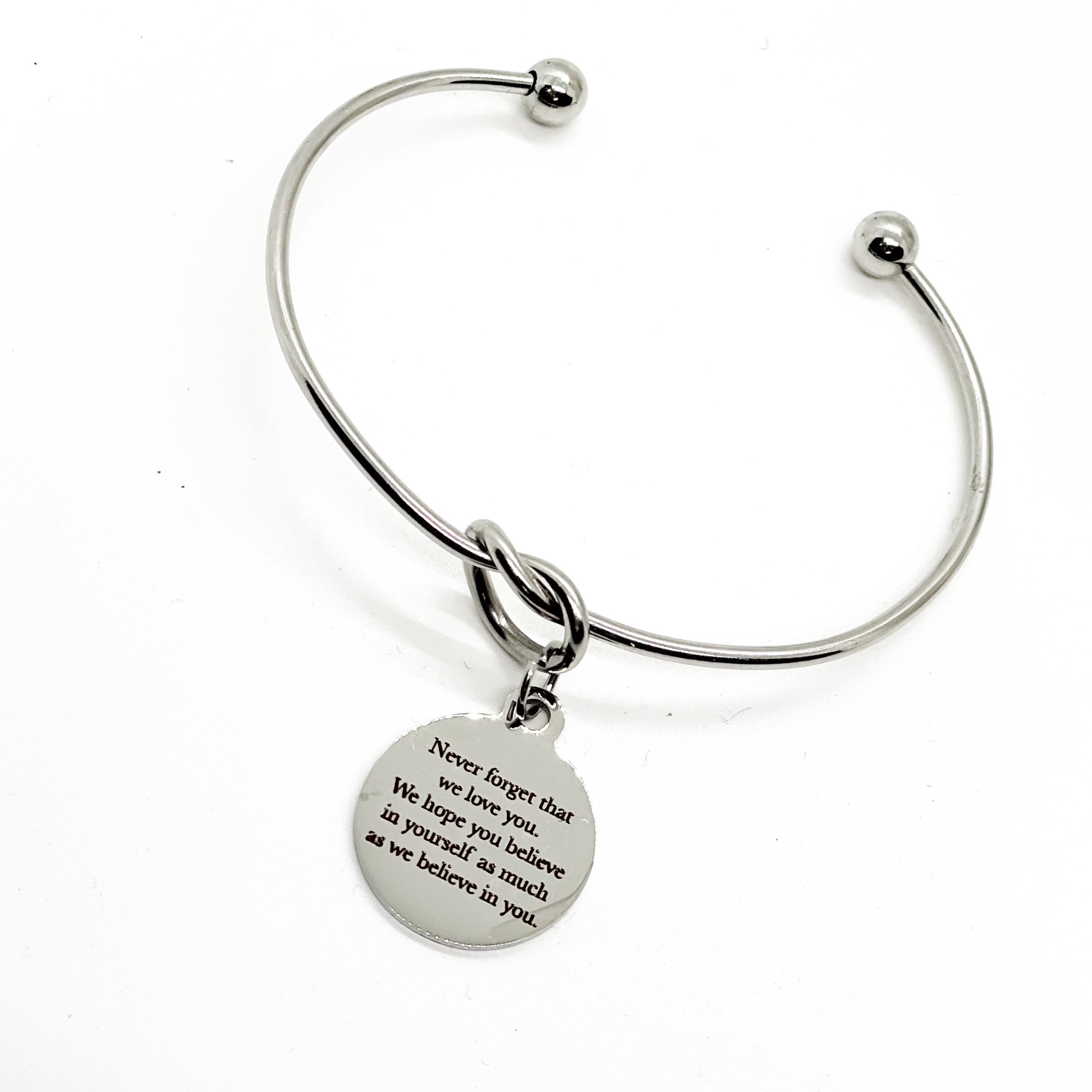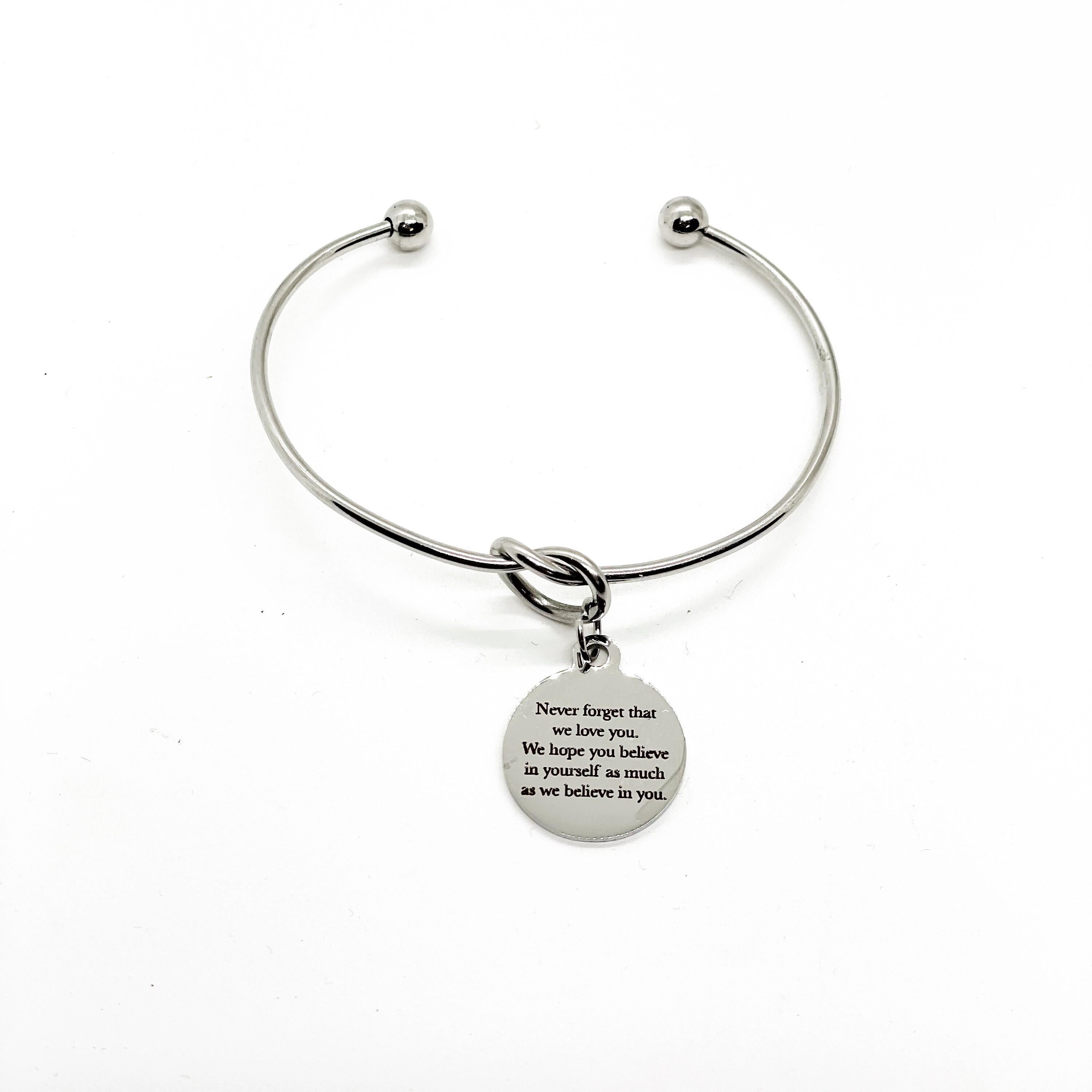 This is a beautiful knotted stainless steel cuff bracelet with an engraved charm with “Never forget that we love you. We hope you believe in yourself as much as we believe in you.” on it