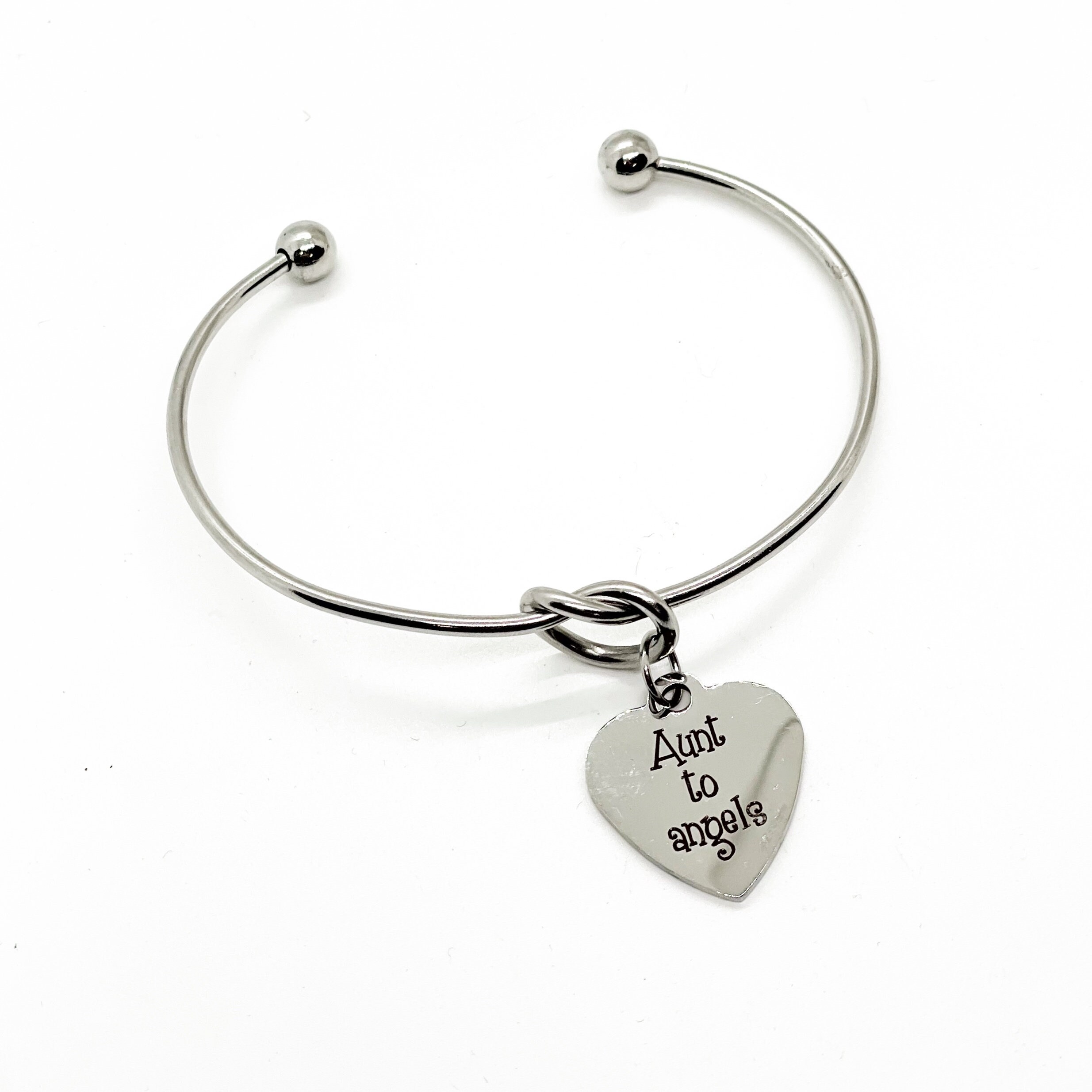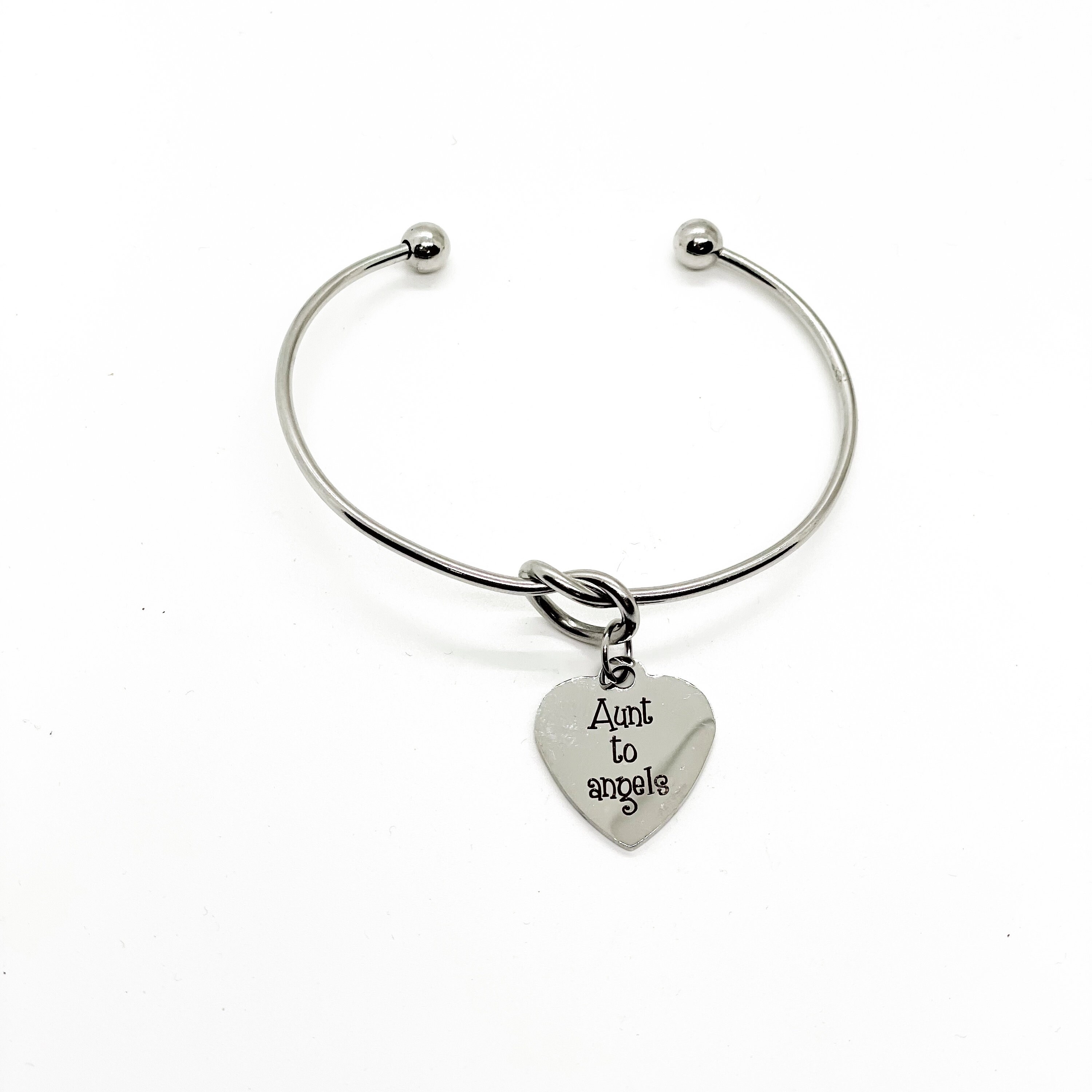 This is a beautiful knotted stainless steel cuff bracelet with an engraved charm with “Aunt to Angels” on it.