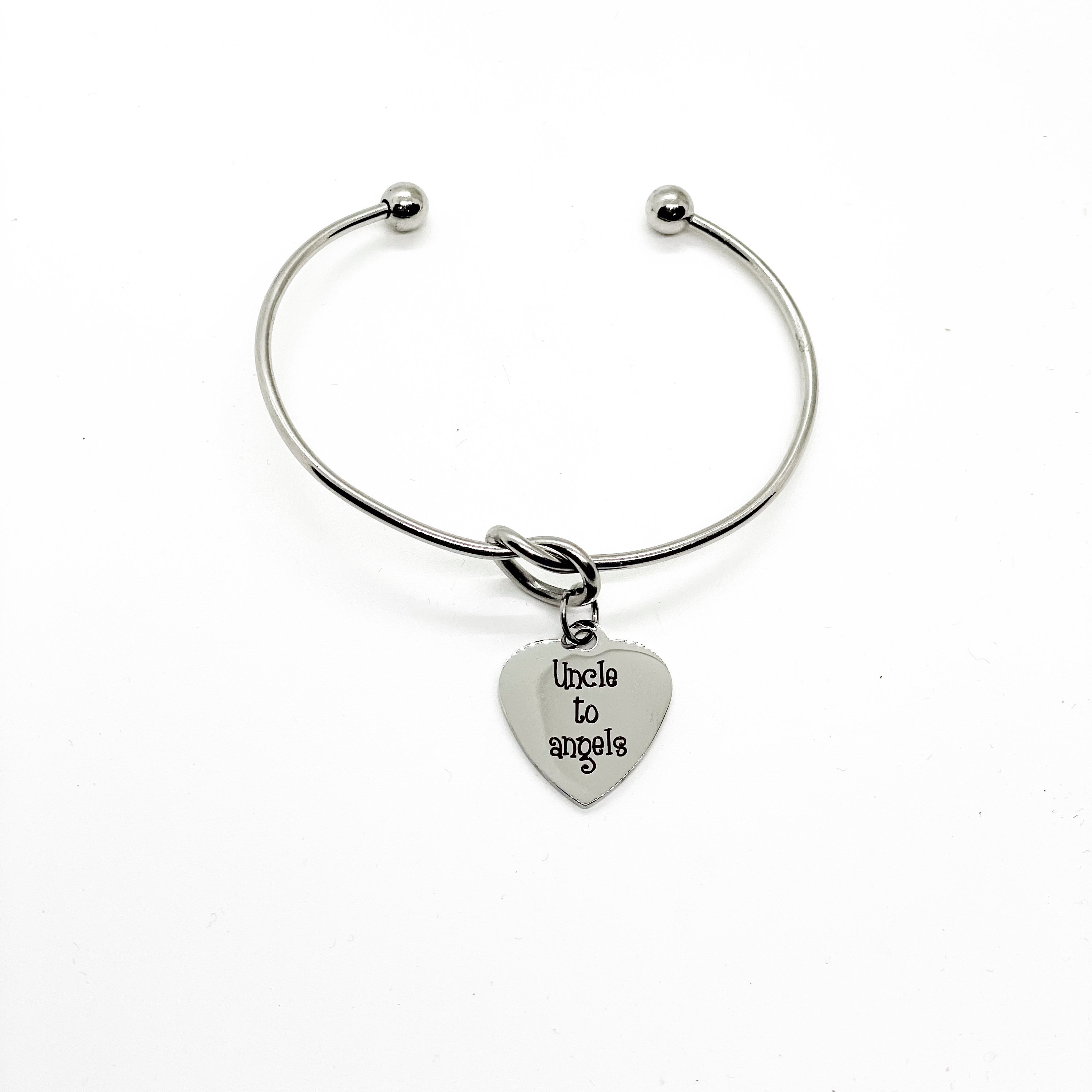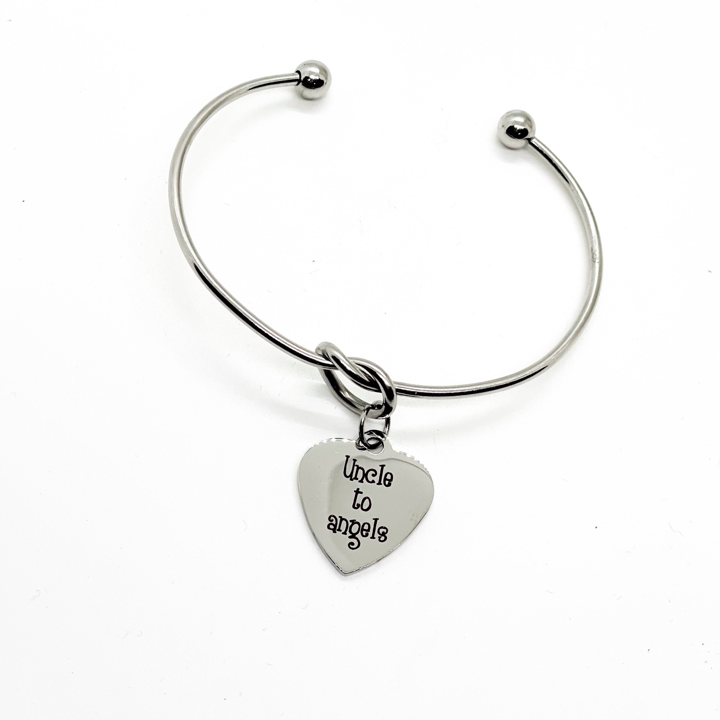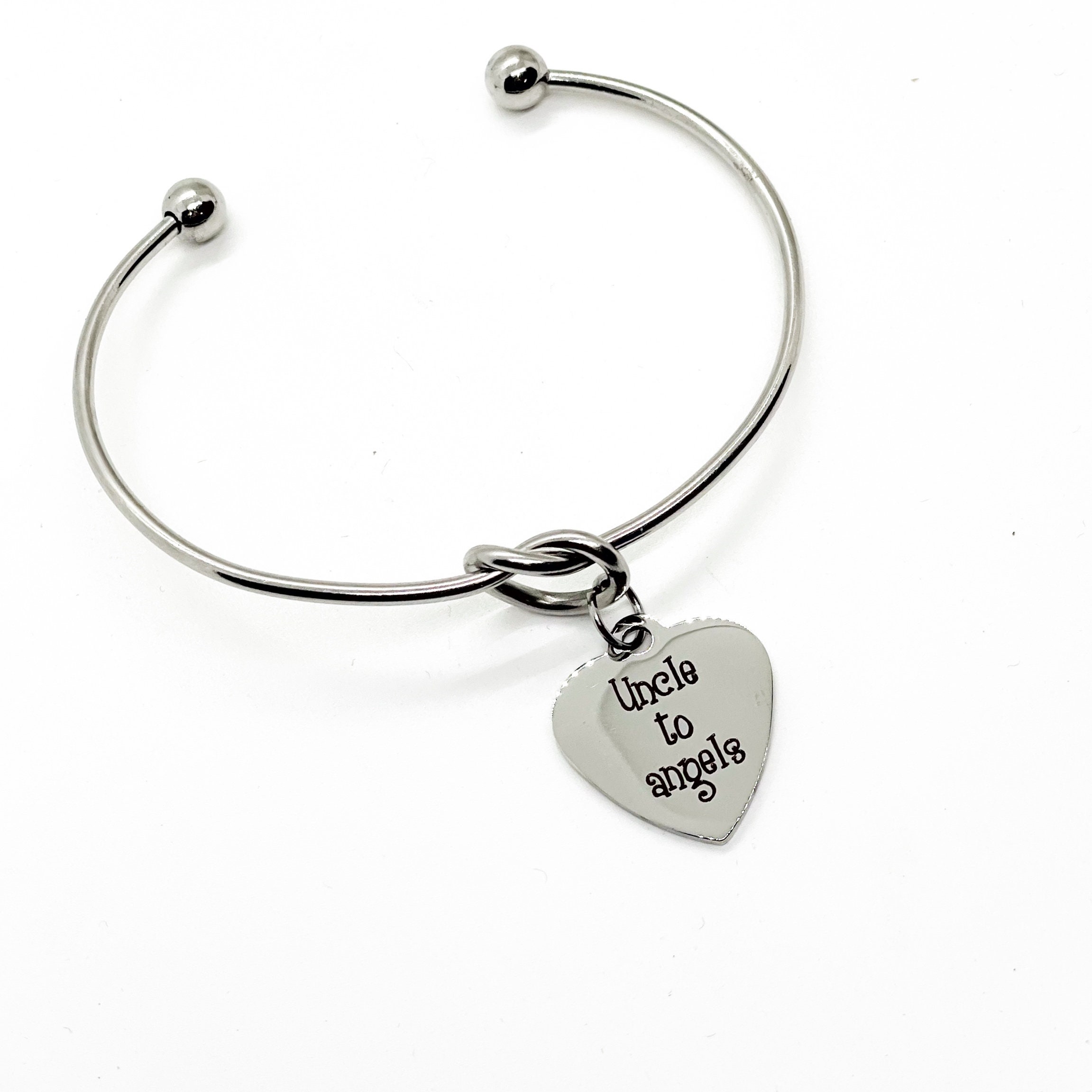 This is a beautiful knotted stainless steel cuff bracelet with an engraved charm with “Uncle to Angels” on it.