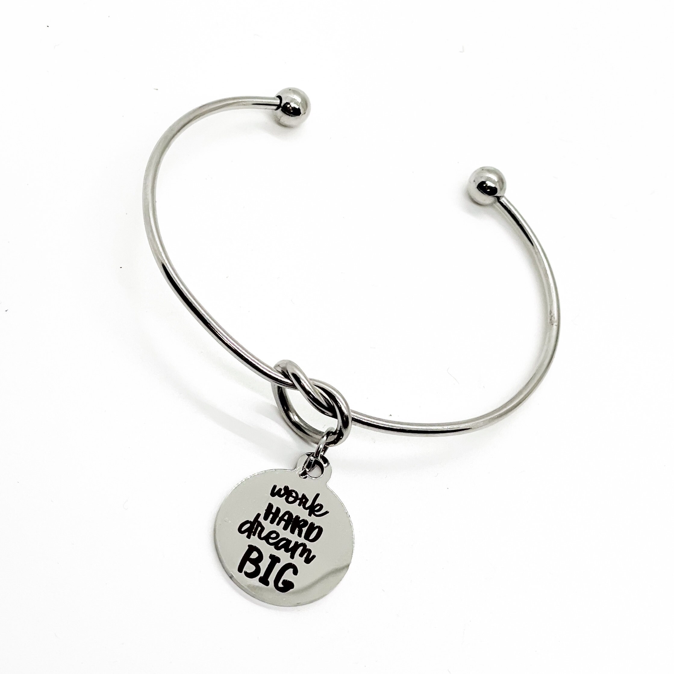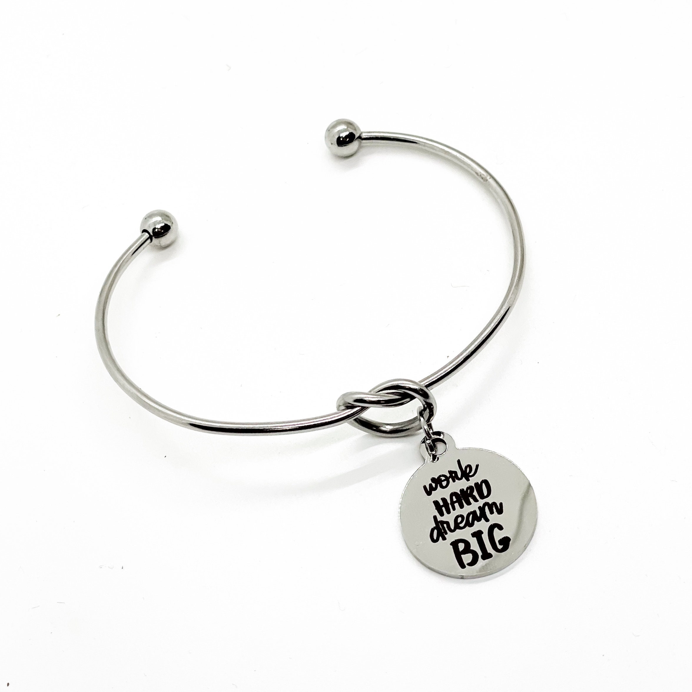 This is a beautiful knotted stainless steel cuff bracelet with an engraved charm with “Work hard Dream Big” on it.