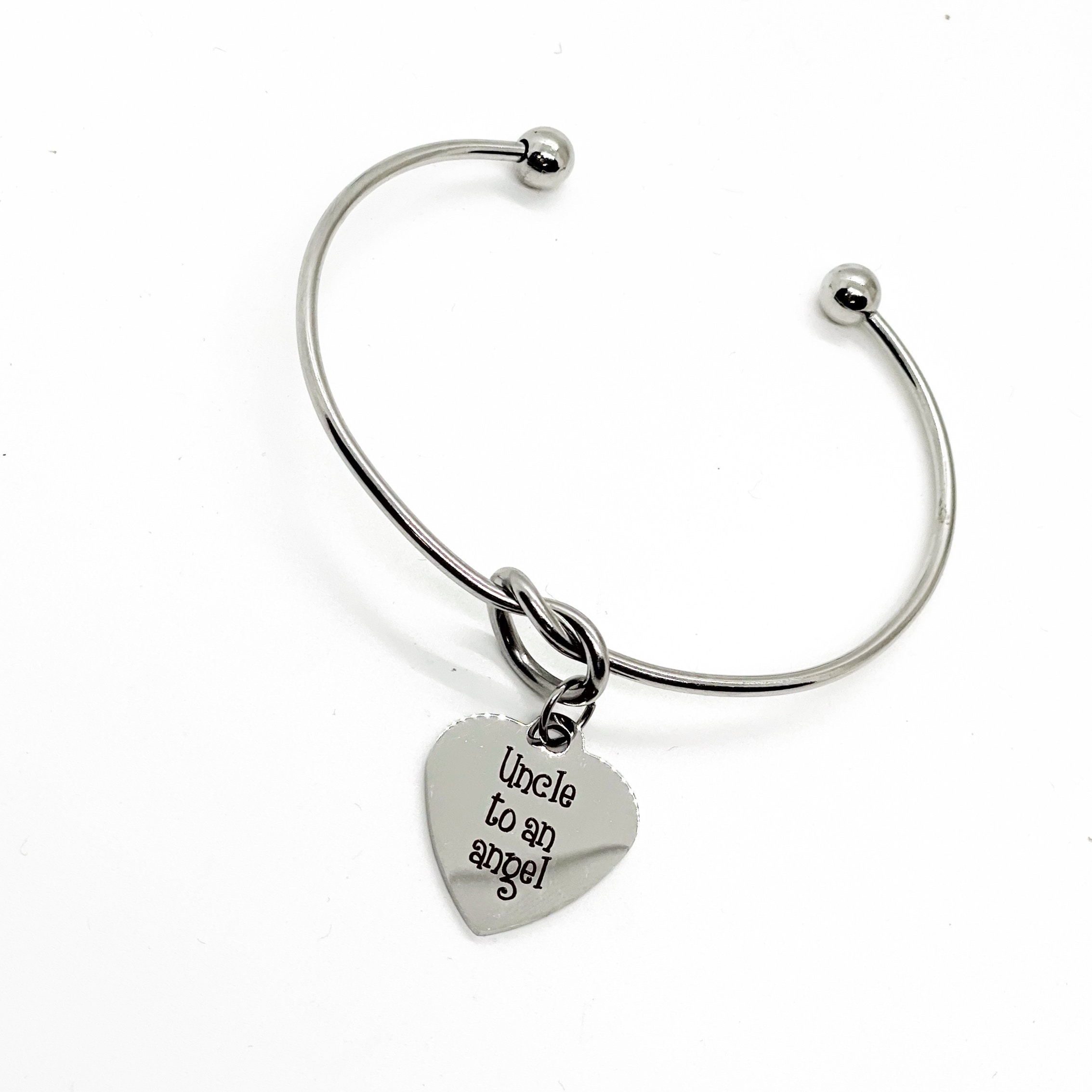 This is a beautiful knotted stainless steel cuff bracelet with an engraved charm with “Uncle to an Angel” on it.
