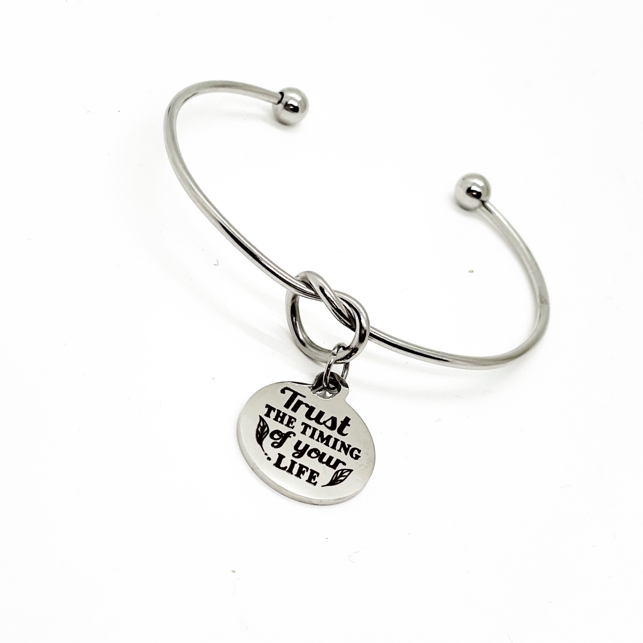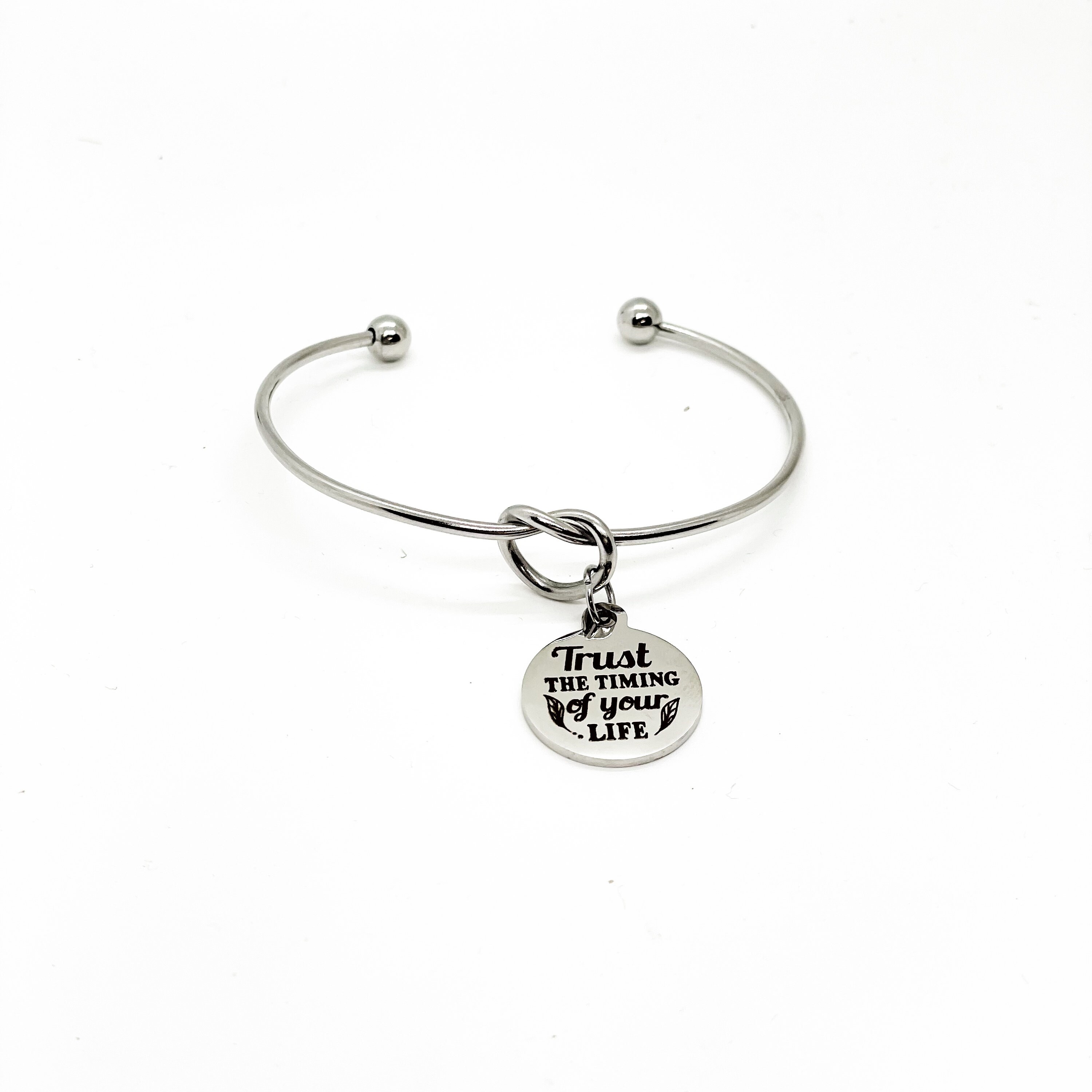 This is a beautiful knotted stainless steel cuff bracelet with an engraved charm with “Trust the timing of your life” on it.