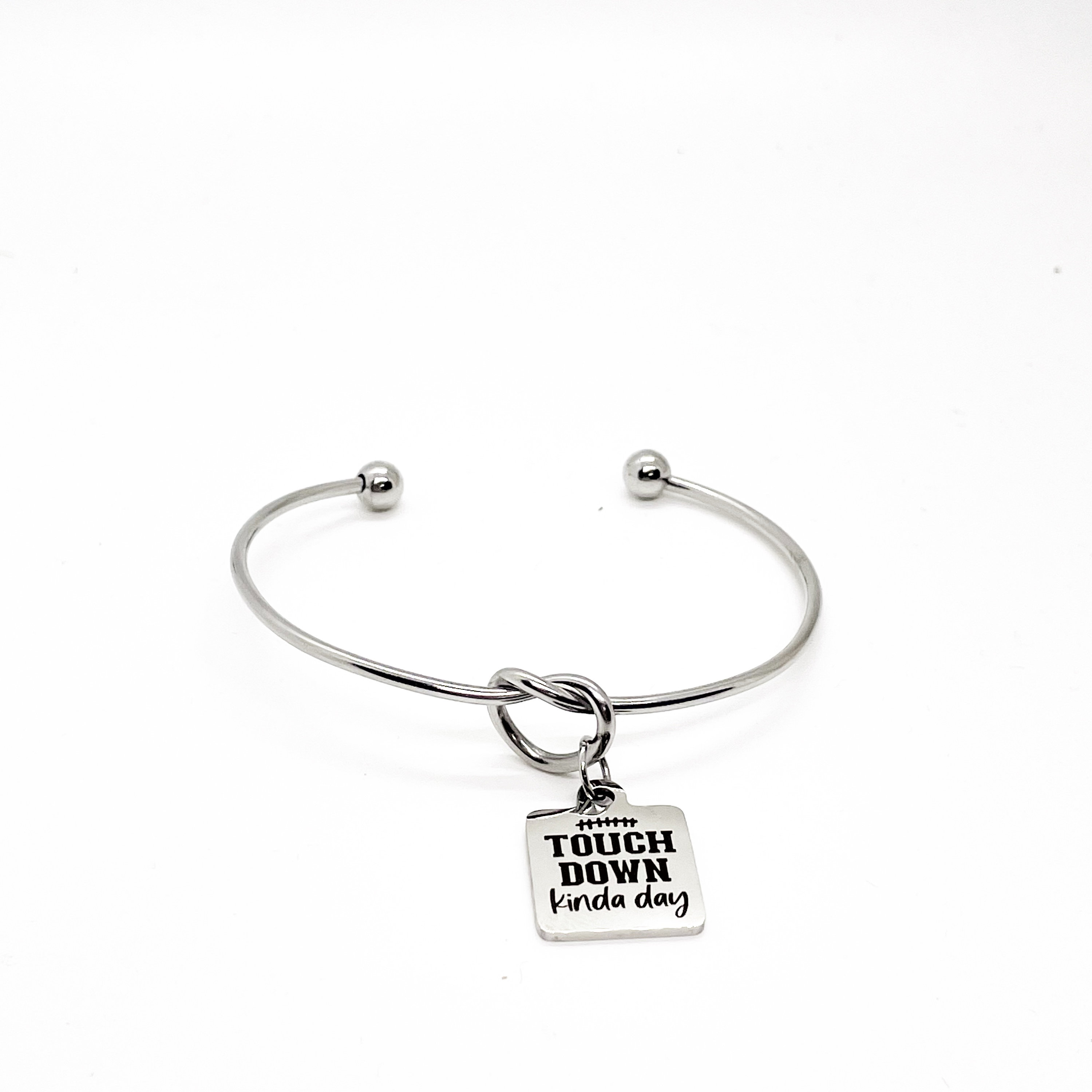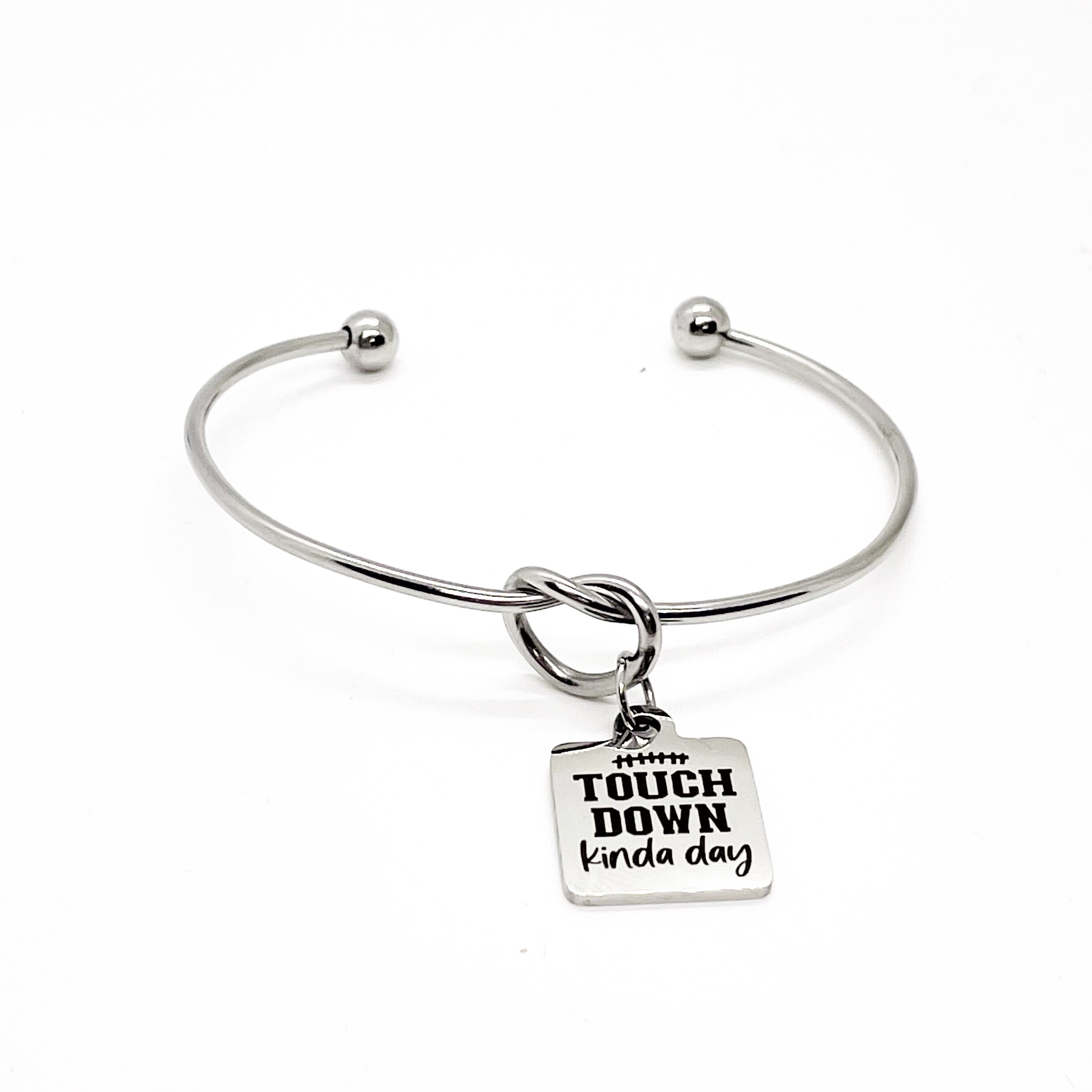 This is a beautiful knotted stainless steel cuff bracelet with an engraved charm with “Touchdown kinda day” on it.