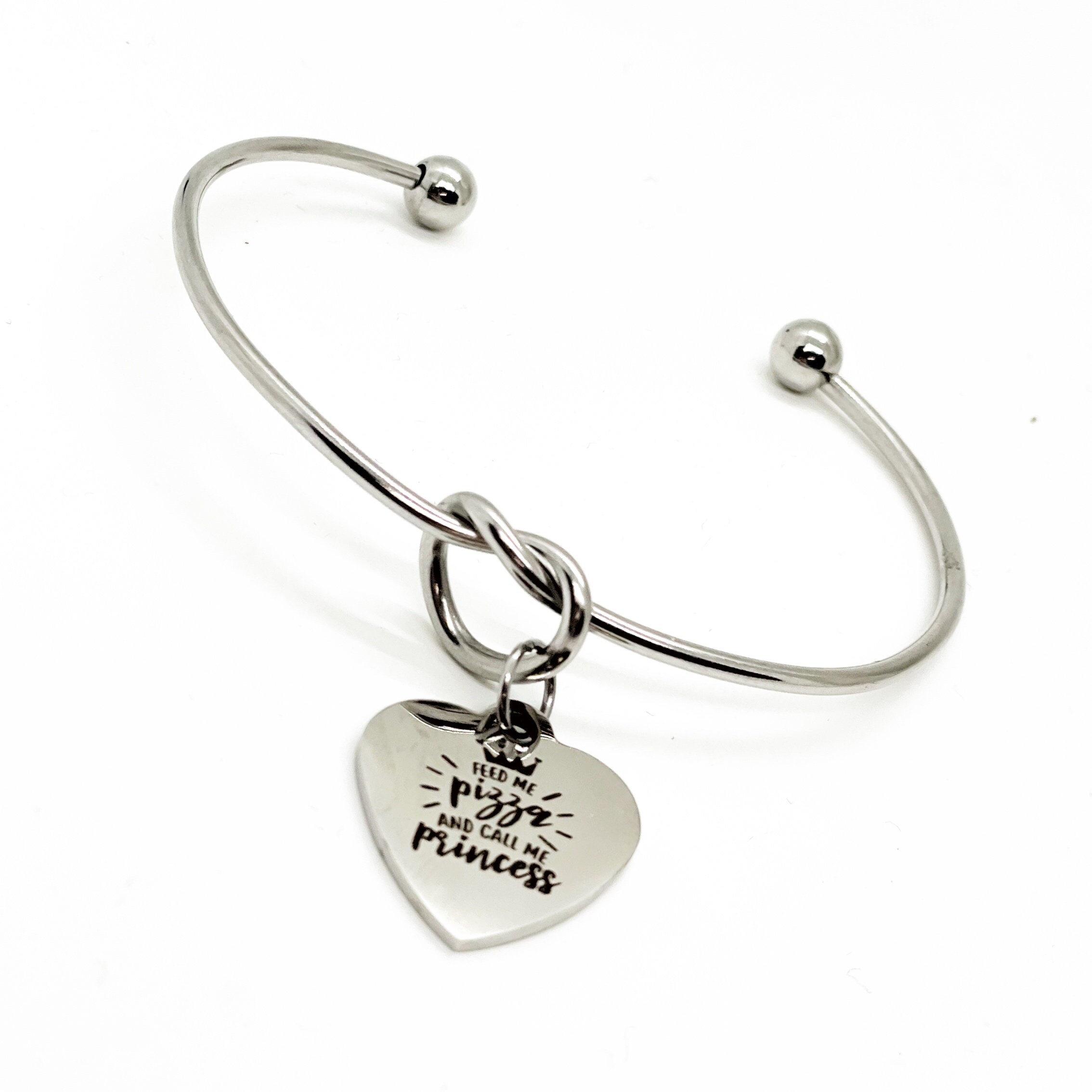 This is a beautiful knotted stainless steel cuff bracelet with an engraved charm with “Feed me pizza and call me princess” on it.