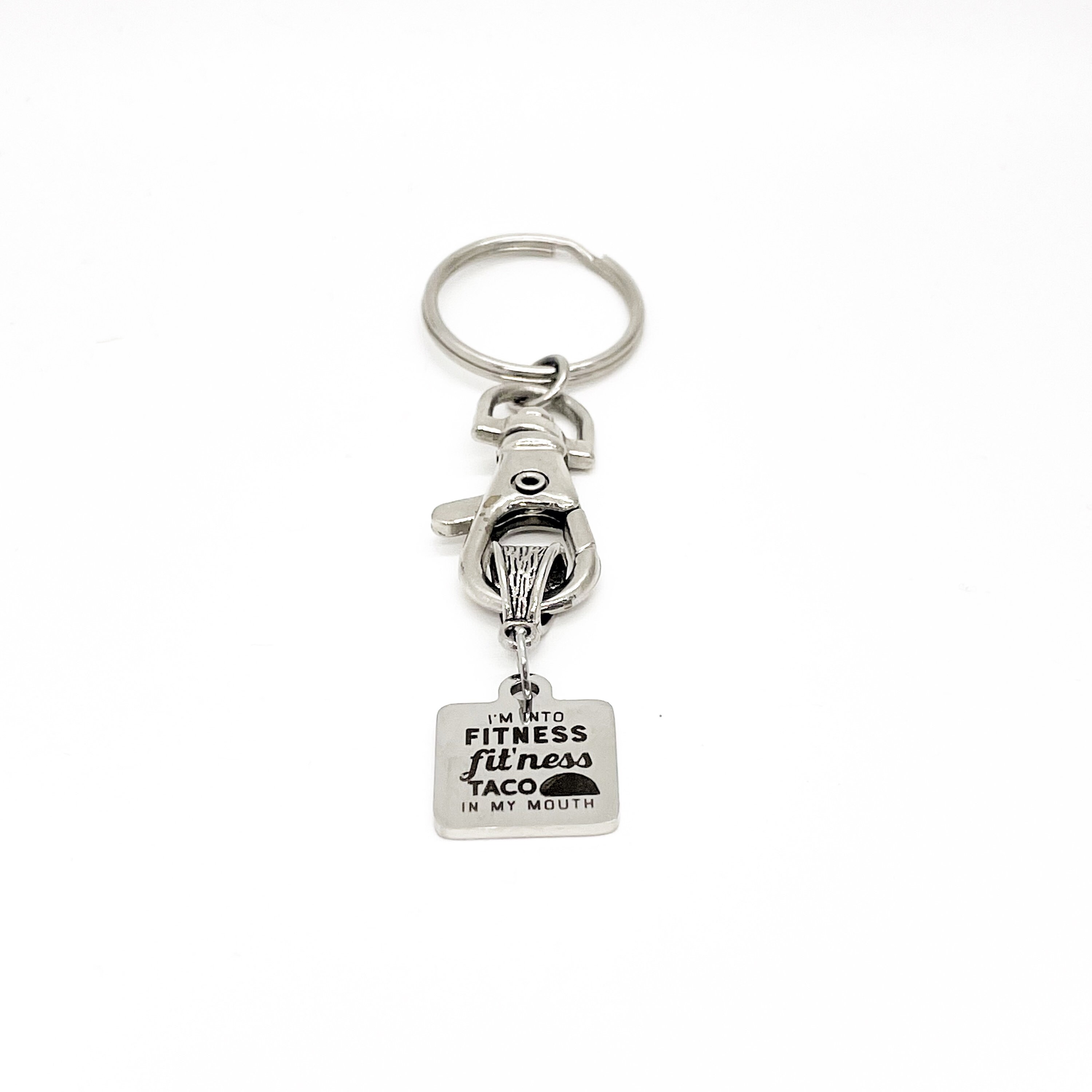 This keychain gift has a stainless steel laser engraved charm with “I’m into fitness. Fit’ness taco into my mouth” on it. The charm measures approx. 1/2 inch across.