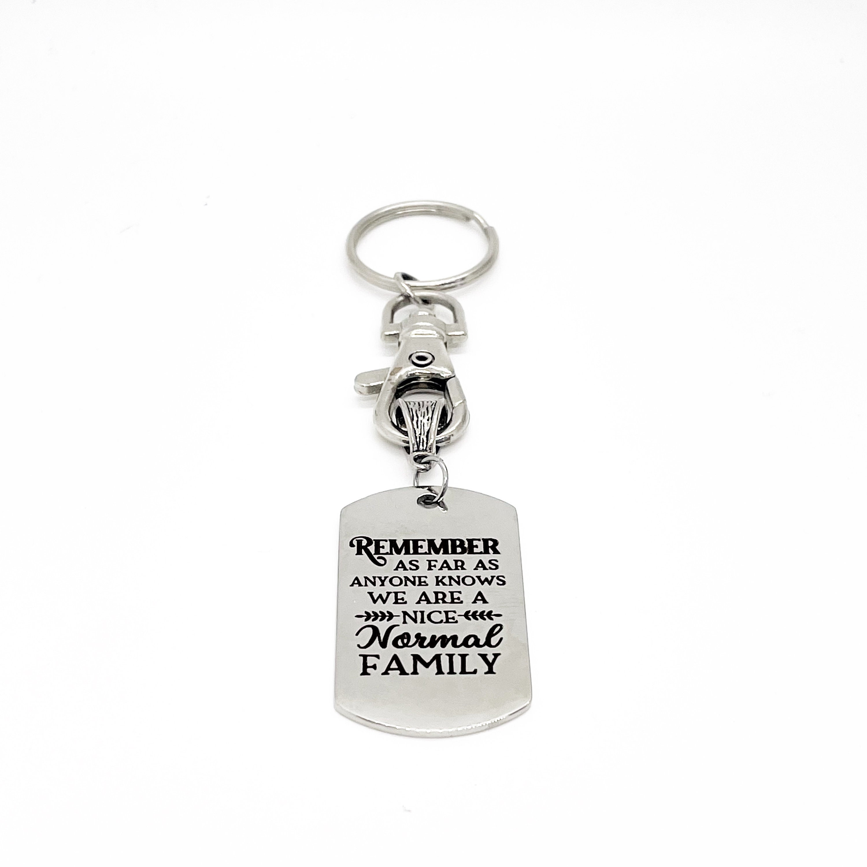 This keychain would make a great keychain gift. It has a stainless steel laser engraved charm with “Remember, as far as anyone knows, we are a nice normal family” on it.