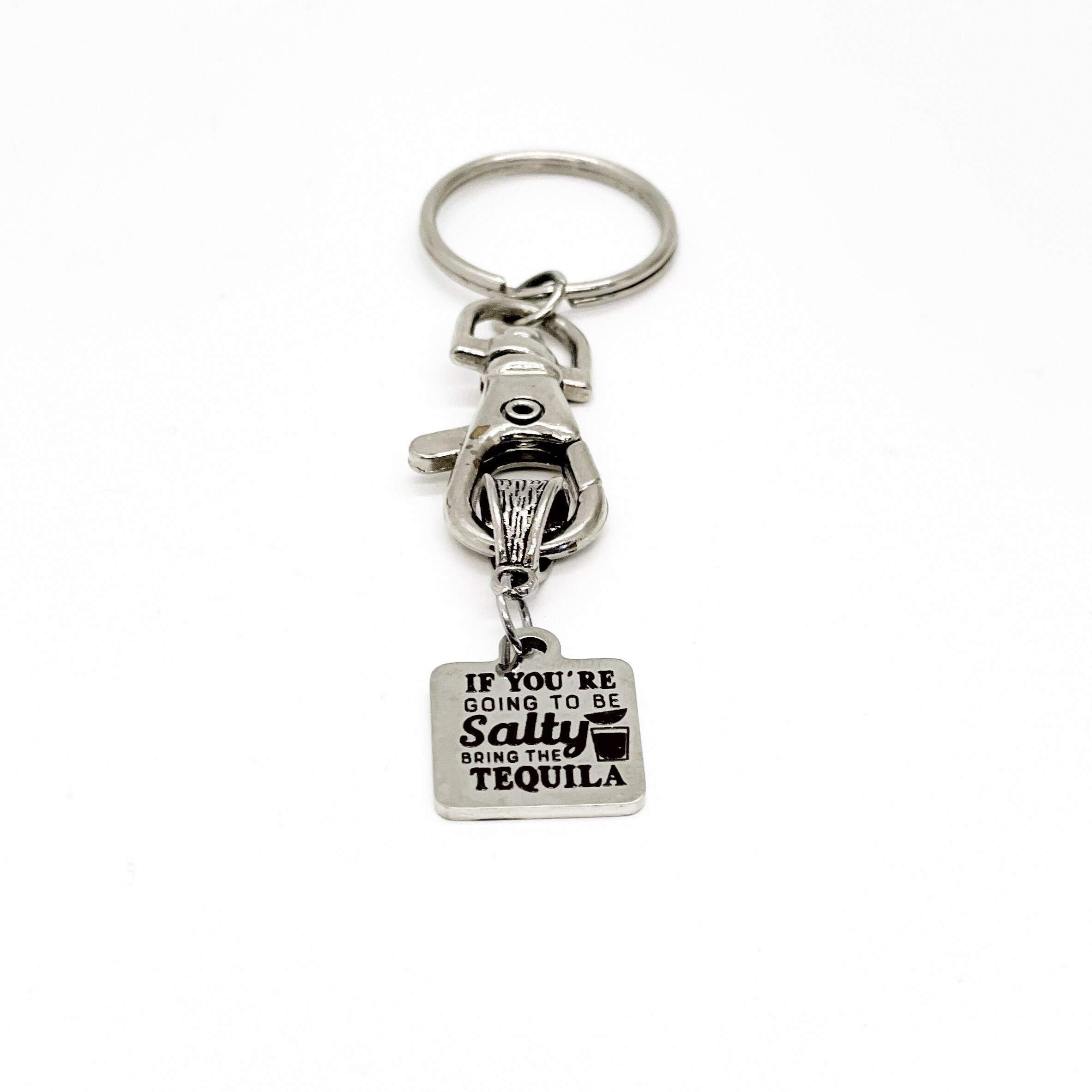 This keychain gift has a stainless steel laser engraved charm with “If you’re going to be salty, bring the tequila” on it. The charm measures approx. 1/2 inch across.