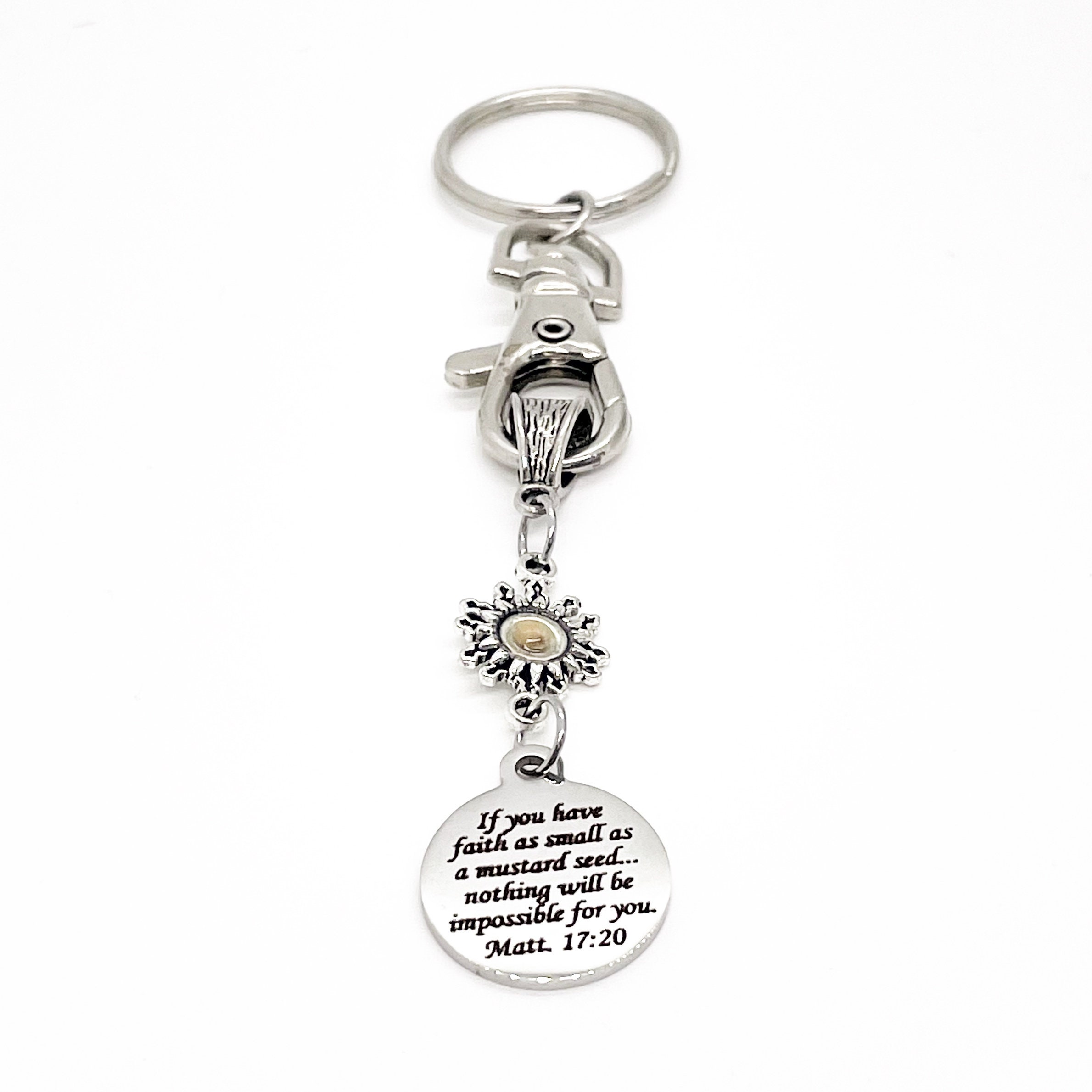This mustard seed keychain with a mustard seed charm along with a laser engraved charm with the scripture of Matthew 17 20 that tells us that with the faith of a mustard seed, we can move mountains.