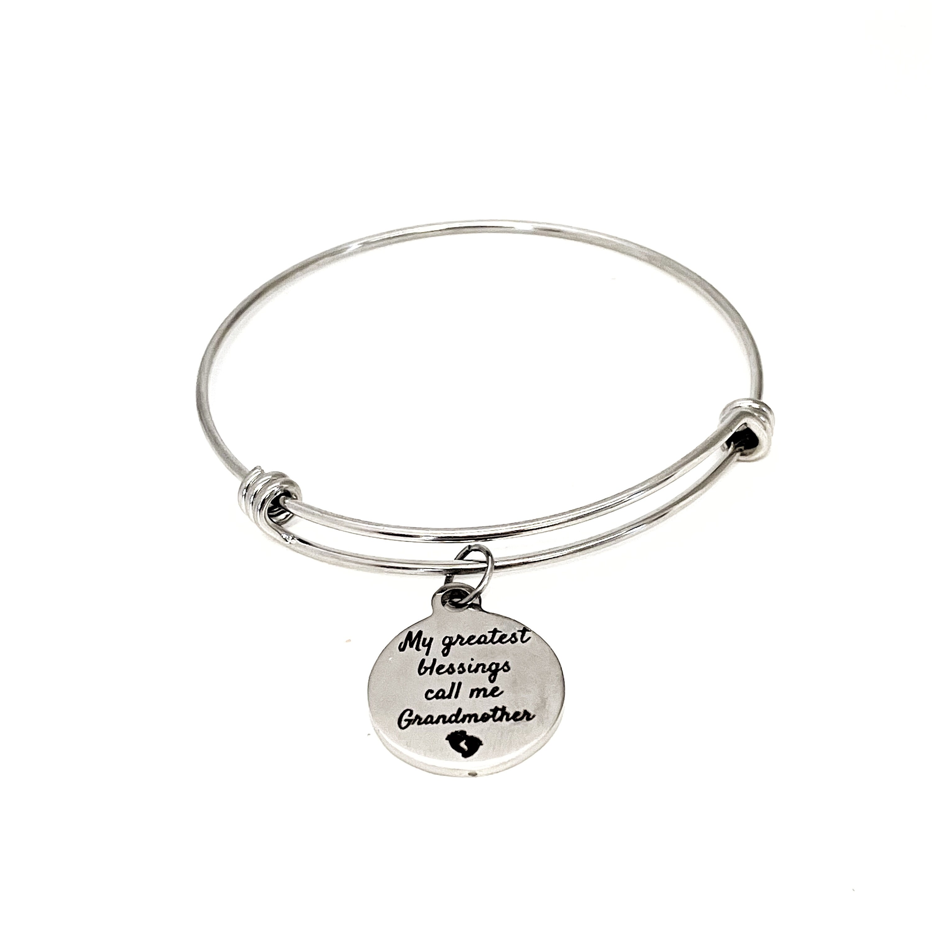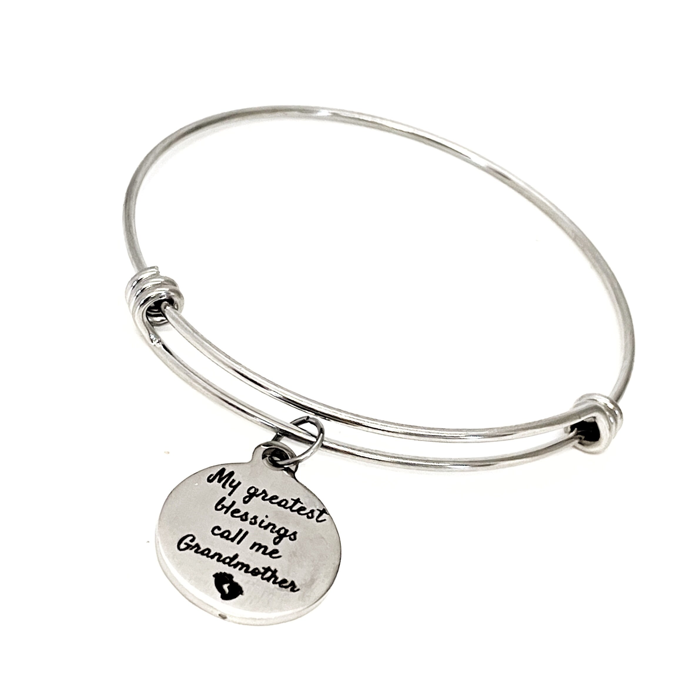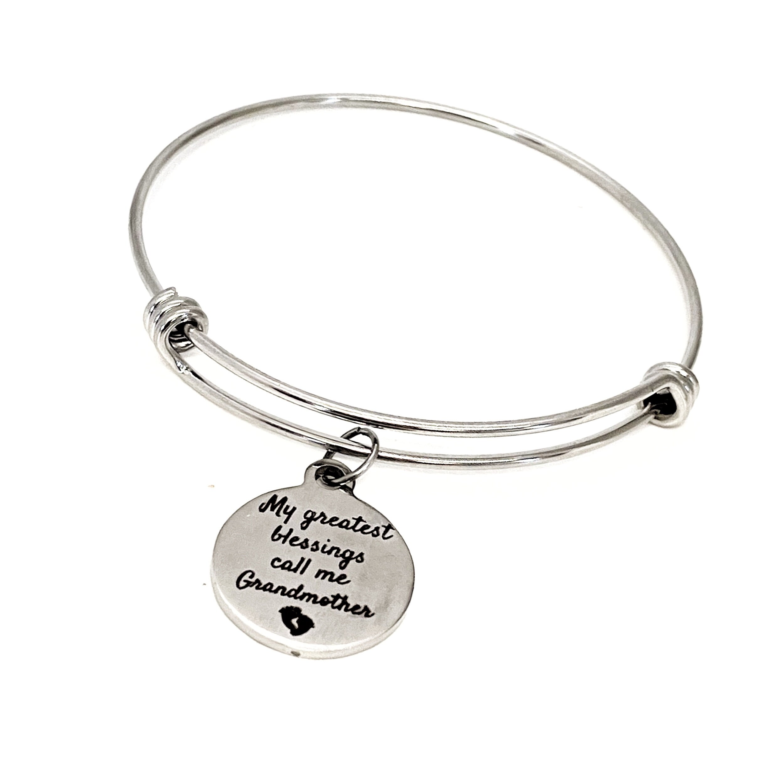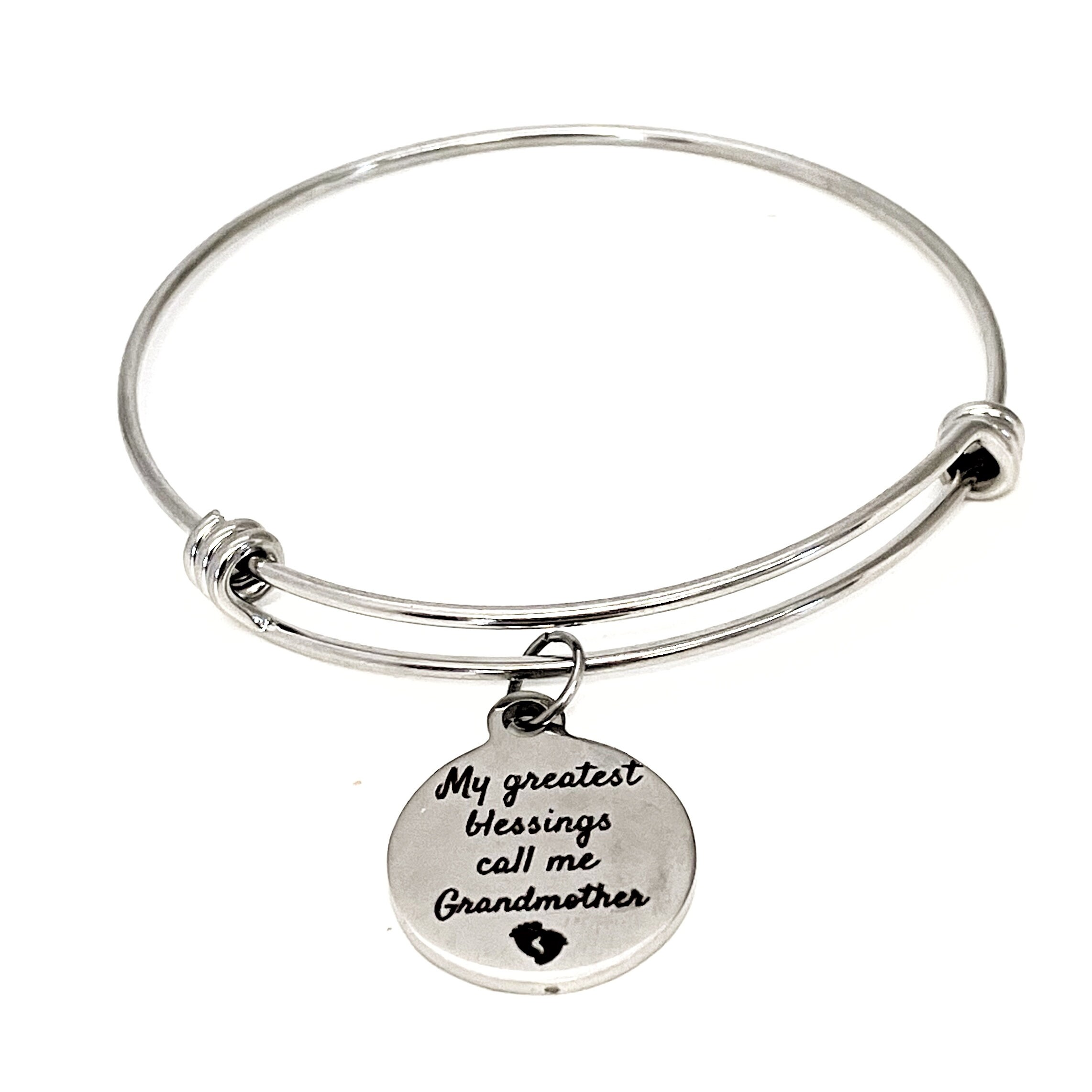 This is a beautiful stainless steel bracelet with a laser engraved charm that has "My greatest blessings call me Grandmother" on it.