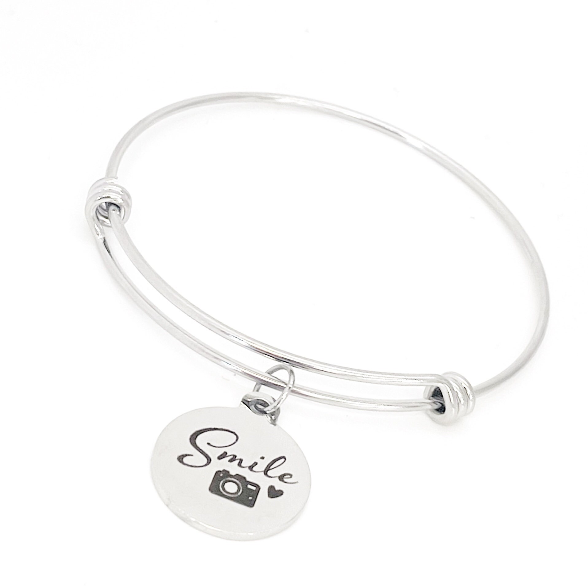 This is a beautiful stainless steel bracelet with a laser engraved charm that has "Smile" with a camera on it. The charm measures approx. 3/4 inch across