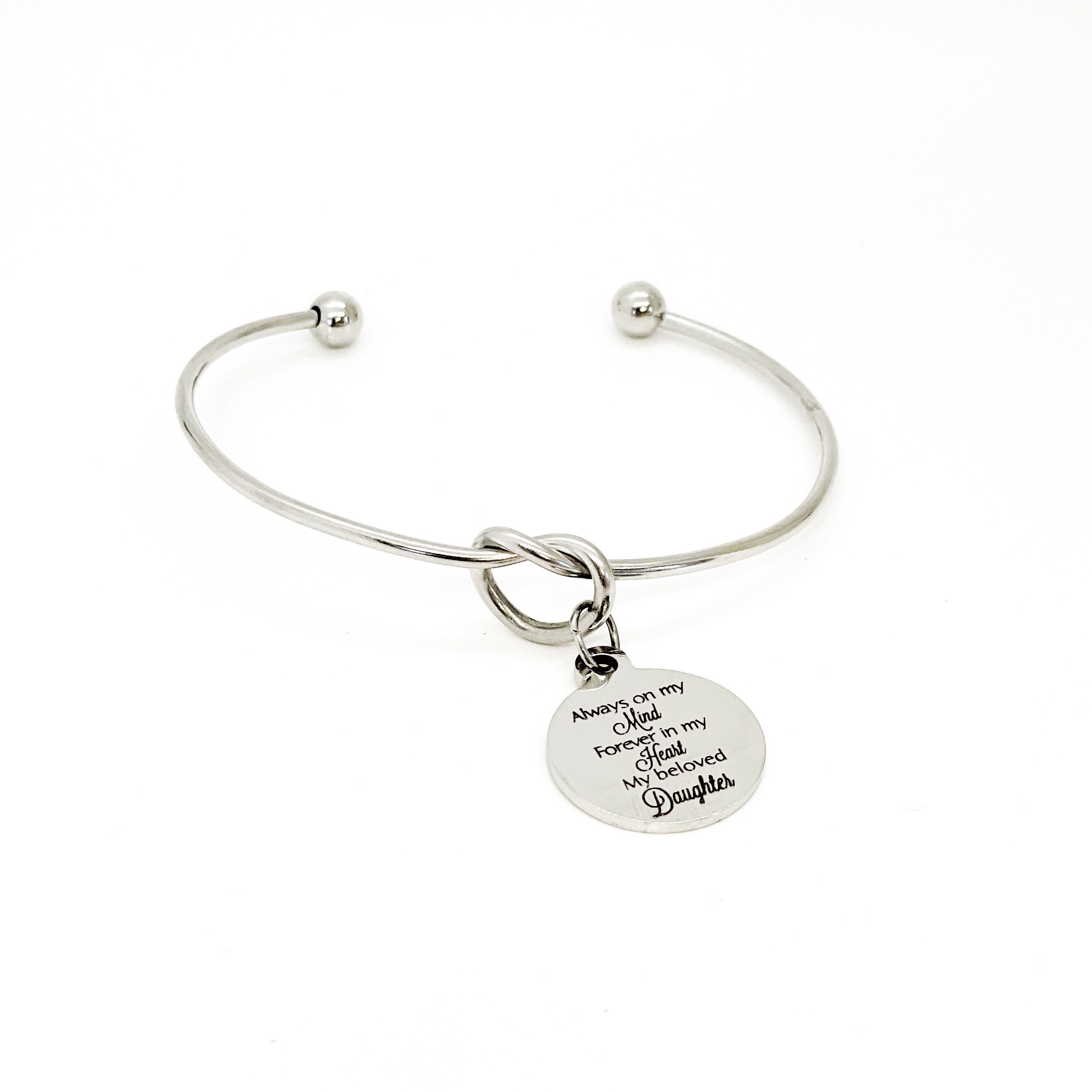This is a beautiful knotted stainless steel cuff bracelet with an engraved charm with “Always on my mind, forever in my heart, my beloved daughter” on it. The charm measures approx. 3/4 inch.