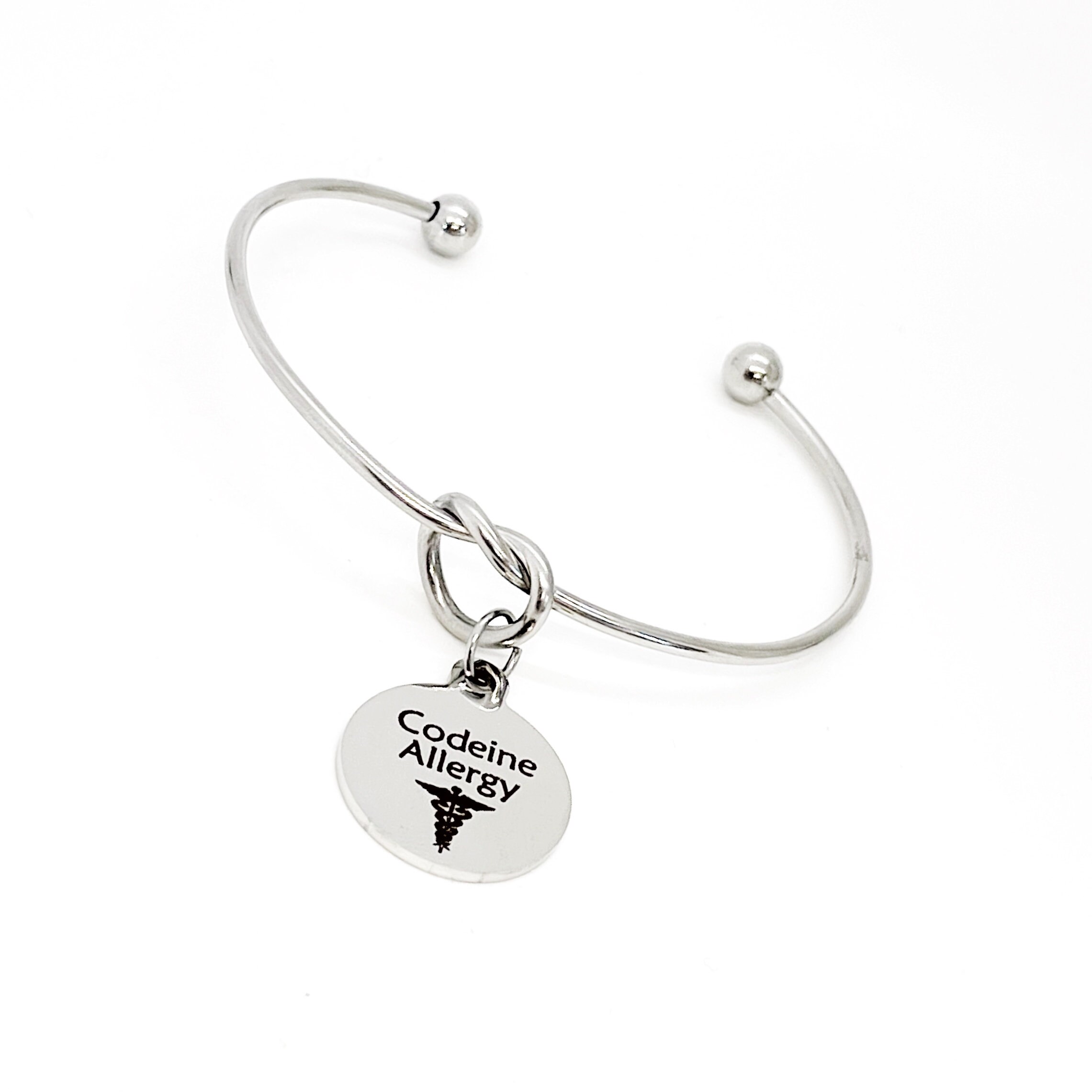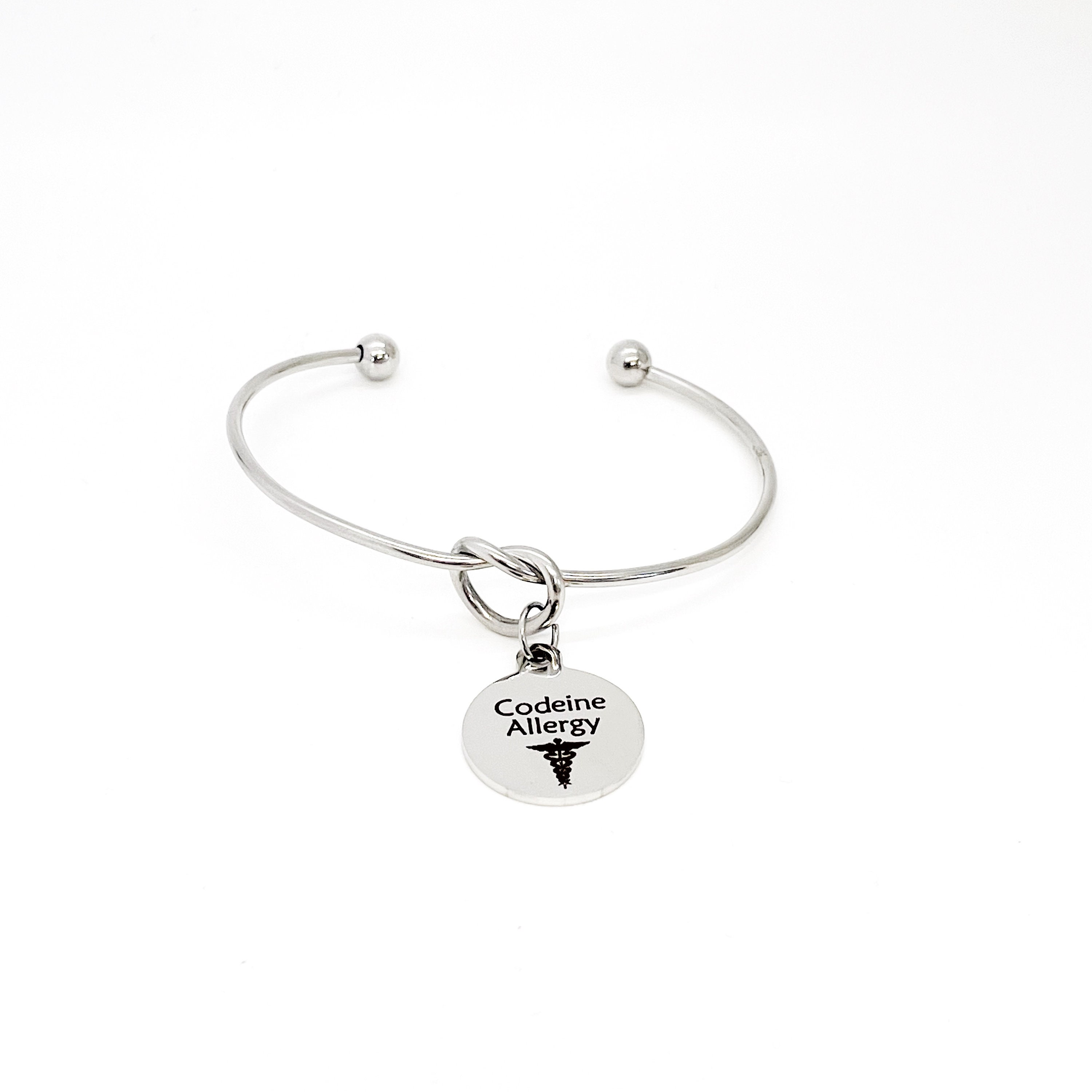 This is a beautiful knotted stainless steel cuff bracelet with an engraved charm with “Codine Allergy” with a medical caduceus on it. The charm measures approx. 3/4 inch.
