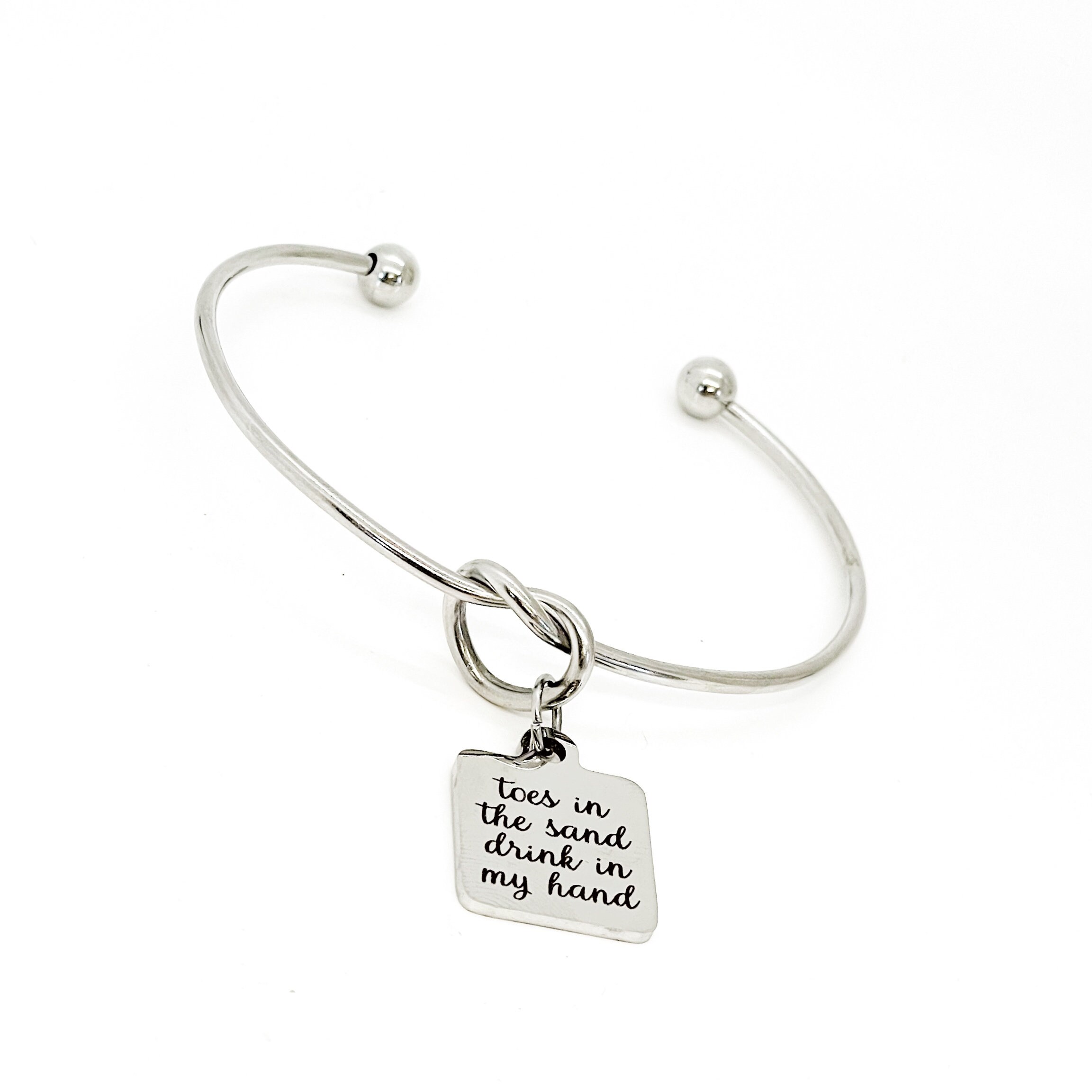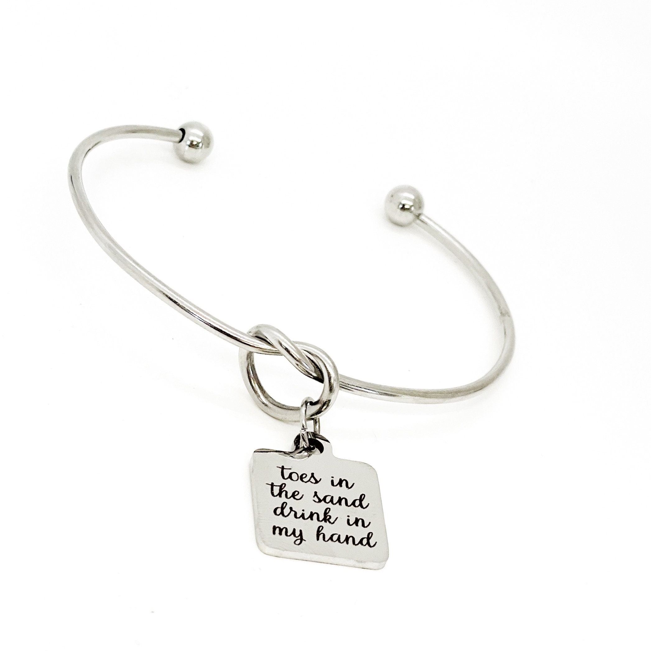 This is a beautiful knotted stainless steel cuff bracelet with an engraved charm with “Toes in the sand drink in my hand” on it. The charm measures approx. 1/2 inch.