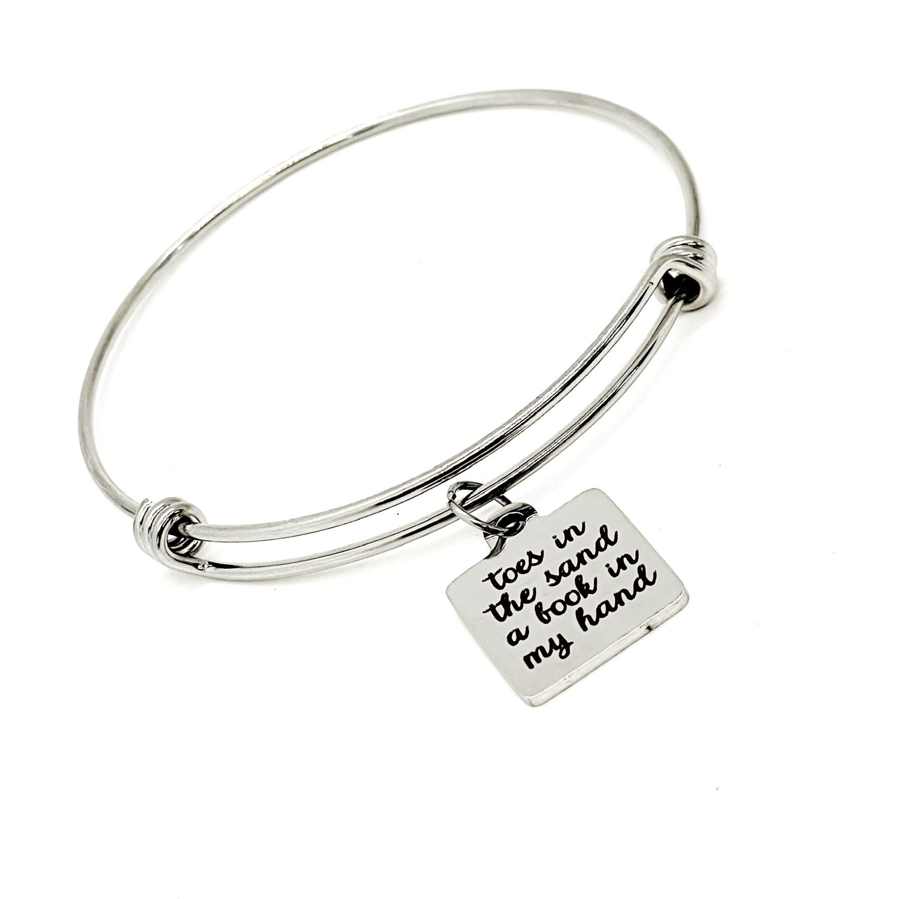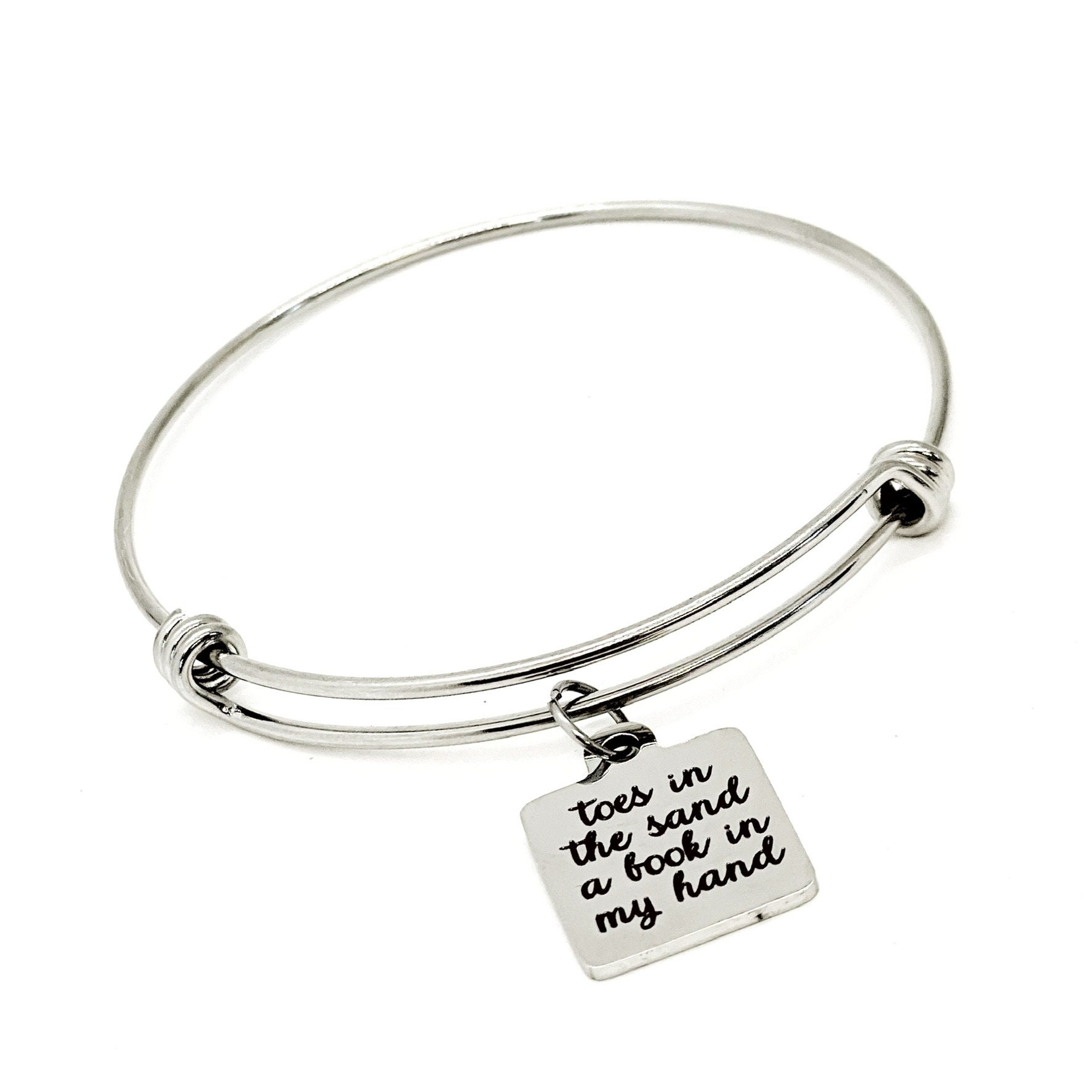 This is a beautiful beach trip gift bangle bracelet with a laser engraved stainless steel charm that has "Toes in the sand book in my hand" on it.