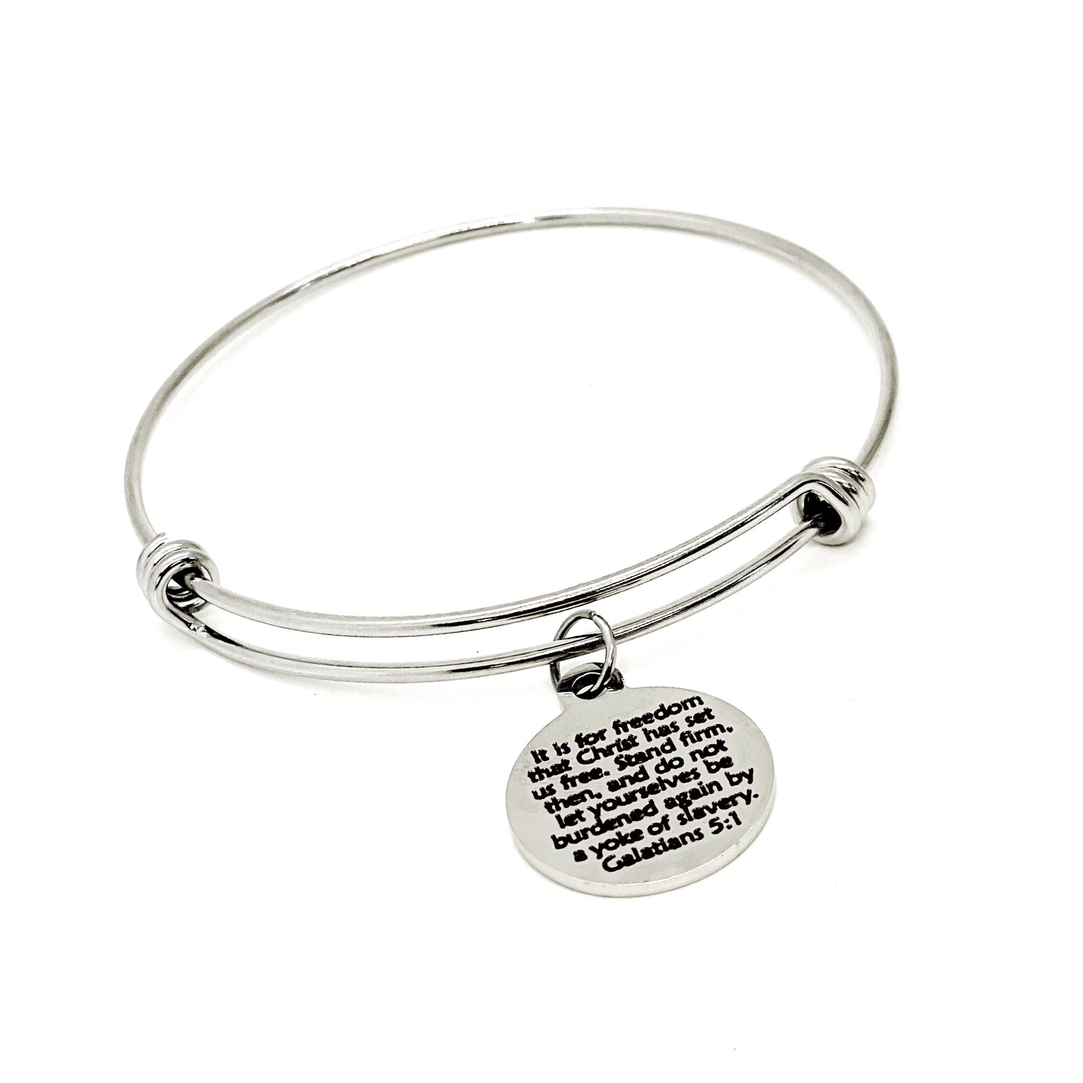 This is a beautiful faith gift bangle bracelet with a laser engraved stainless steel charm that has "It is for freedom that Christ has set us free. Stand firm, then and do not let yourselves be burdened by a yoke of slavery" from Galatians 5:1 on it.