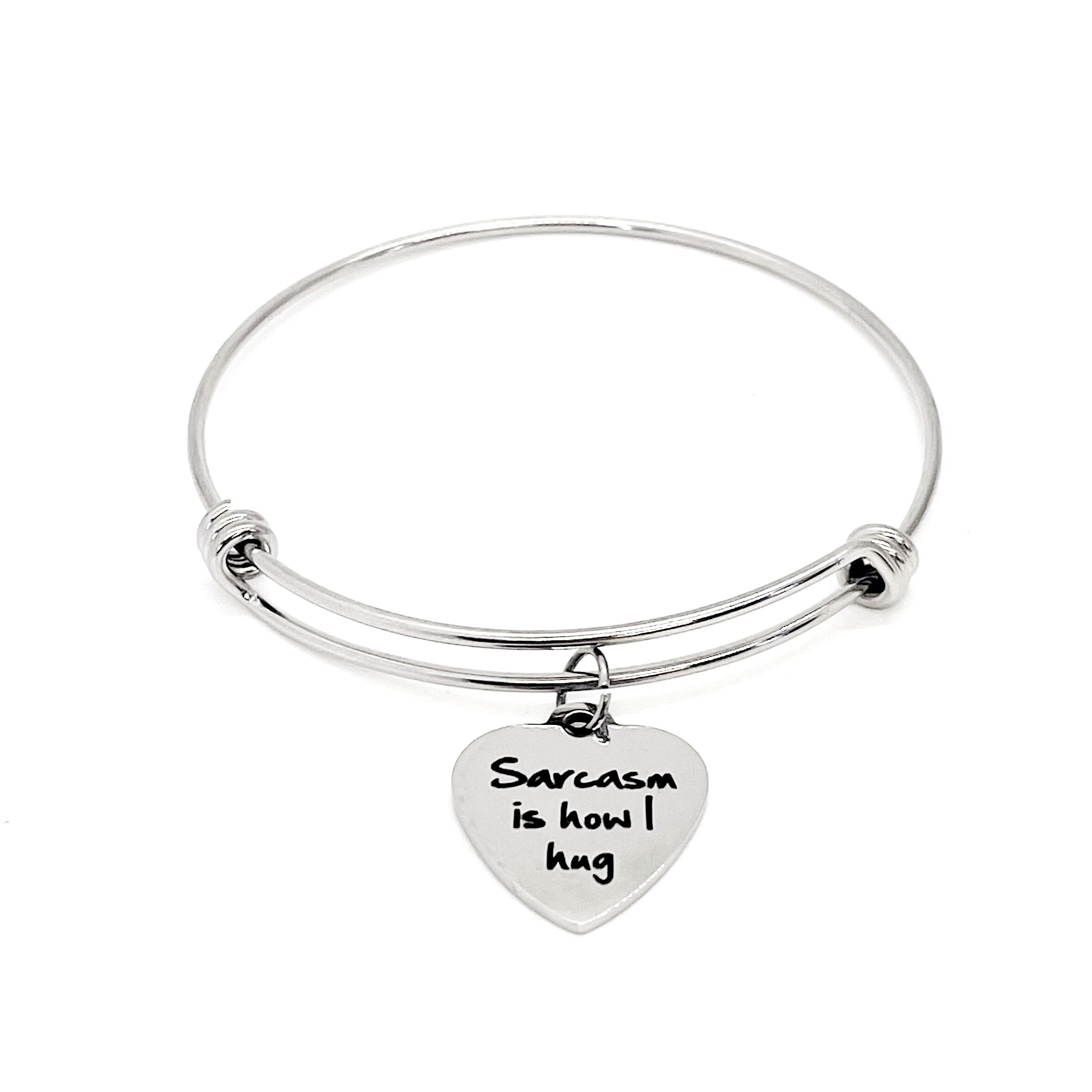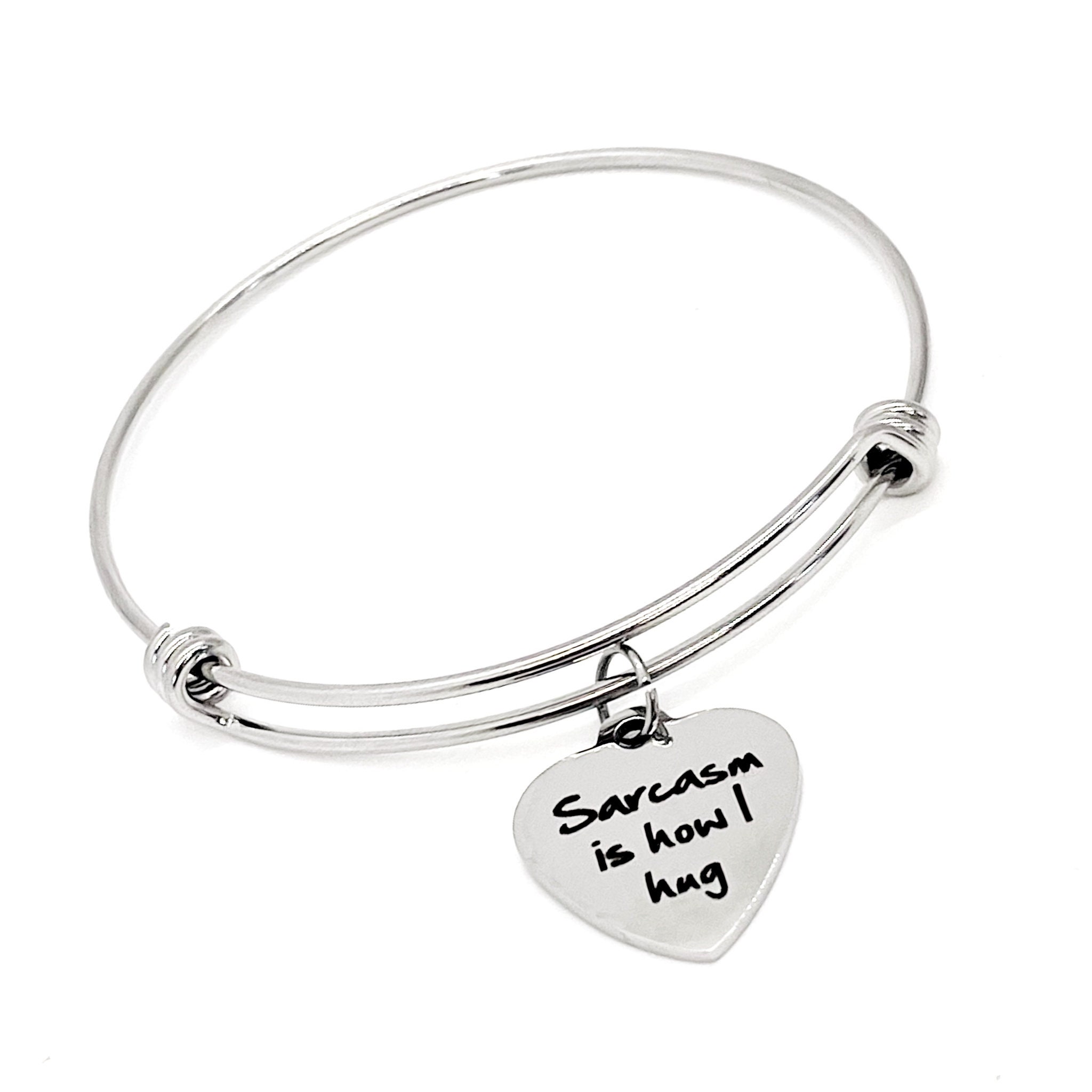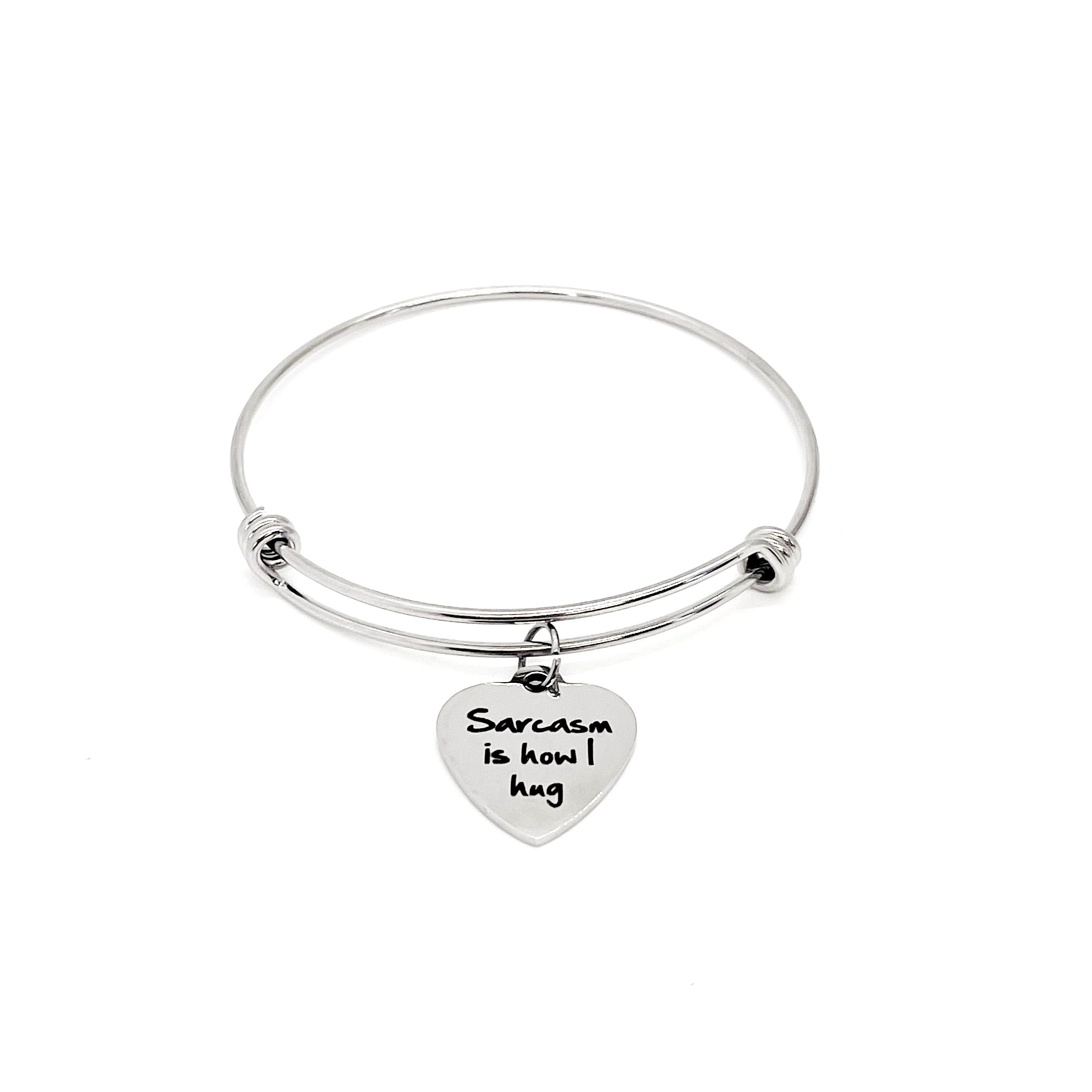 This stacking bangle bracelet would be a great sarcastic friend gift. It has a stainless steel laser engraved charm with “Sarcasm is how I hug”