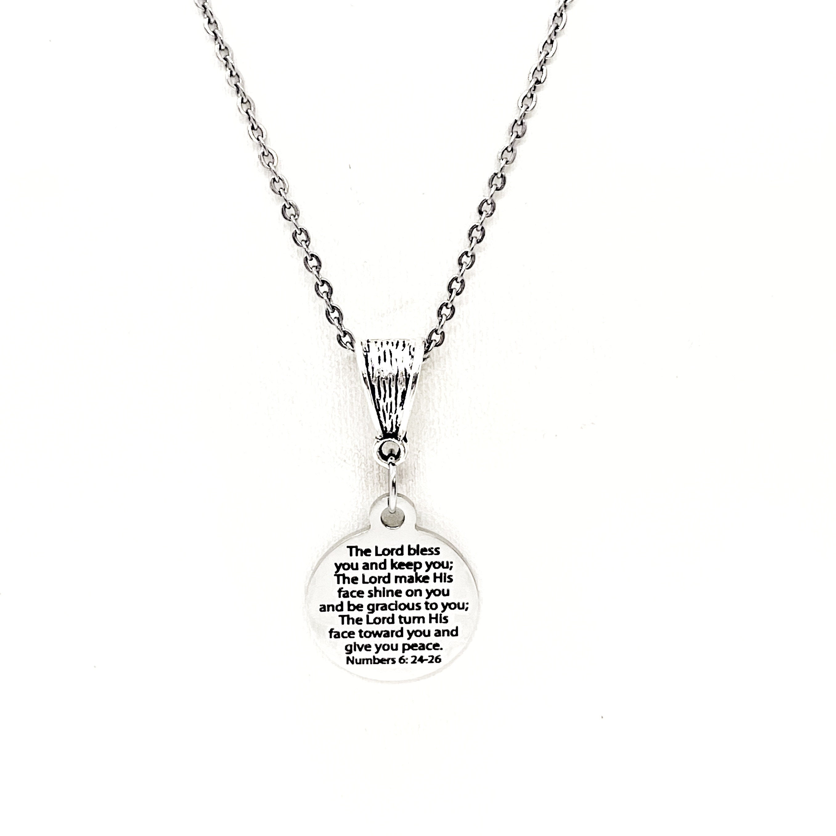This beautiful necklace would make a wonderful gift. The pendant is a stainless steel laser engraved pendant that has “The Lord bless you and keep you; The Lord make His face shine on you and be gracious to you; The Lord turn His face toward you and give you peace. Numbers 6:24-26” on it.