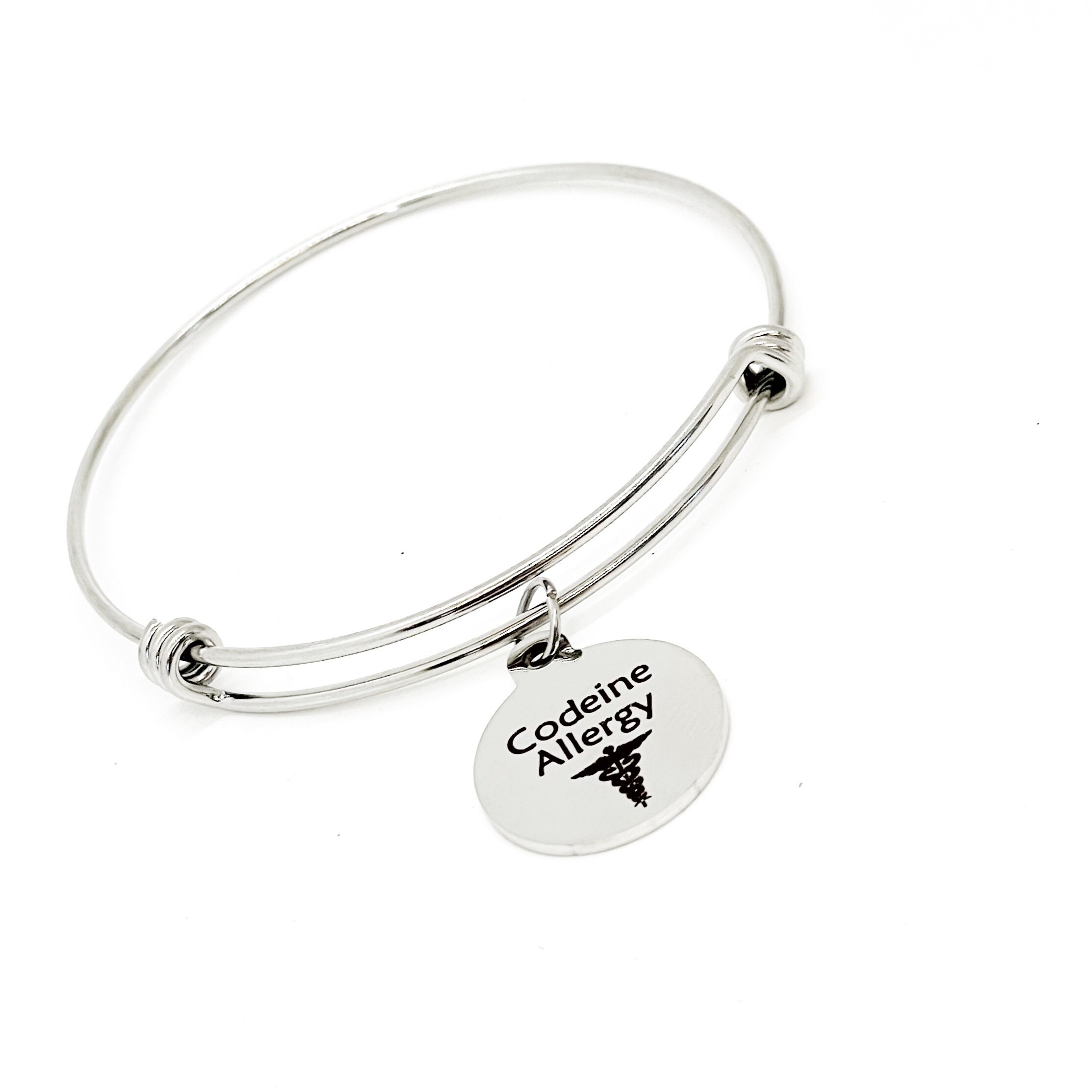 This is a beautiful bangle bracelet with a laser engraved stainless steel charm that has an “Codeine Allergy” notification on it.