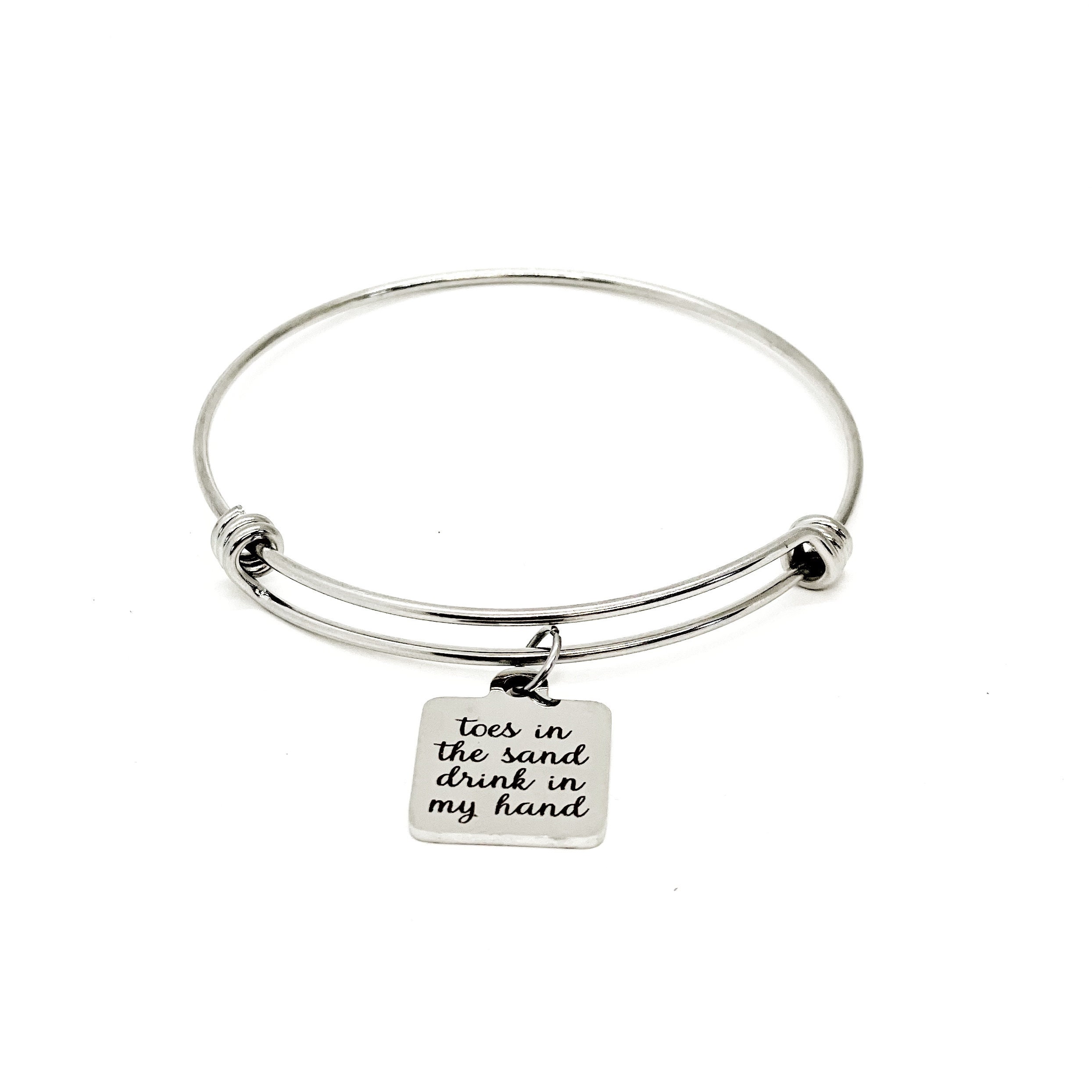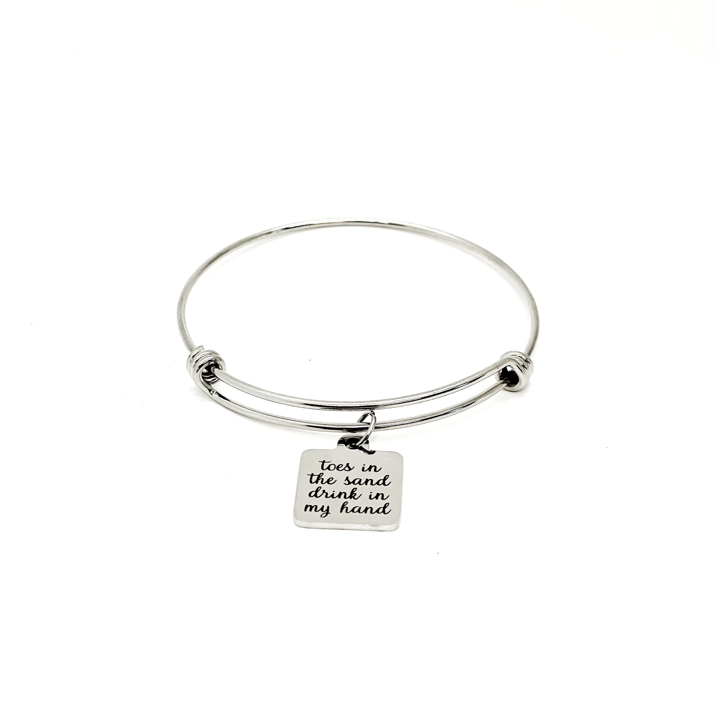 This is a beautiful beach trip gift bangle bracelet with a laser engraved stainless steel charm that has "Toes in the sand drink in my hand" on it.