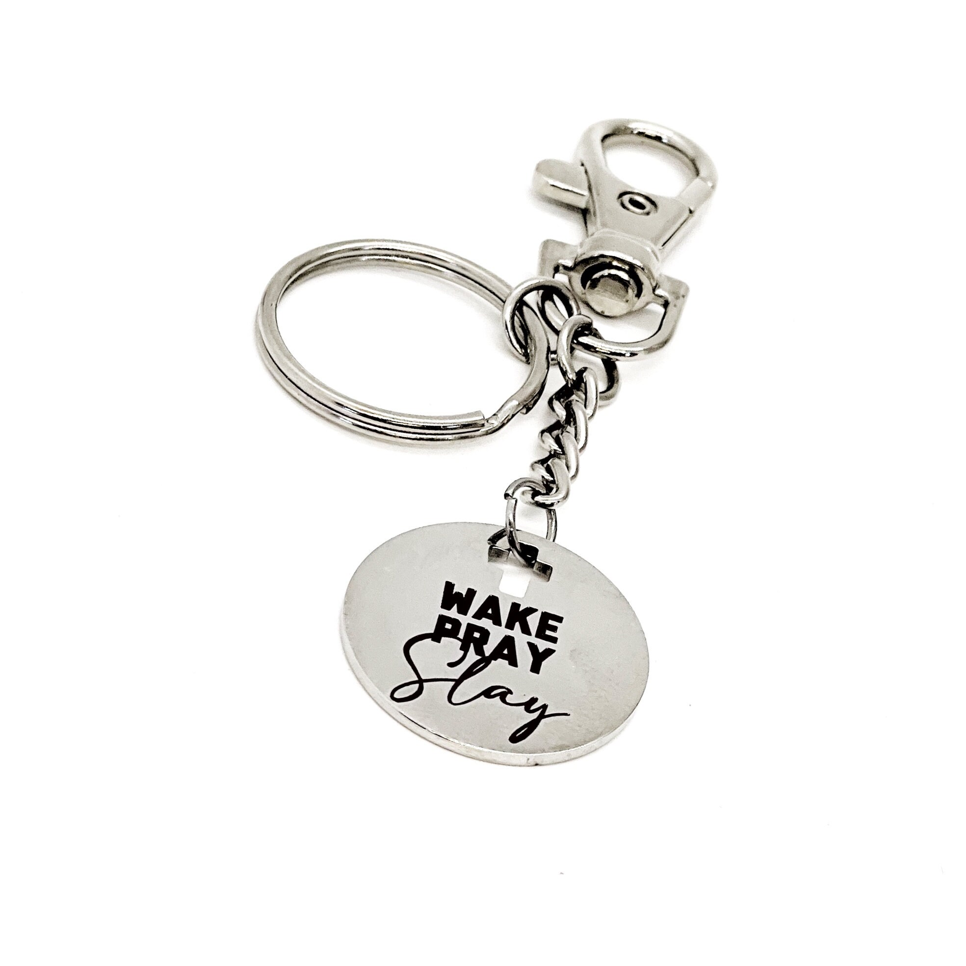 This is a great keychain to express faith. It has a stainless steel laser engraved charm with “Wake Pray Slay” on it. The keyring can be clipped onto your bag to make it easy to access without digging to the bottom of the bag. The charm measures approx. 1 inch across.
