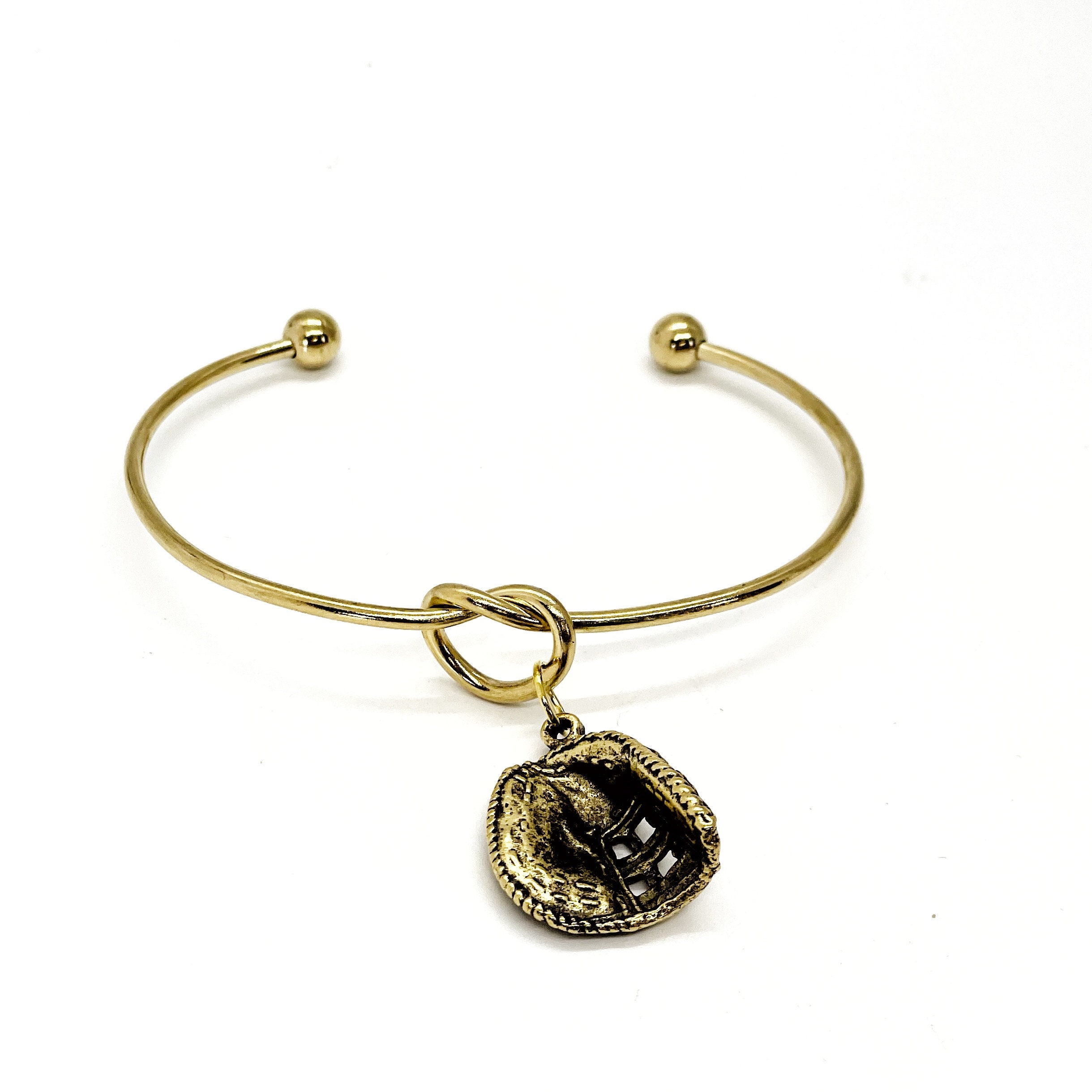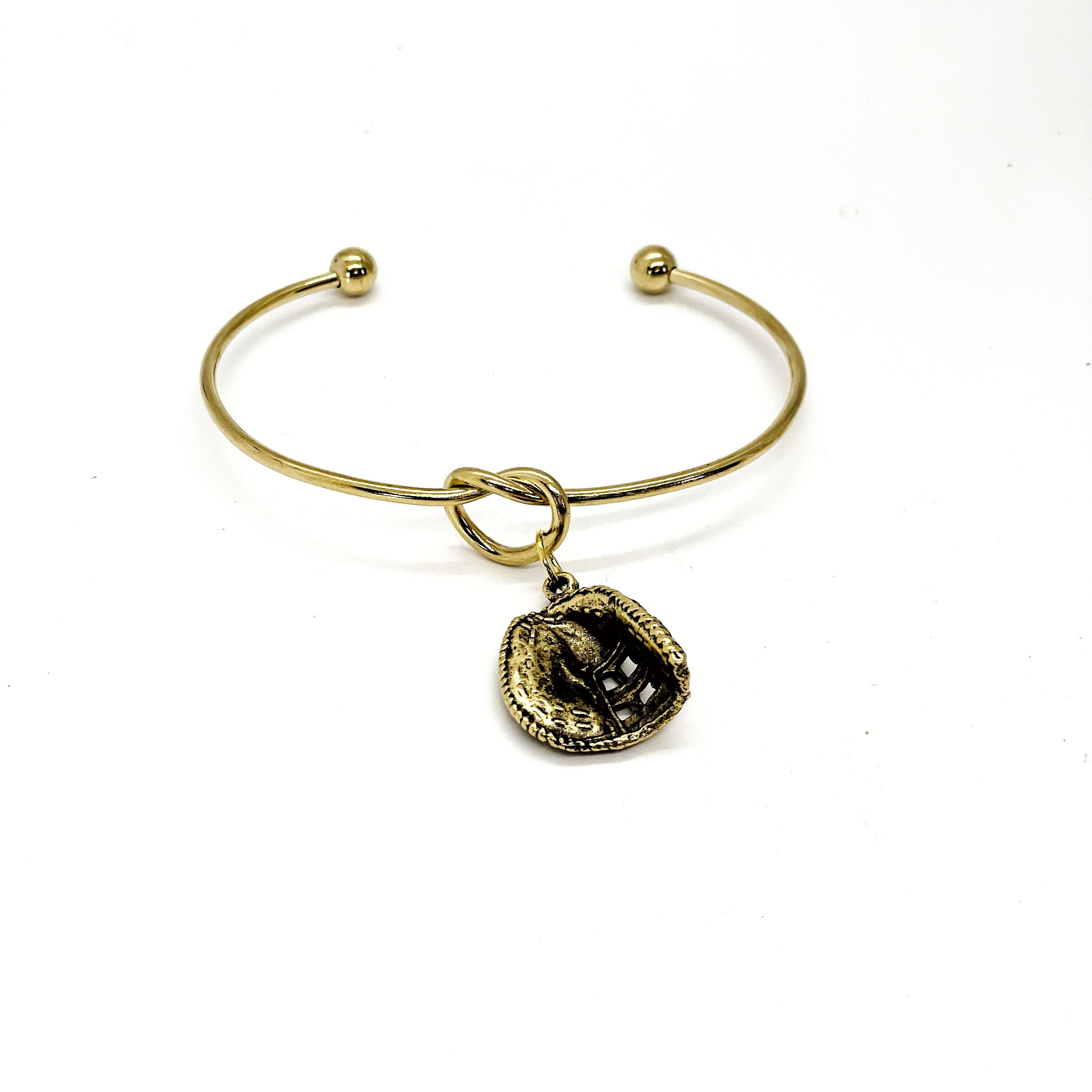 This is a beautiful knotted gold-tone cuff bracelet with a baseball or softball catcher mitt charm on it.