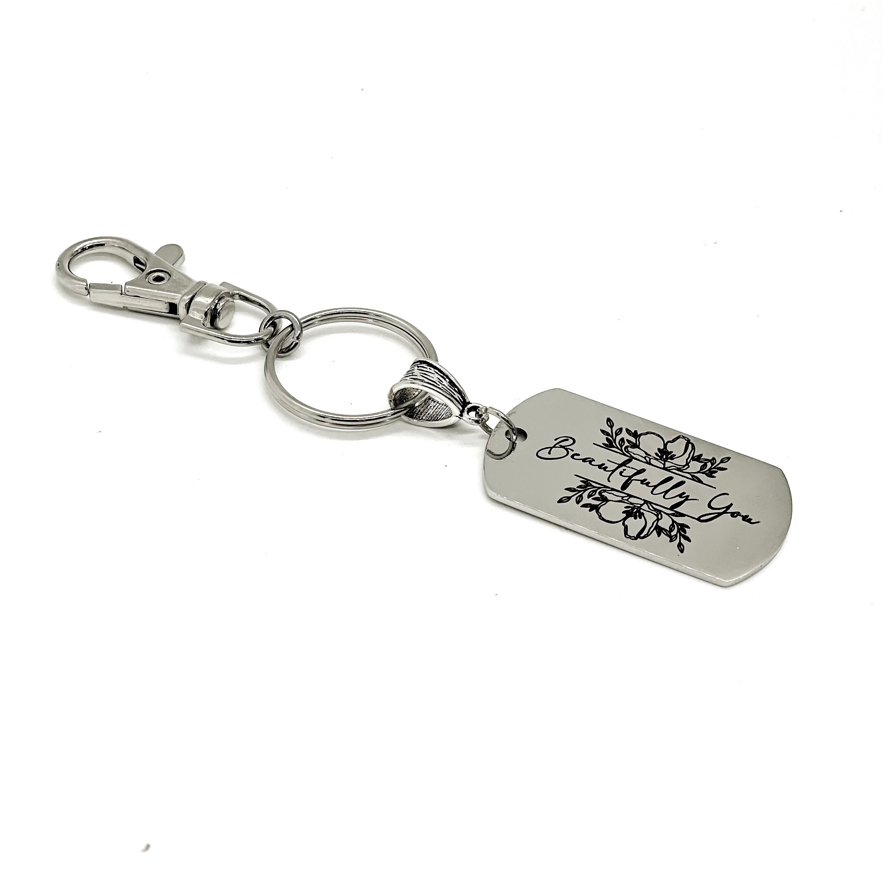 This is a great keychain gift . The keyring can be clipped onto your bag to make it easy to access without digging to the bottom of the bag. It has a stainless steel laser engraved charm with “Beautifully You" on it.