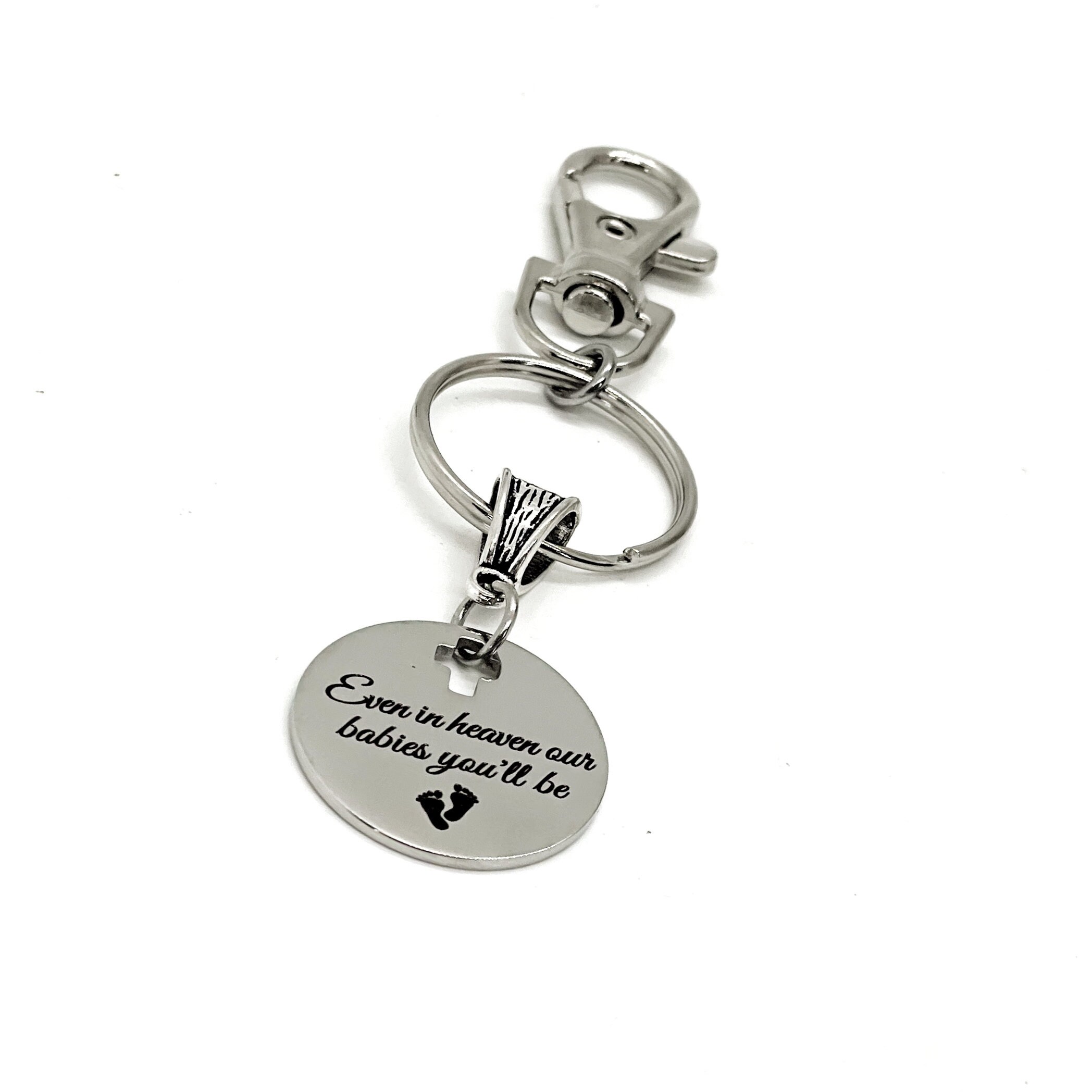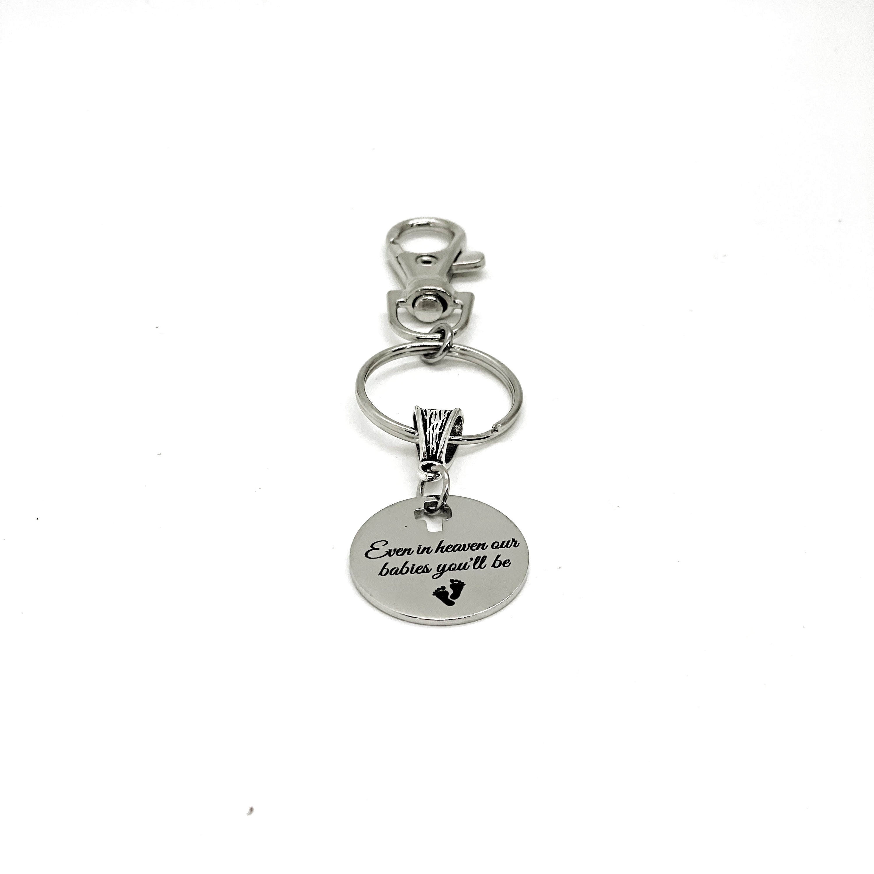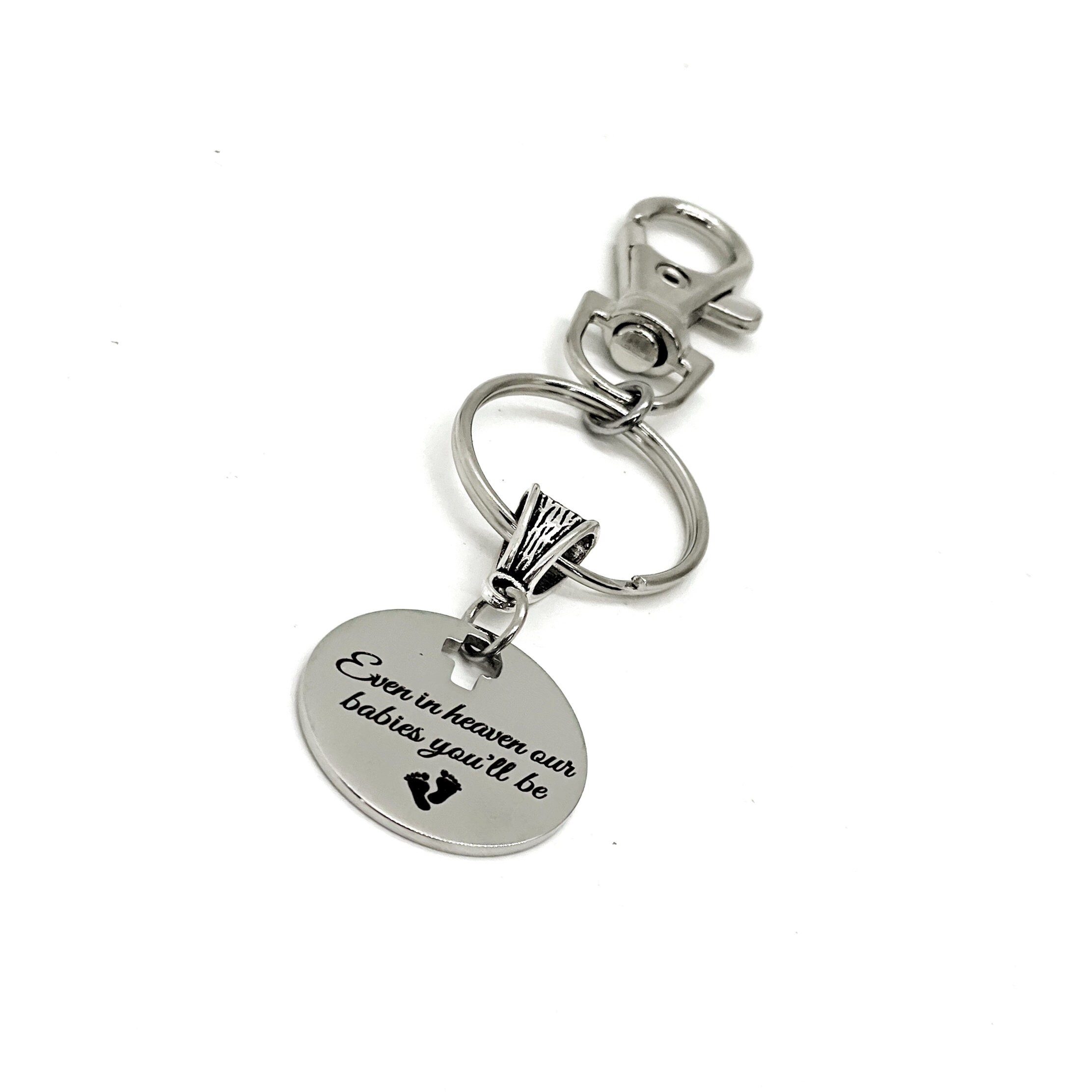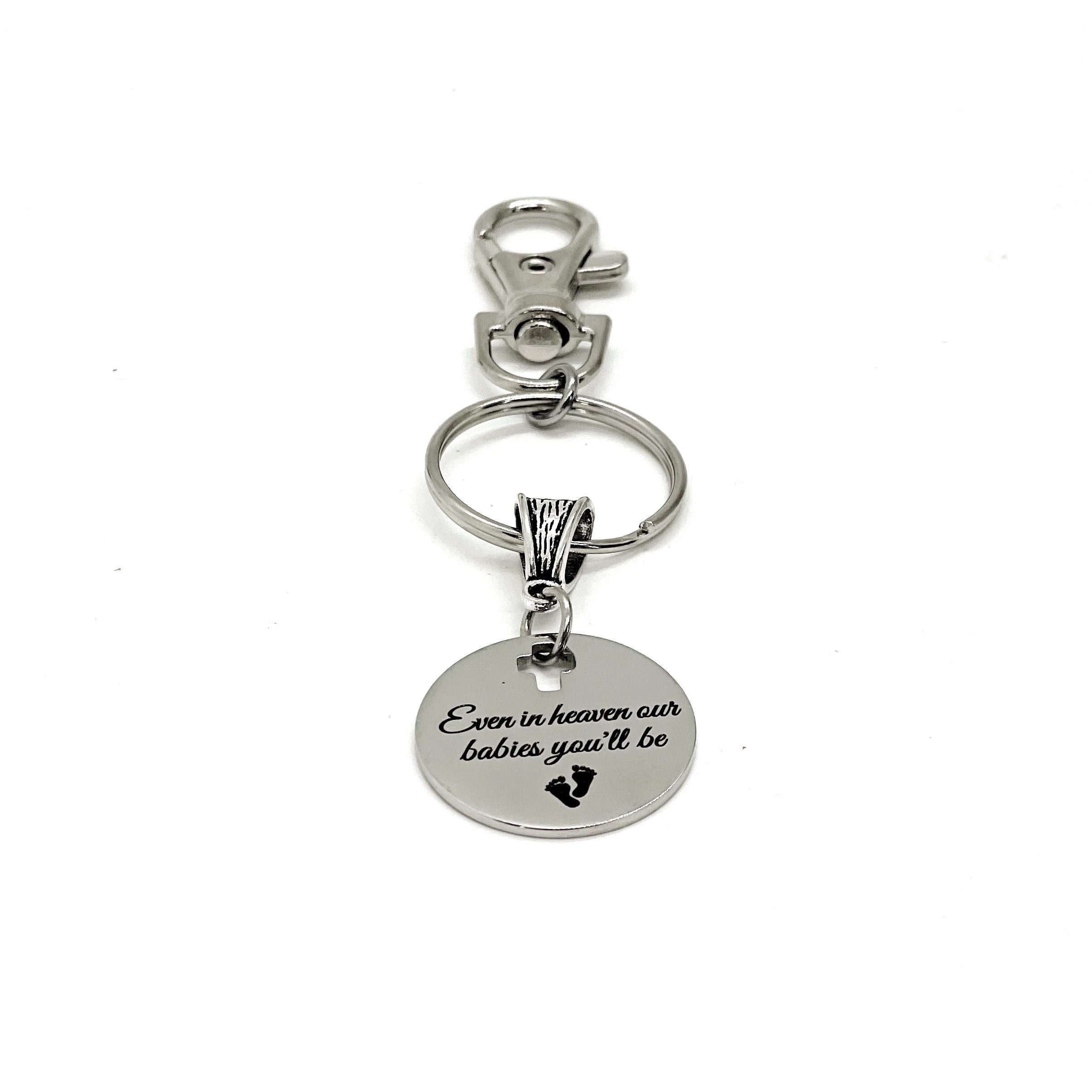 This is a great keychain gift . The keyring can be clipped onto your bag to make it easy to access without digging to the bottom of the bag. It has a stainless steel laser engraved charm with “Even in heaven our babies you’ll be" on it.