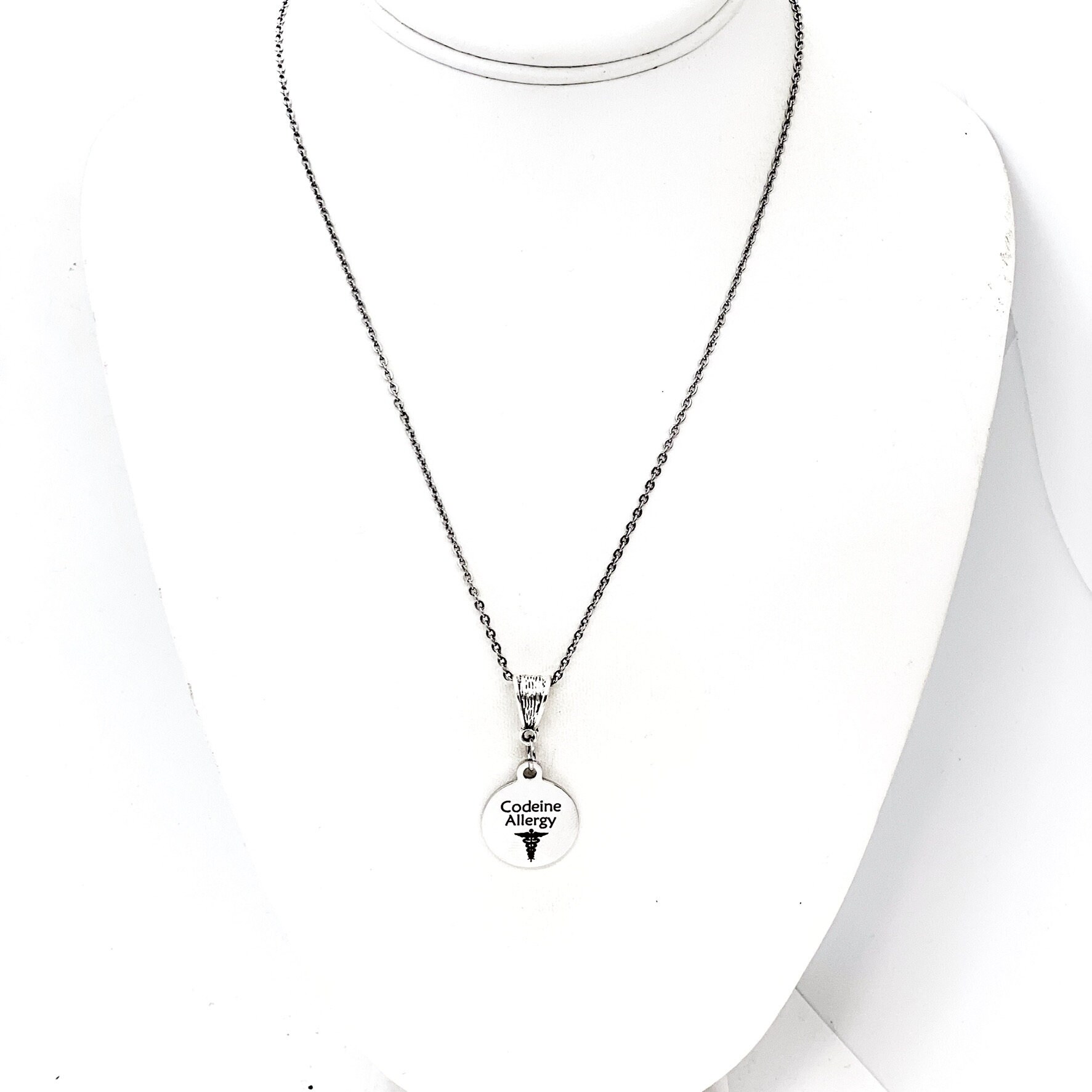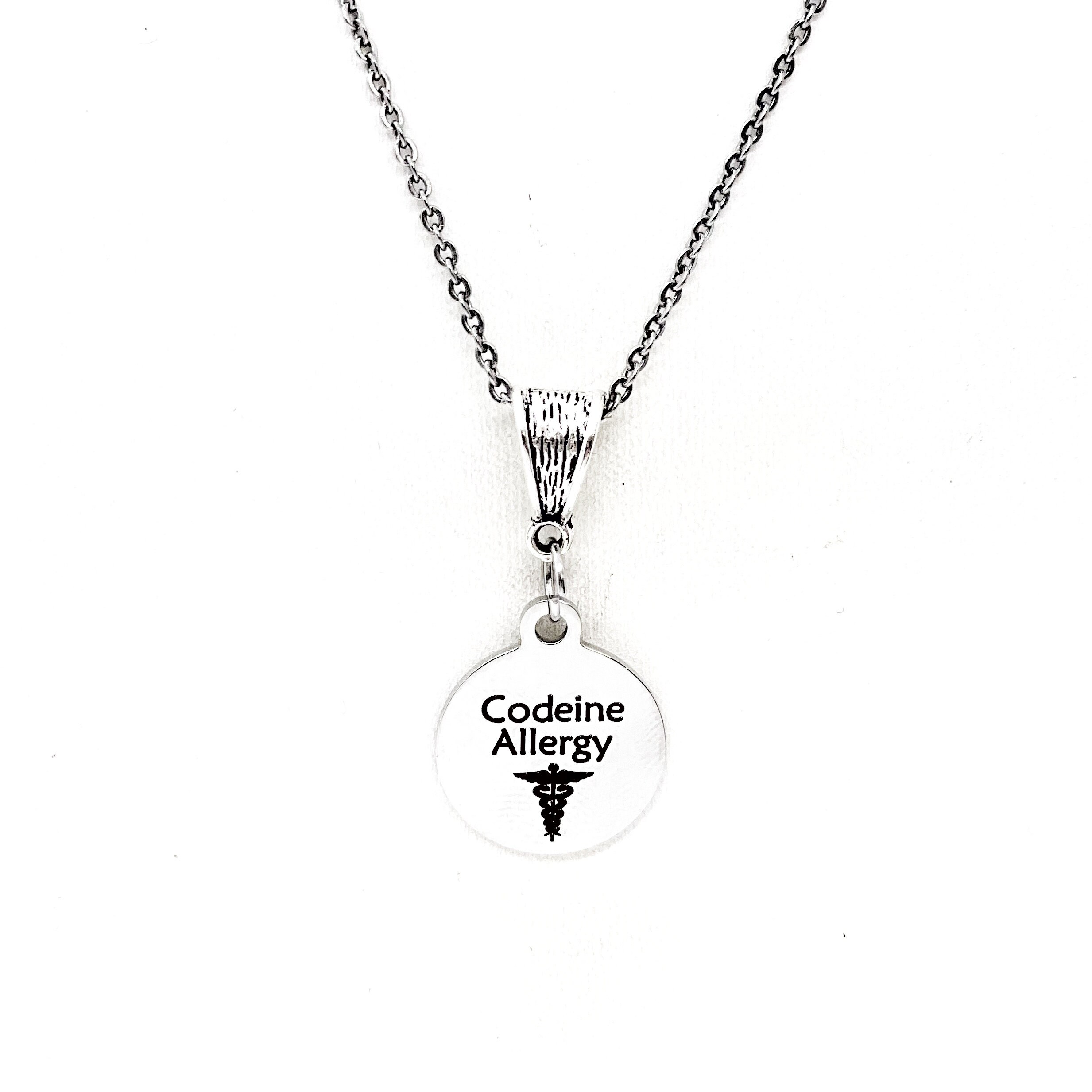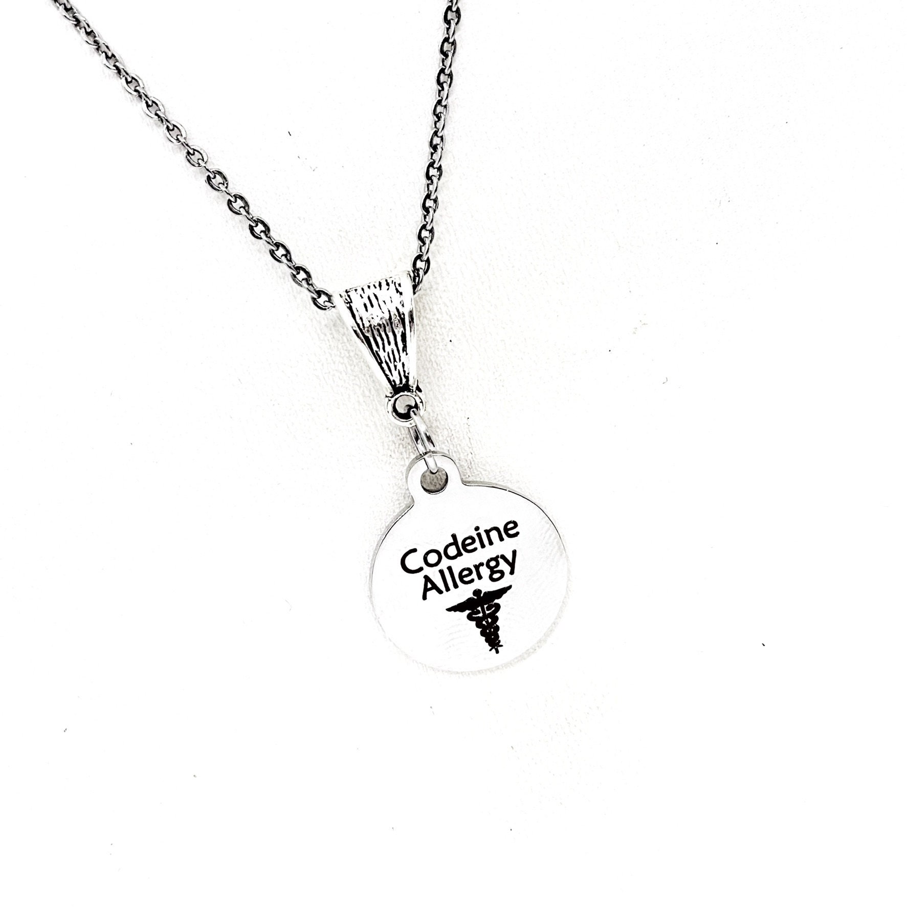 This is a stainless steel laser engraved pendant on a stainless steel link chain. The pendant says “Codeine Allergy” on it.