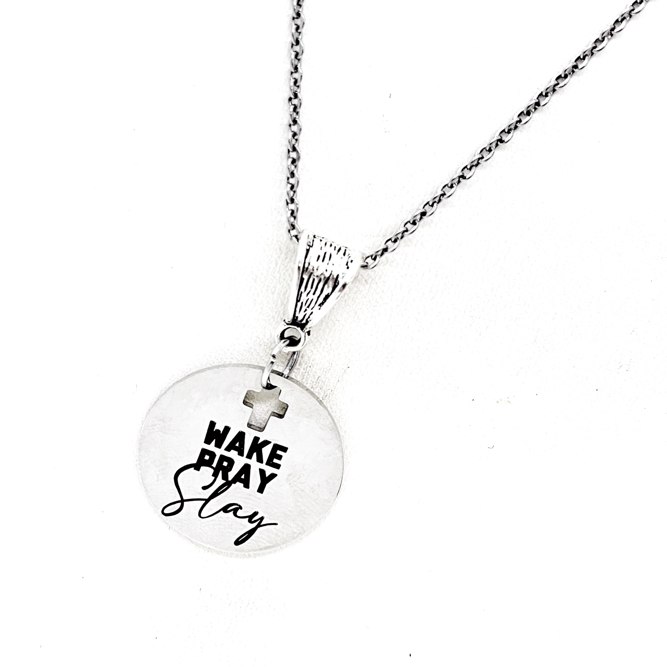 The is a beautiful jewelry piece that has a stainless steel laser engraved charm with “Wake Pray Slay” on it.