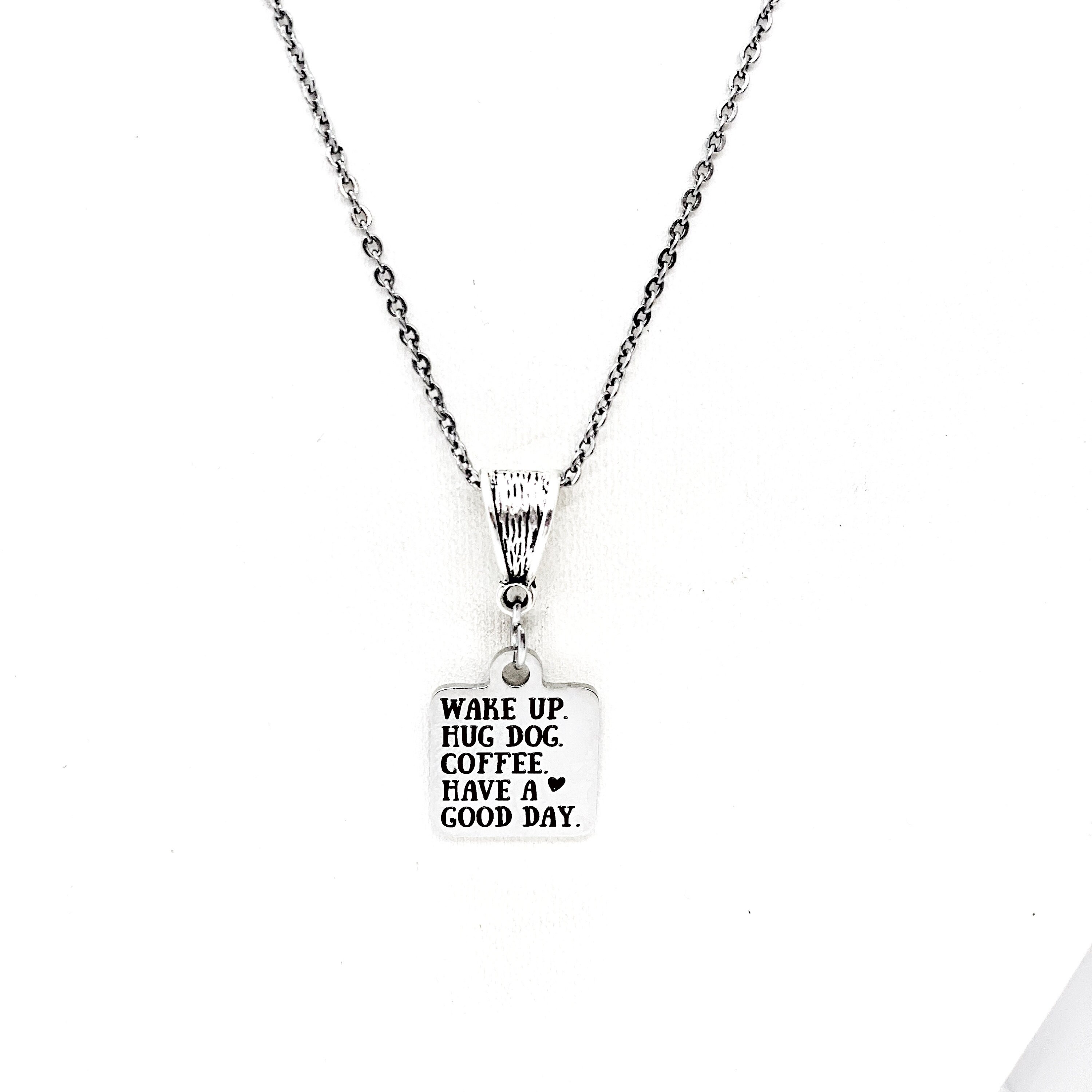 This beautiful necklace would make a wonderful gift. The pendant is a stainless steel laser engraved pendant that has “Wake Up. Hug Dog. Coffee. Have a good day” on it.