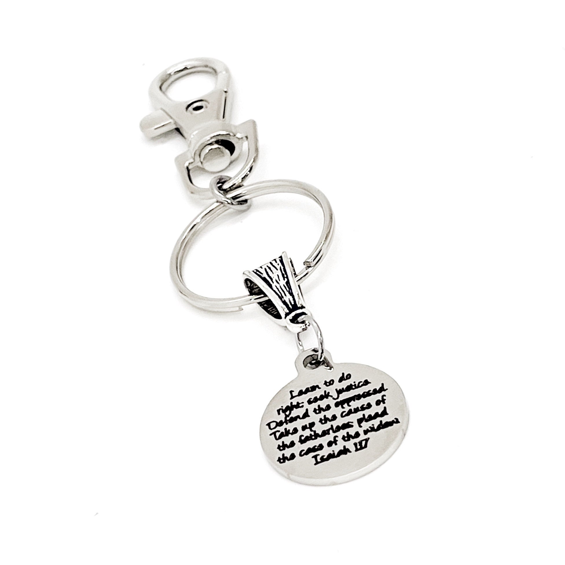 This is a great keychain gift . The keyring can be clipped onto your bag to make it easy to access without digging to the bottom of the bag. It has a stainless steel laser engraved charm with “Learn to do right, seek justice, defend the oppressed. Take up the cause of the fatherless; plead the case of the widow" from Isaiah 1:17 on it. The charm measures approx. 3/4 inch across.
