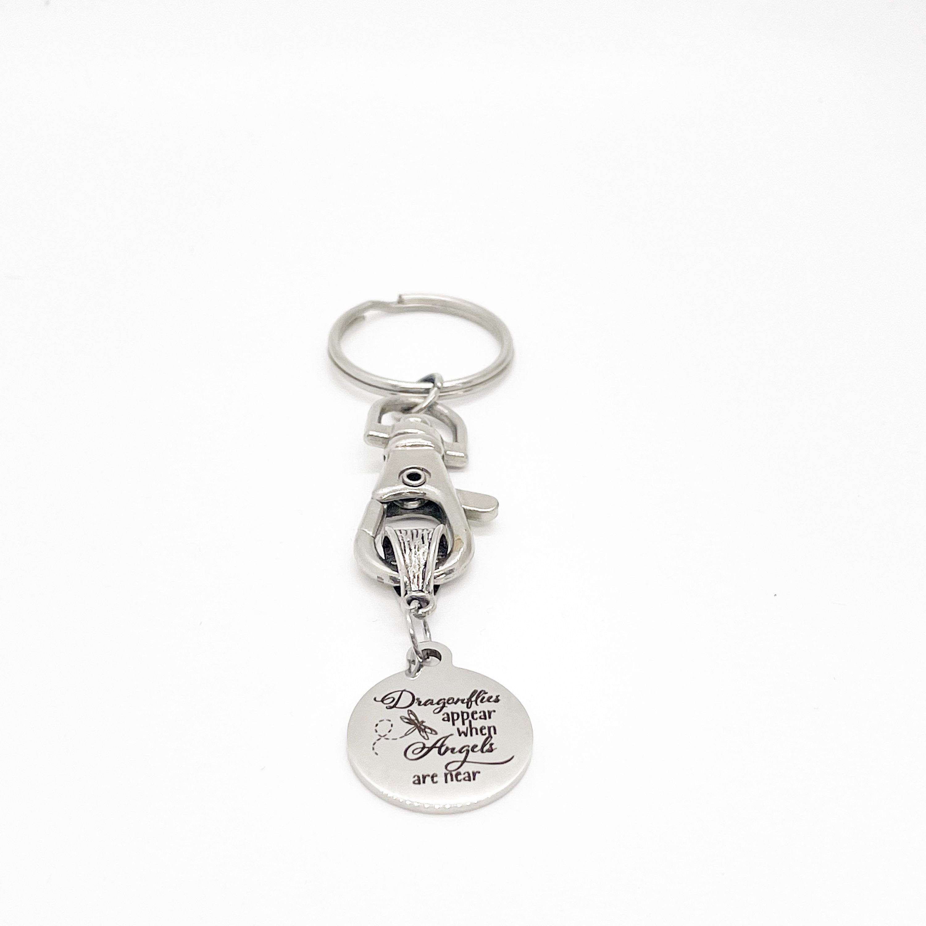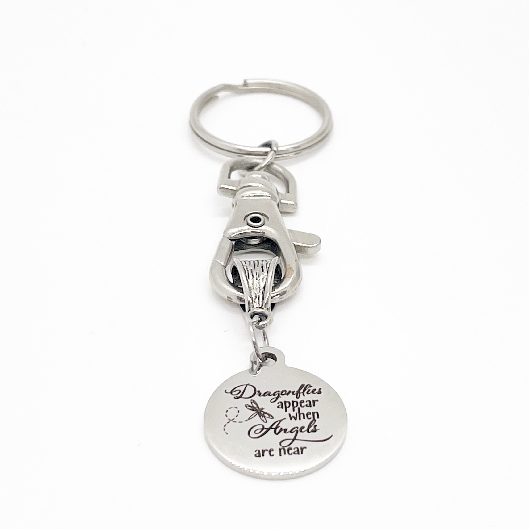 This keychain would make a great gift. It has a stainless steel laser engraved charm with “Dragonflies appear when angels are near” on it.