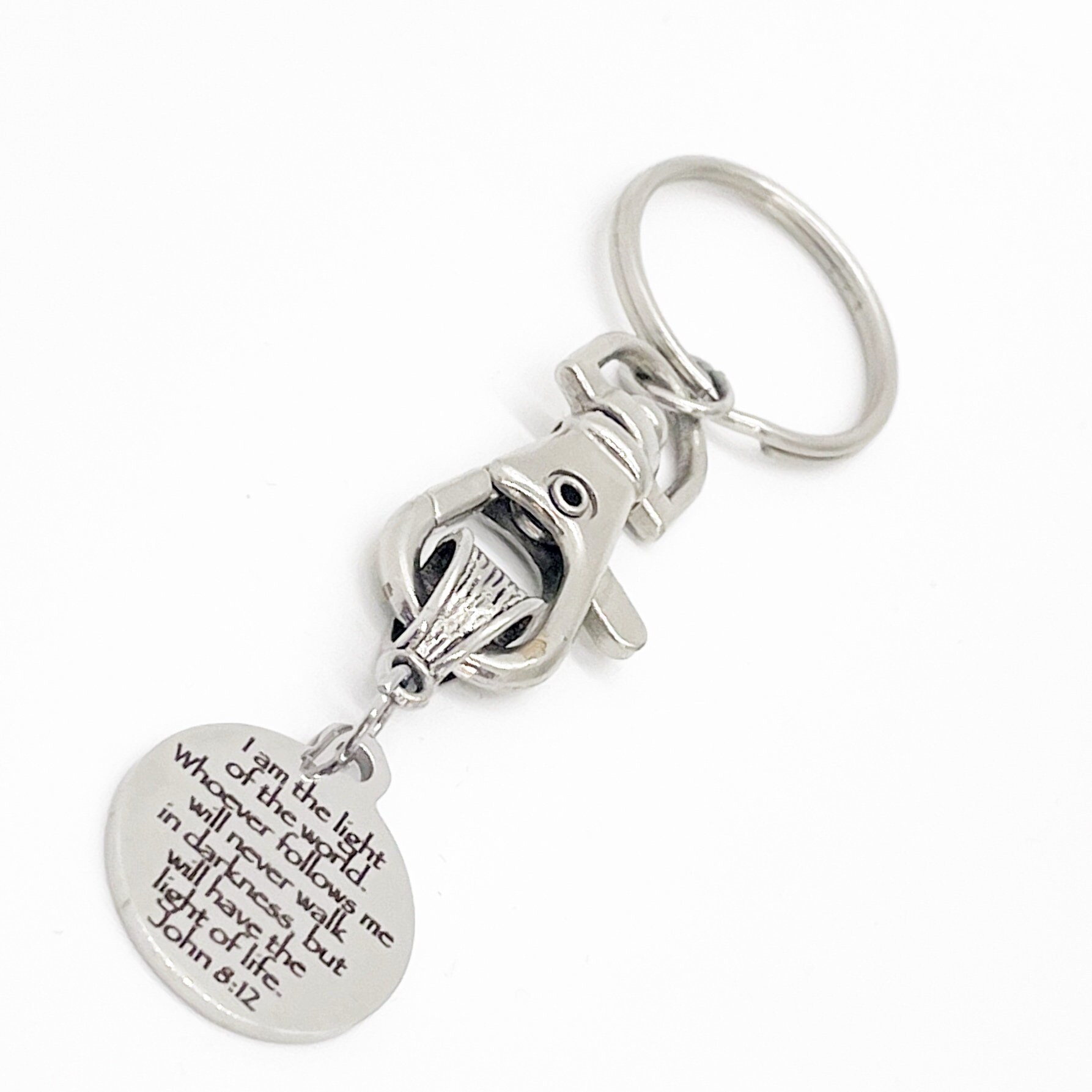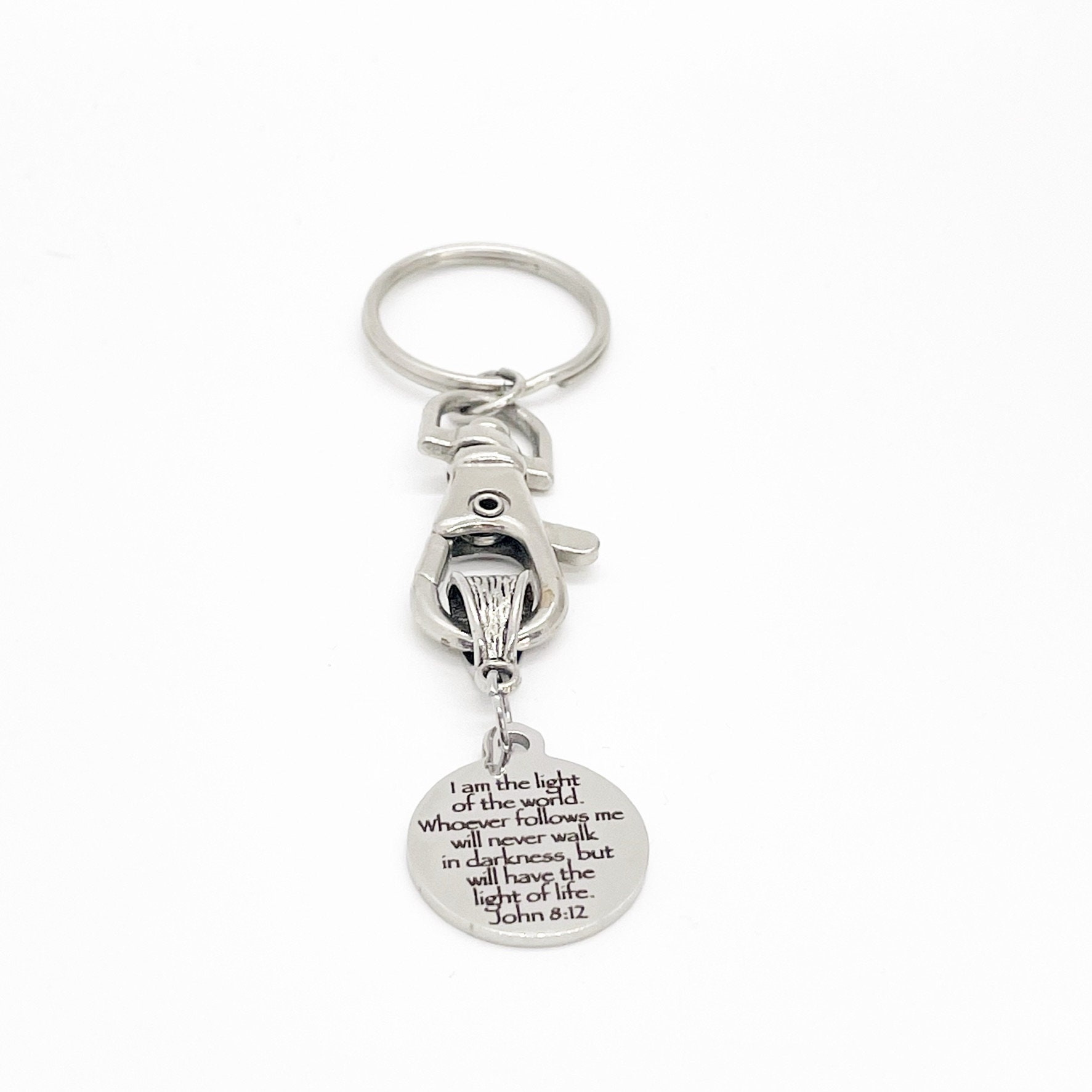 This keychain gift is a great gift to remind someone that Jesus is the light of the world and that those that follow Him shall have the light of life. It has a stainless steel laser engraved charm with the following scripture quote on it: