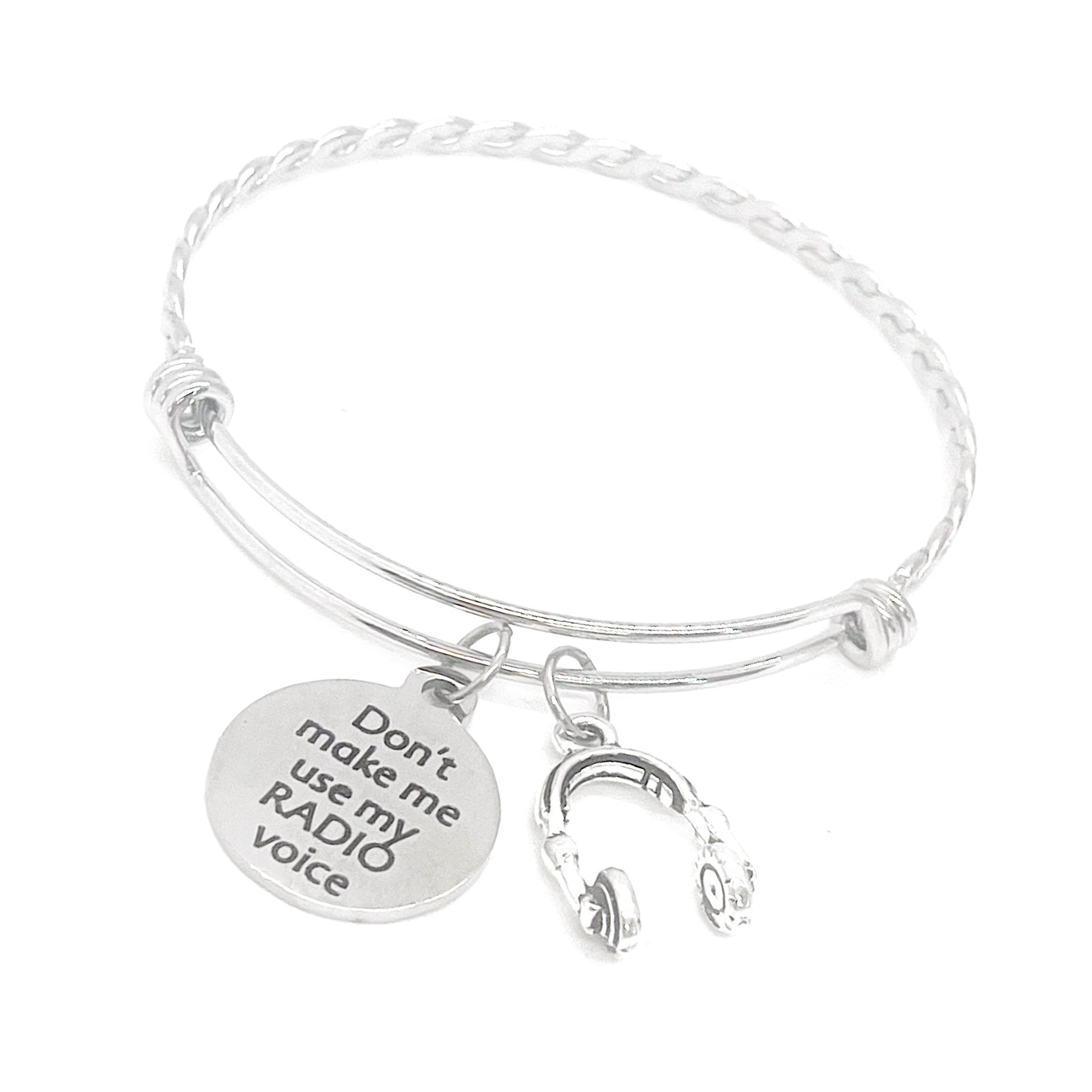 This is a beautiful stainless steel bracelet with an engraved charm with “Don’t make me use my RADIO voice” on it. The charm measures approx. 3/4 inch across