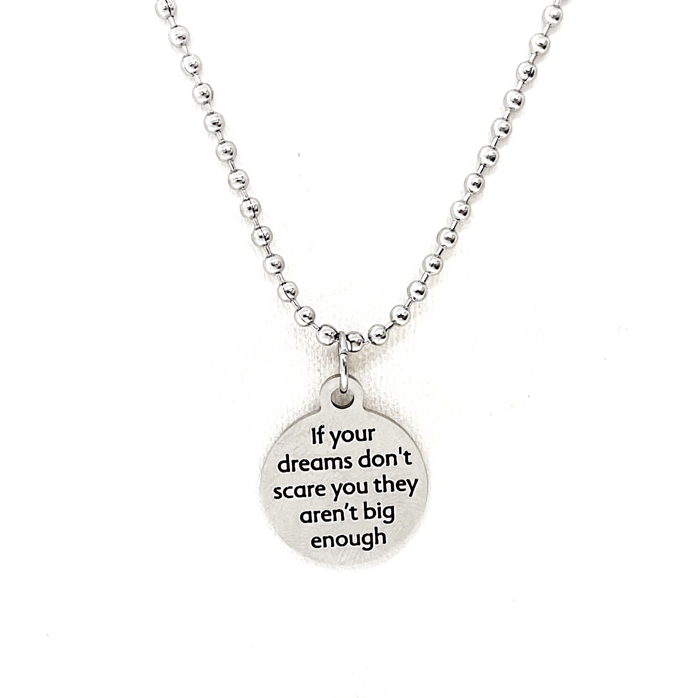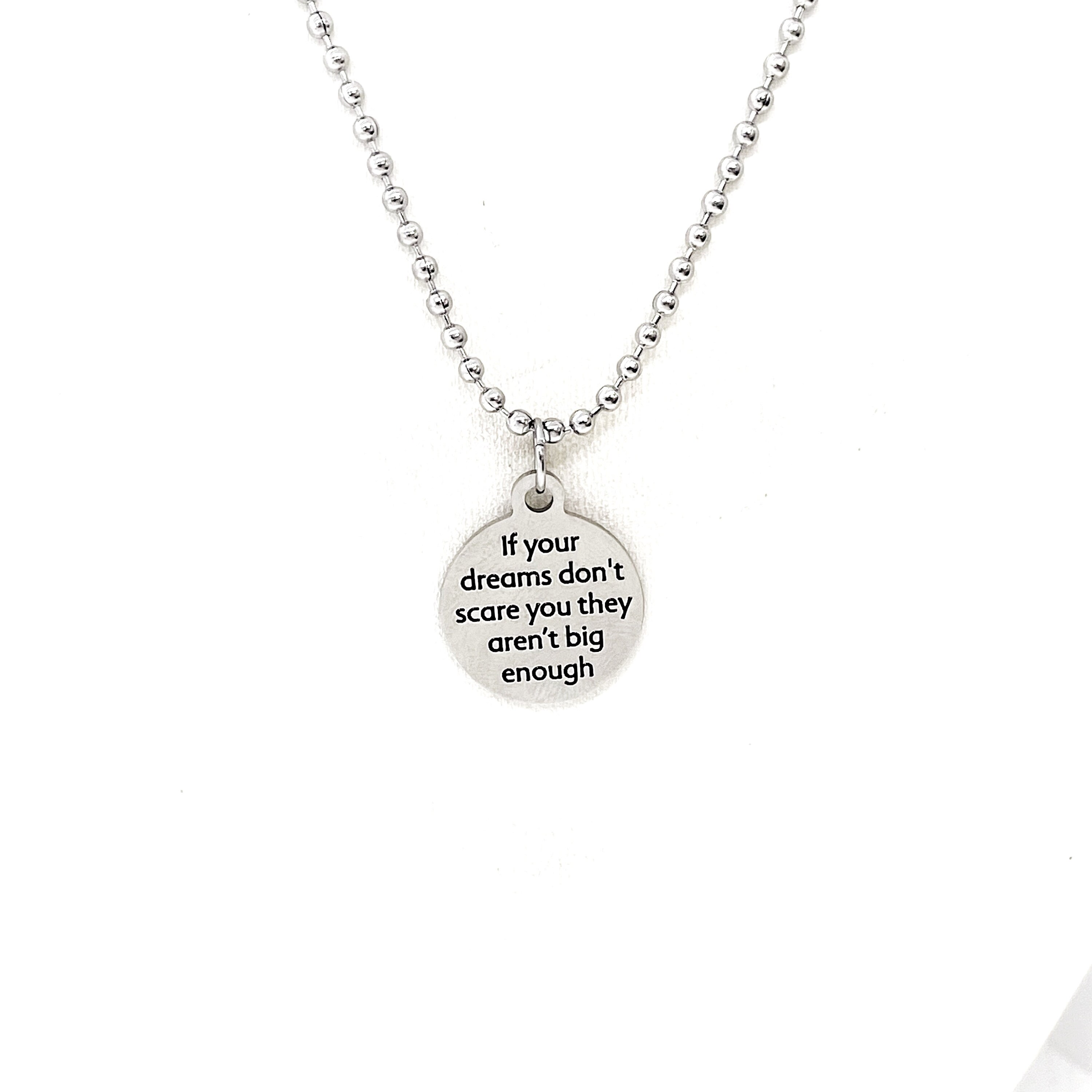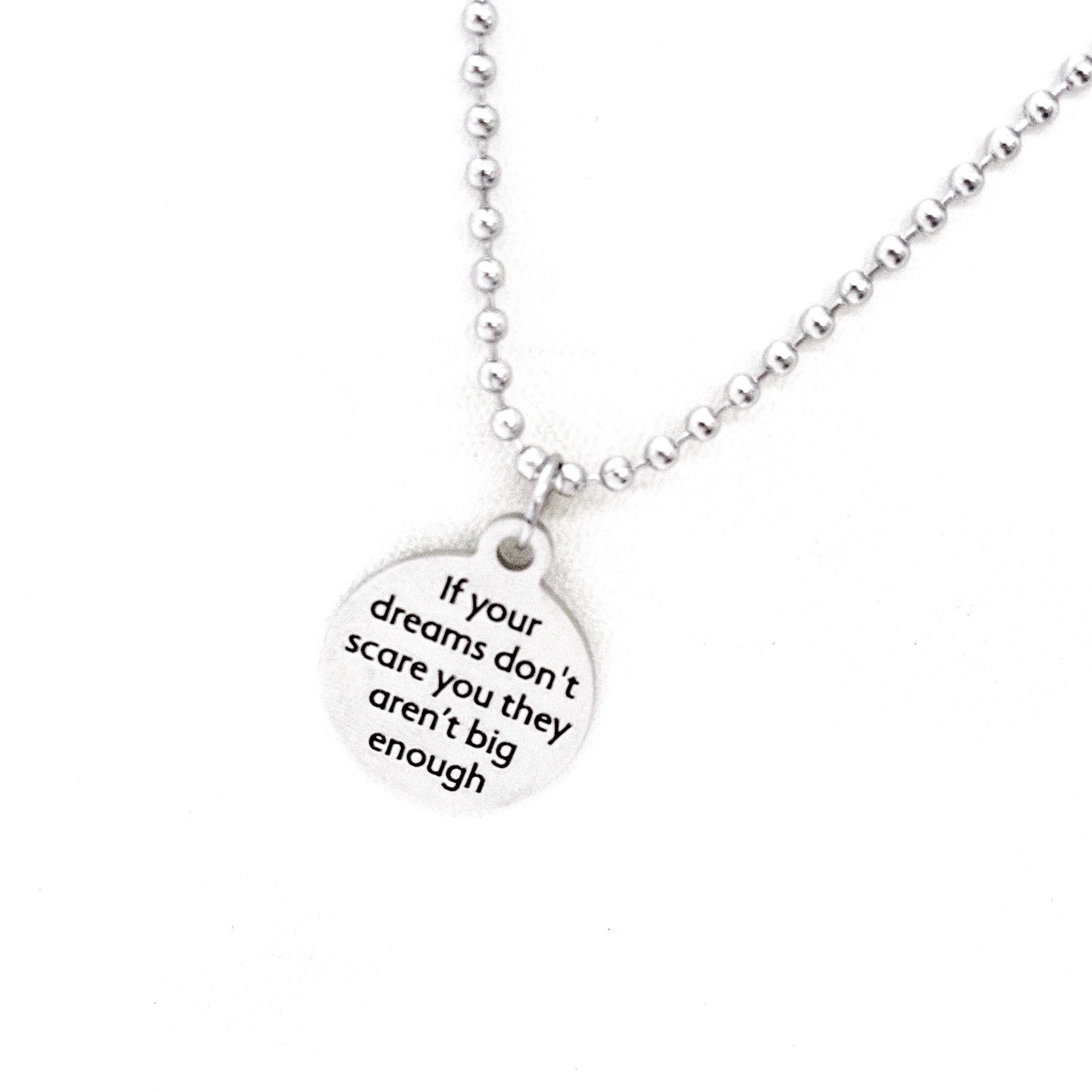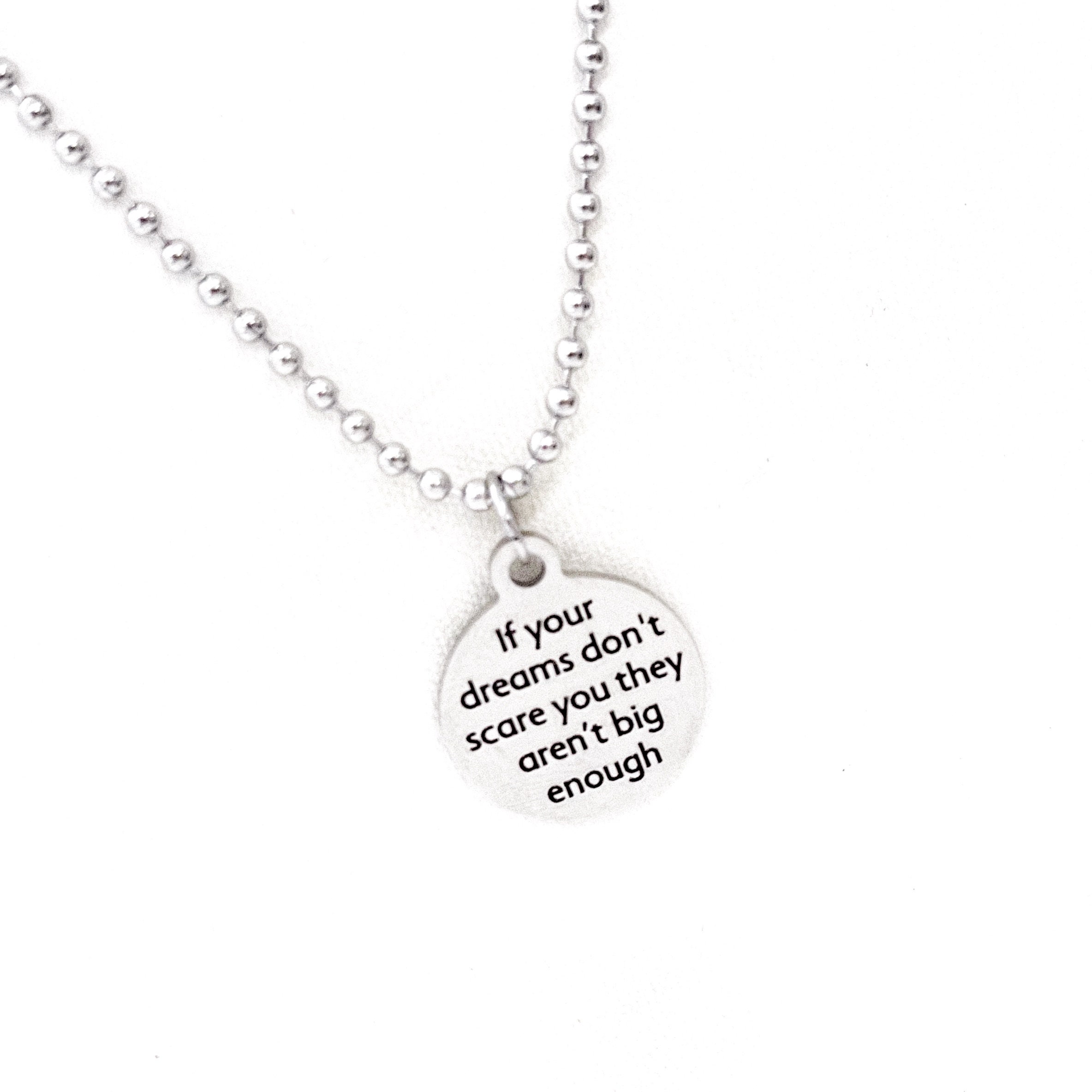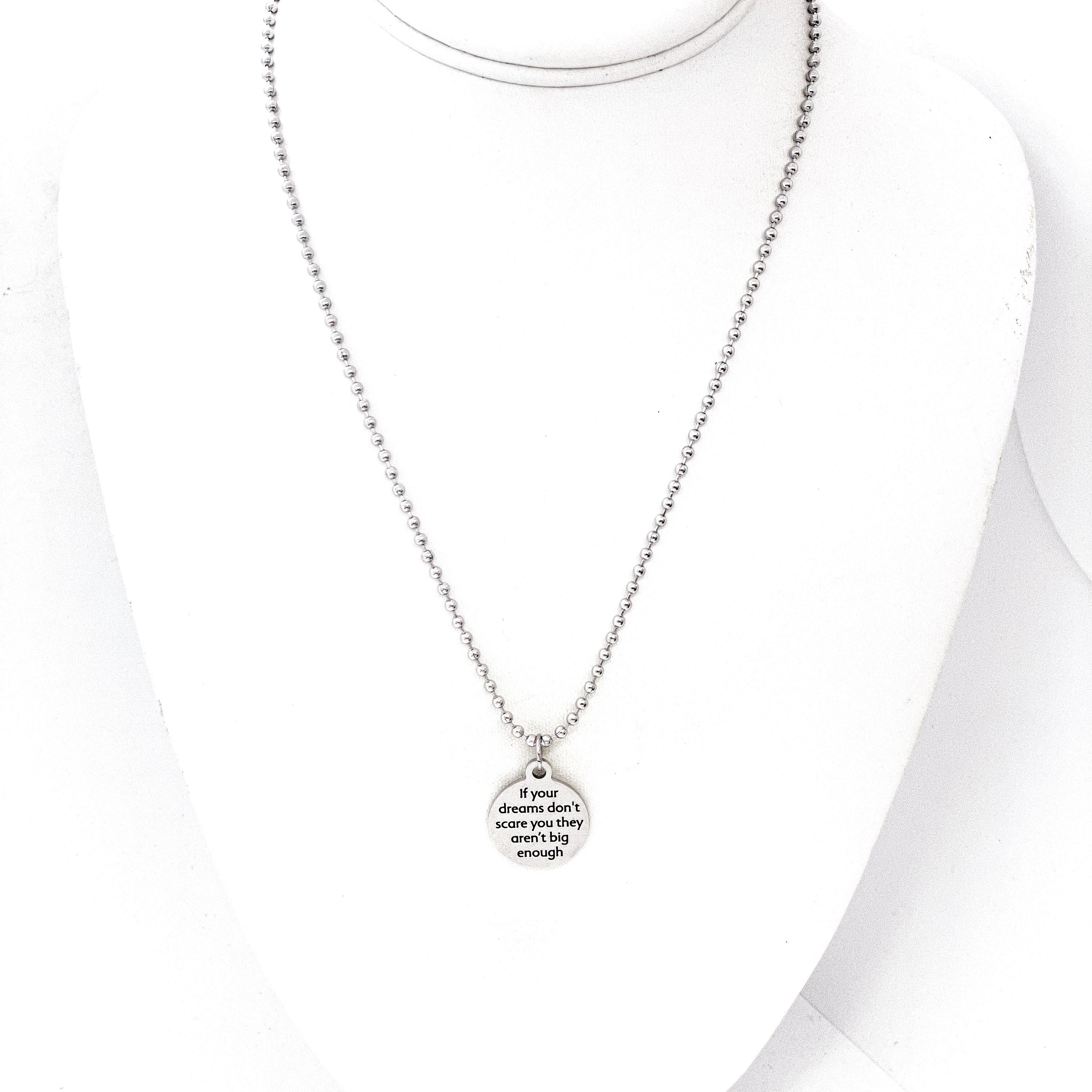 This necklace would make a great sympathy or encouraging gift. The pendant is a laser engraved charm on a stainless steel ball chain. The charm has "If your dreams don’t scare you they aren’t big enough" on it.