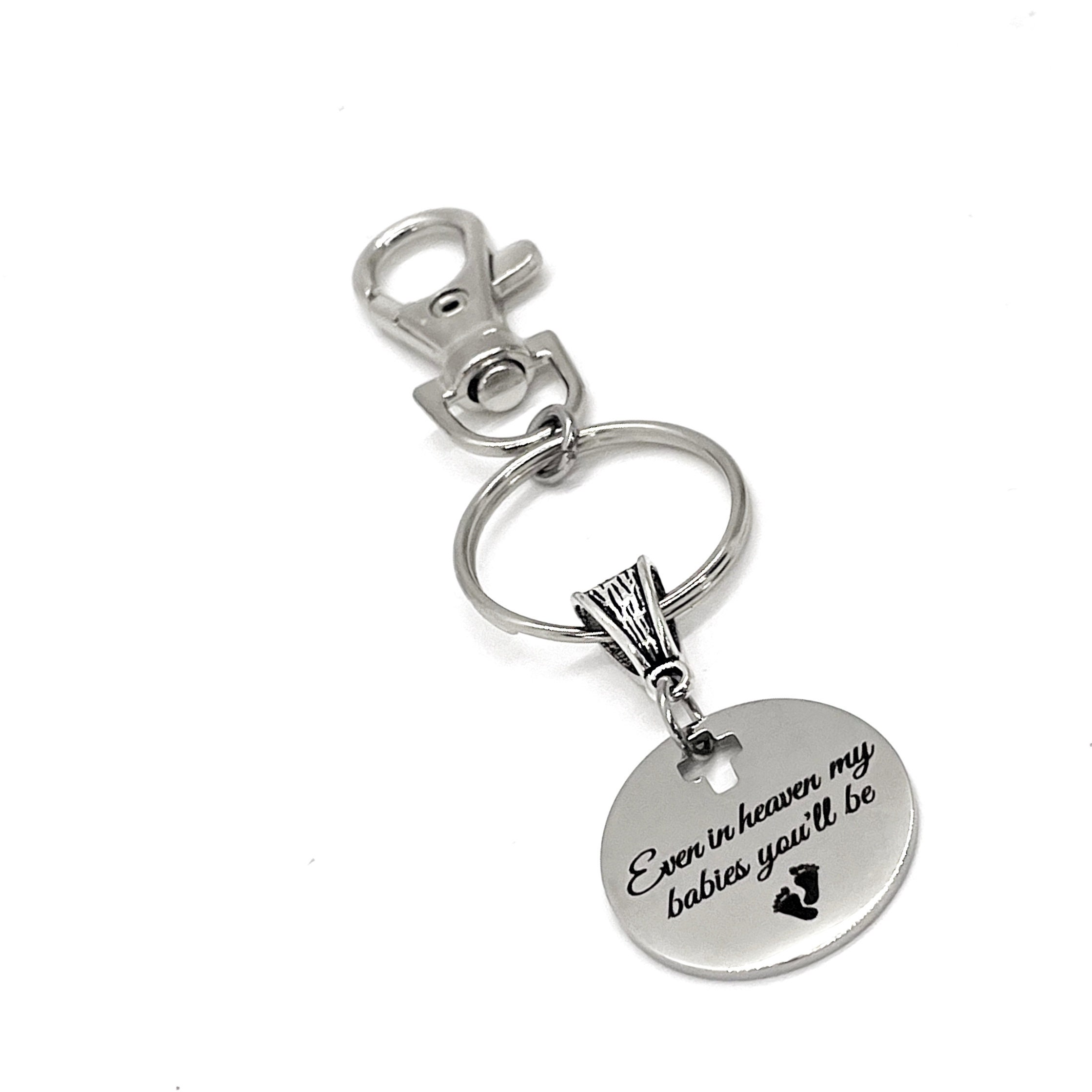 This is a great keychain gift . The keyring can be clipped onto your bag to make it easy to access without digging to the bottom of the bag. It has a stainless steel laser engraved charm with “Even in Heaven my babies you’ll be” on it.