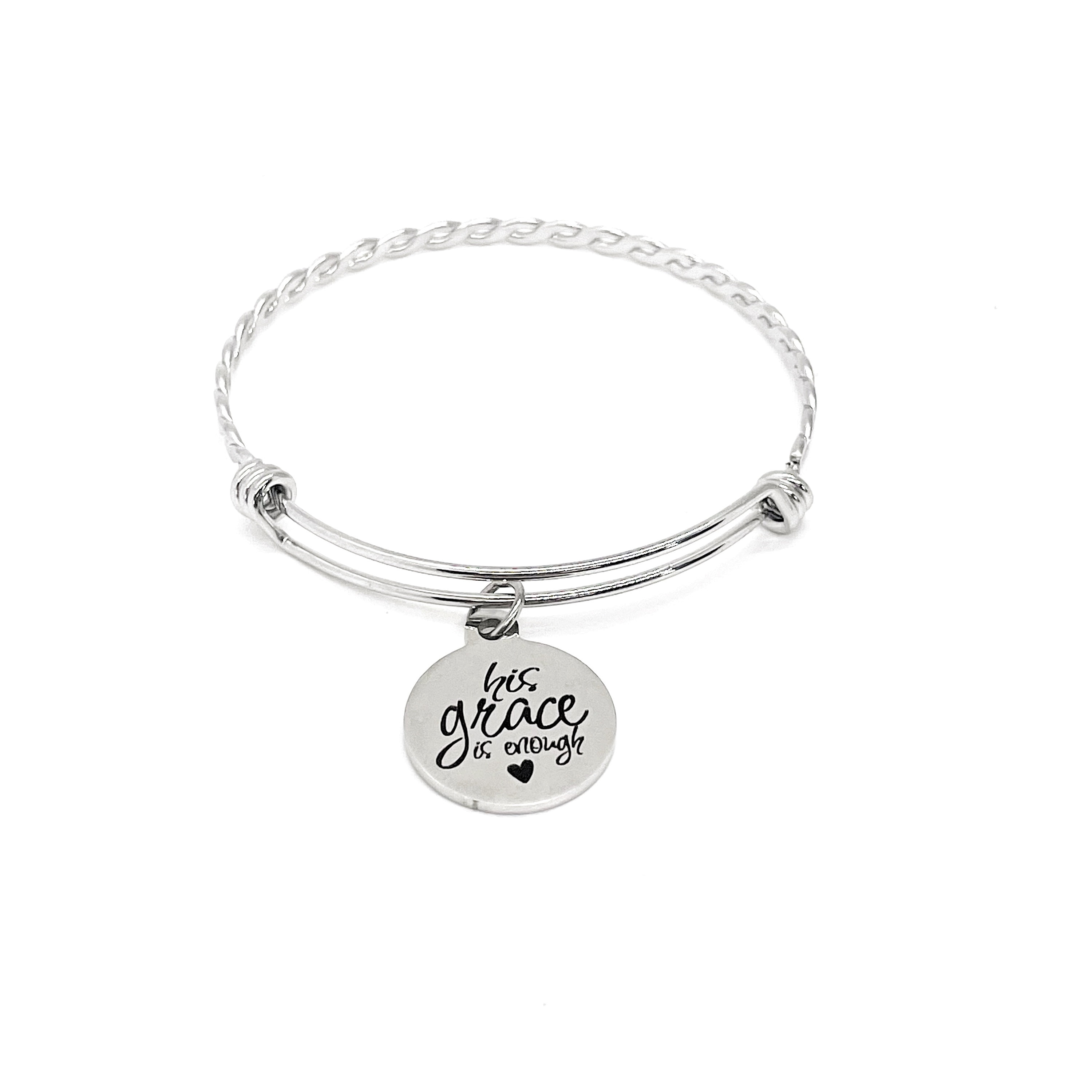 This is a beautiful stainless steel bracelet with an engraved charm with “His grace is enough” on it. The charm measures approx. 3/4 inch across