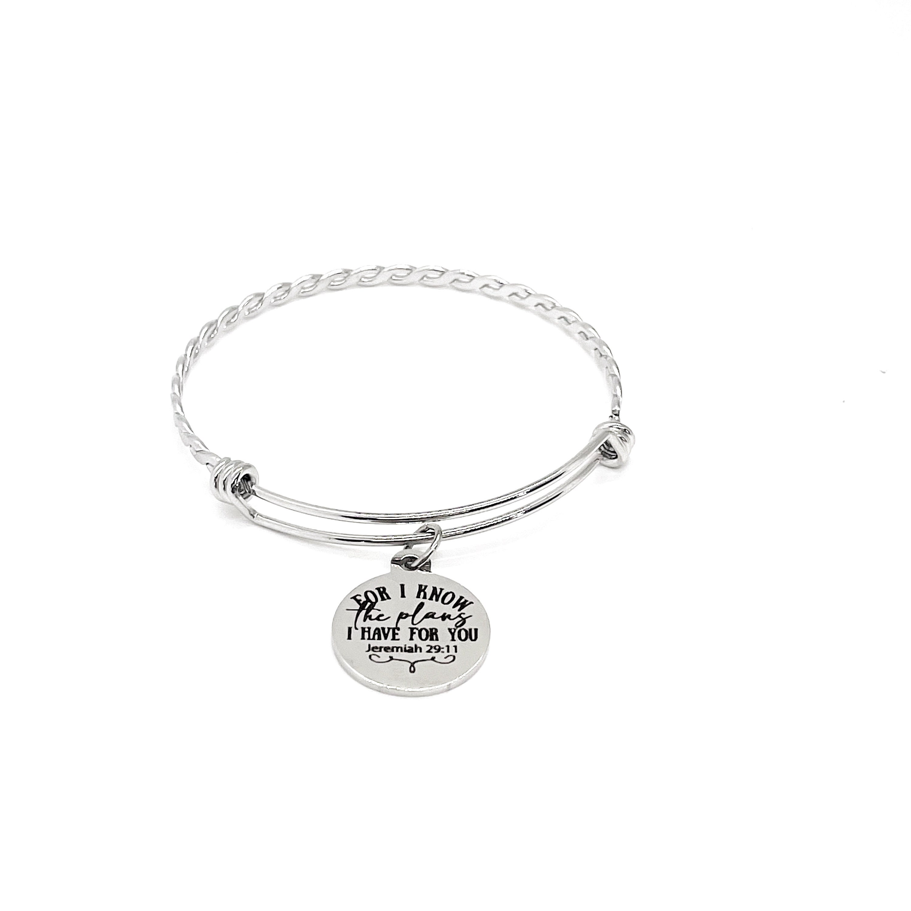 This is a beautiful stainless steel bracelet with an engraved charm with “For I know the plans I have for you” from Proverbs 29:11 on it. The charm measures approx. 3/4 inch across