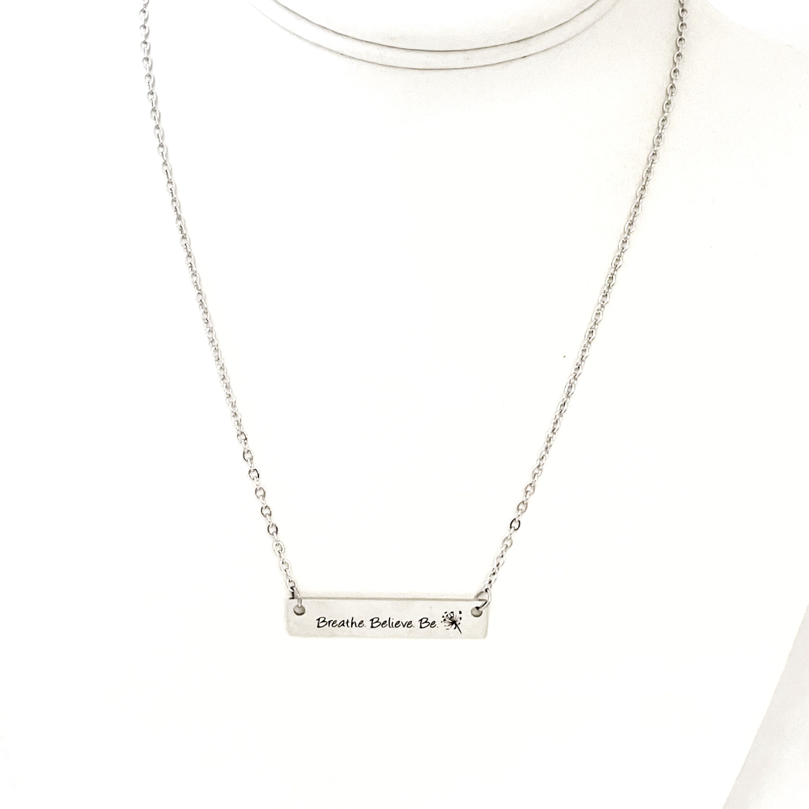 This is a beautiful stainless steel laser engraved "Breathe Believe Be" connector bar pendant on a stainless steel chain necklace in your choice of lengths. It would also be a beautiful inspirational graduation gift for someone you love!