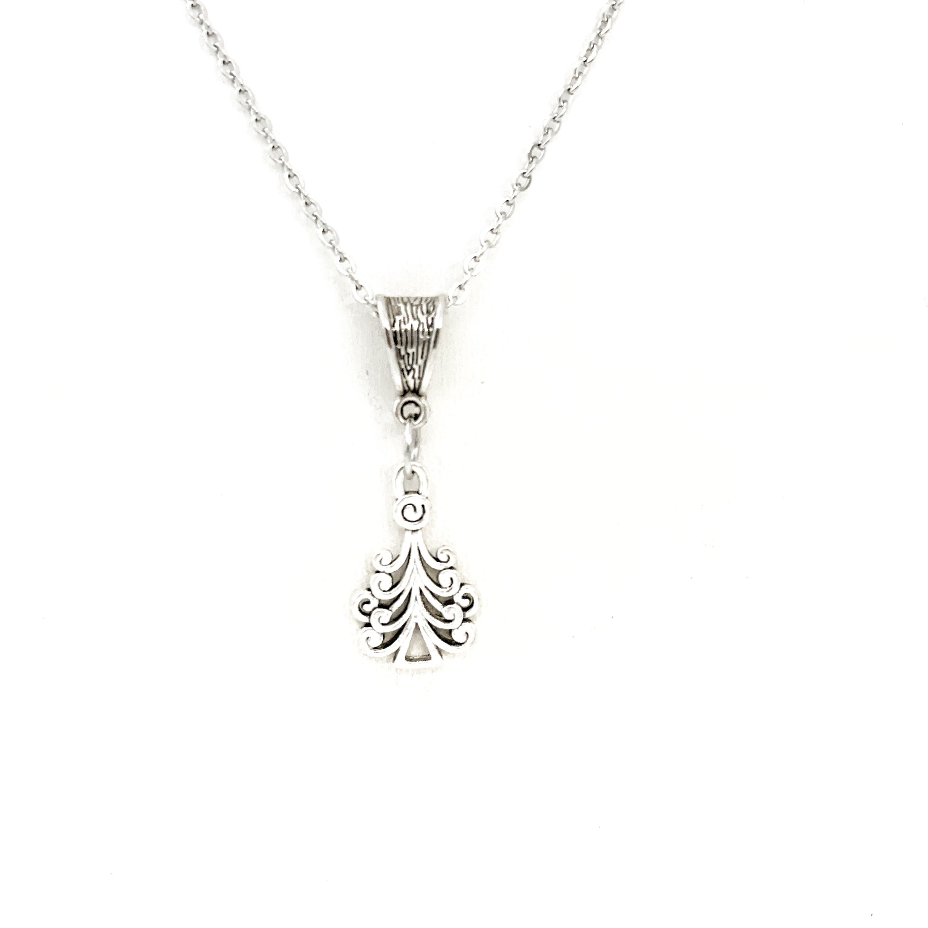 This beautiful necklace is a stainless steel chain with a silvertone bale and Christmas tree pendant.