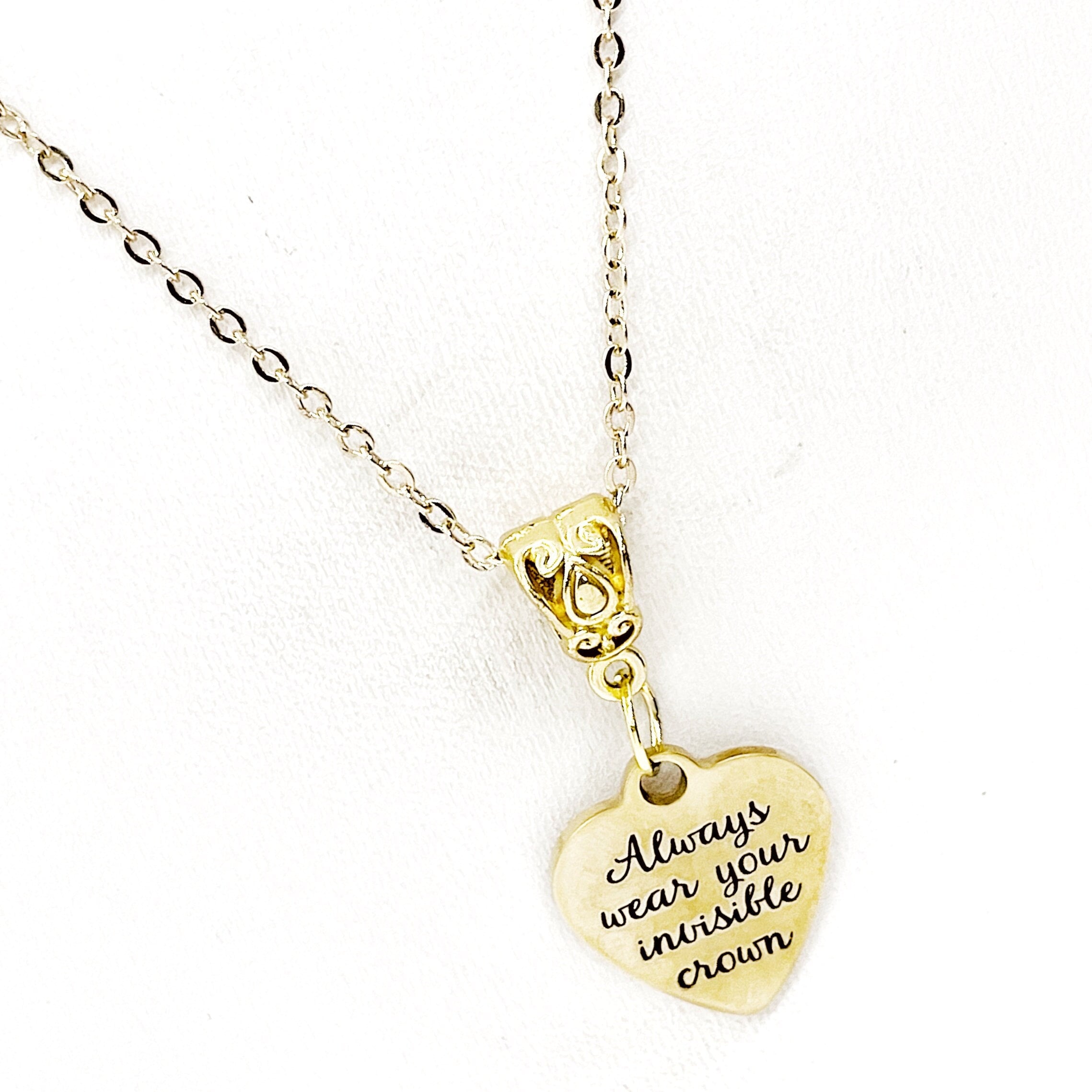 This beautiful necklace would make wonderful gift. It is a gold-plated stainless steel charm with “Always wear your invisible crown” on it. The charm measures approx. 1/2 inch across.