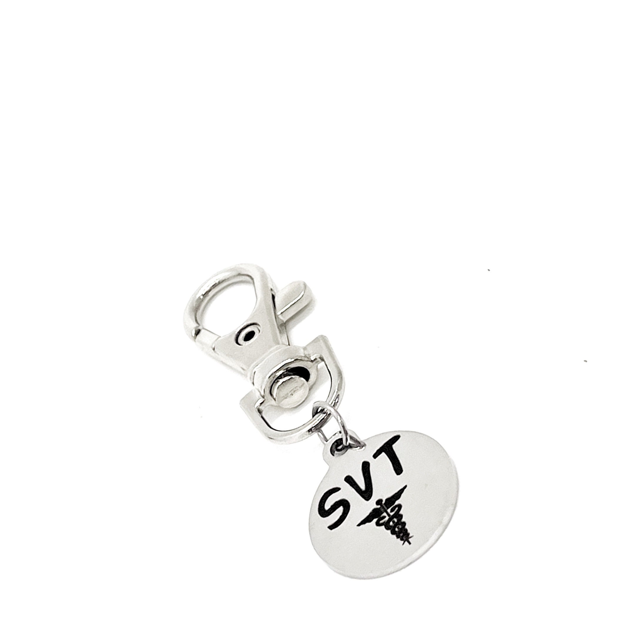 This is a great zipper pull or bag charm clip gift that would be a great gift. It would be a great charm to clip onto a tote, purse, sports bag, book bag or keychain. It has a stainless steel laser engraved charm with “SVT” on it.