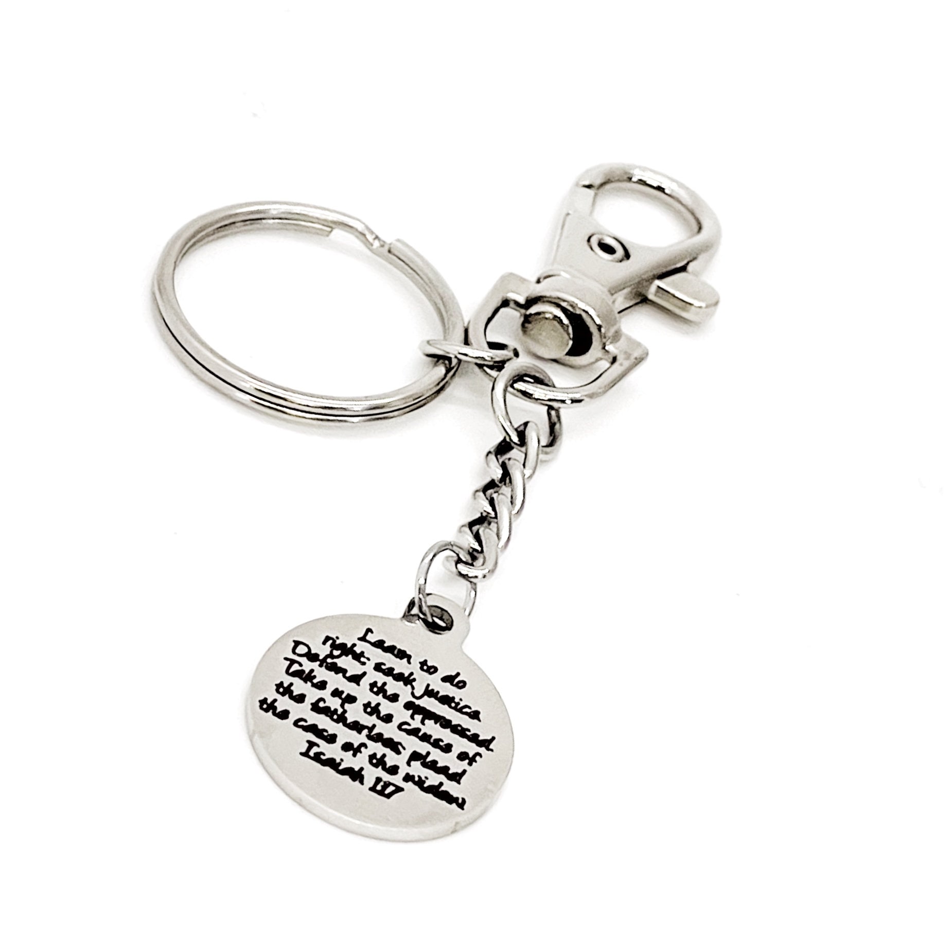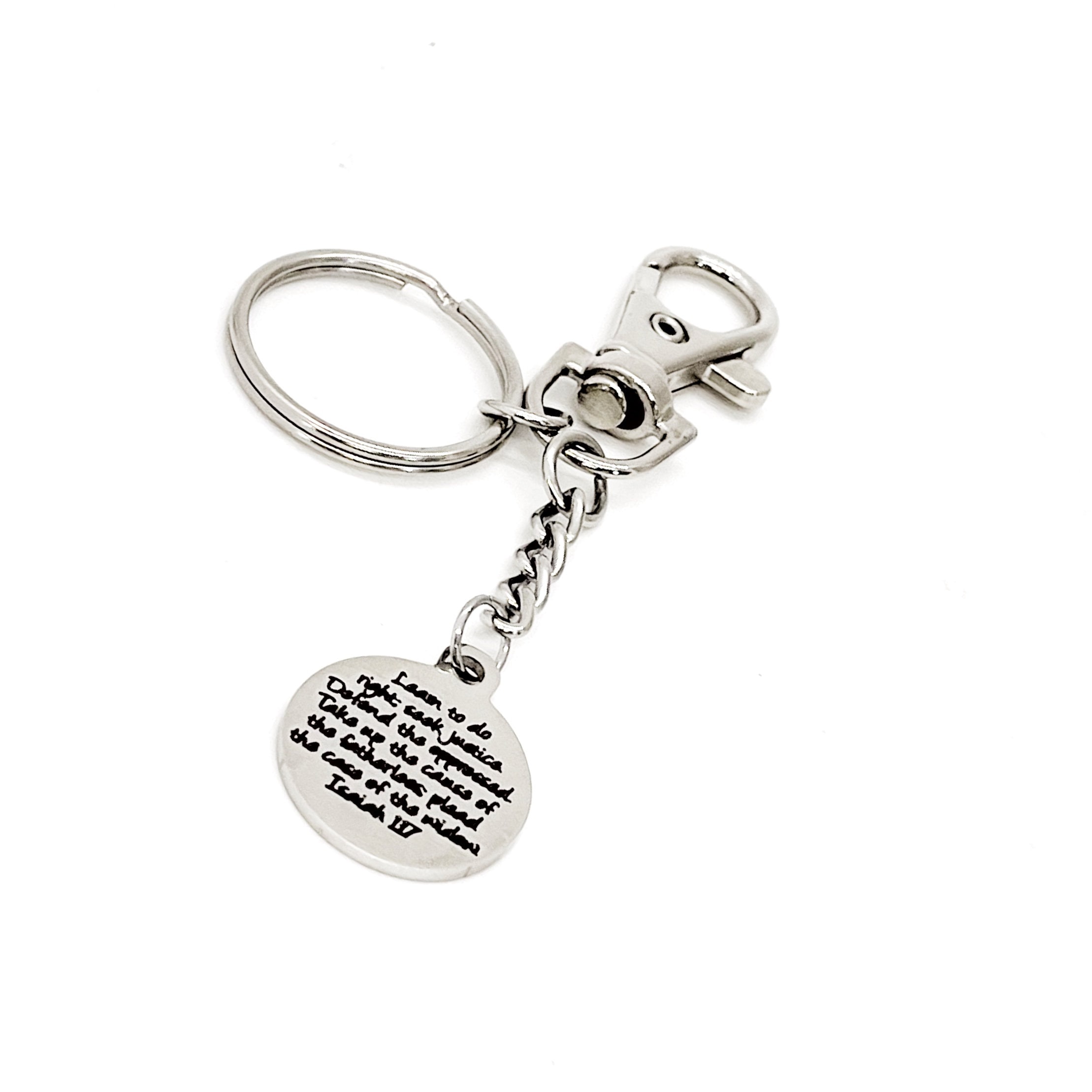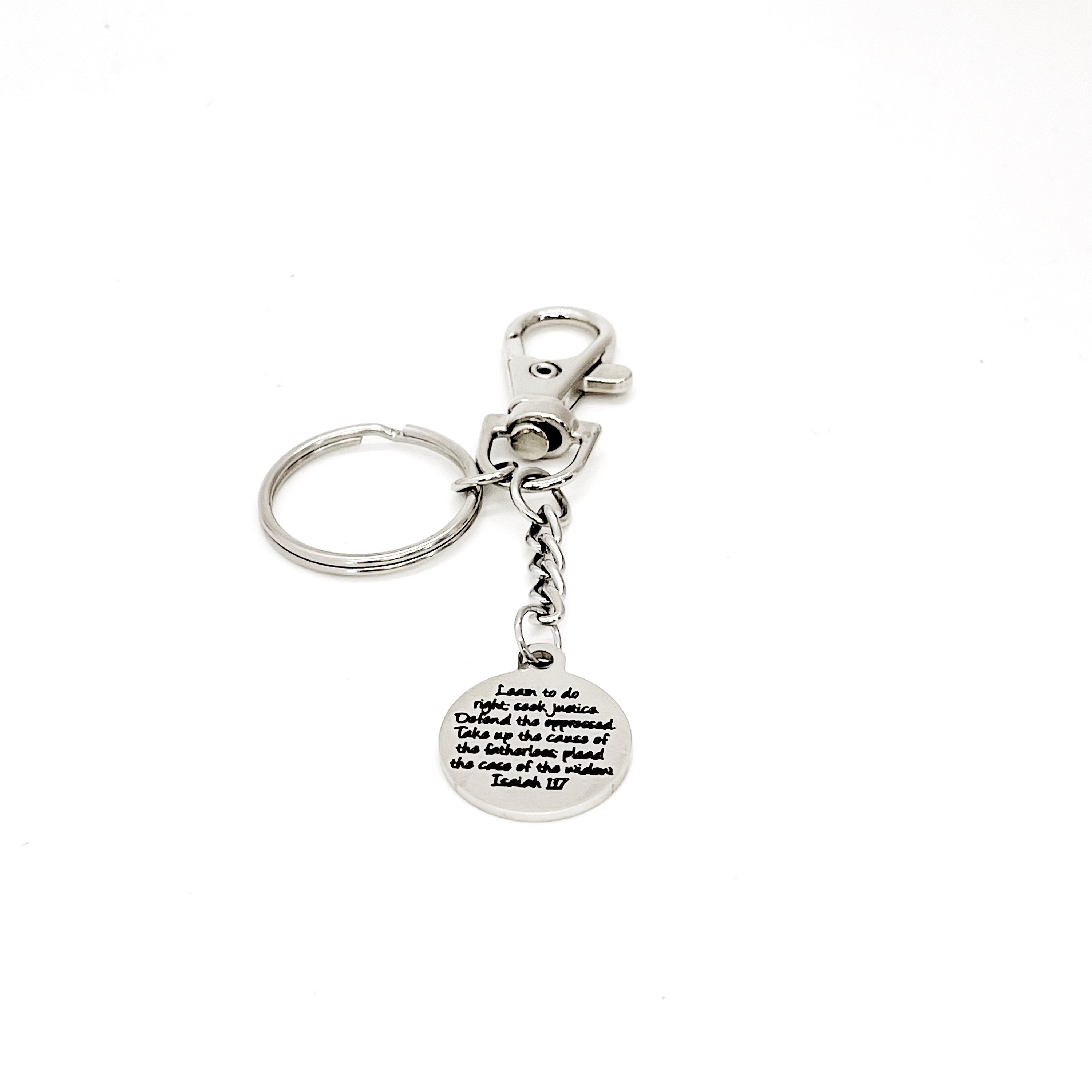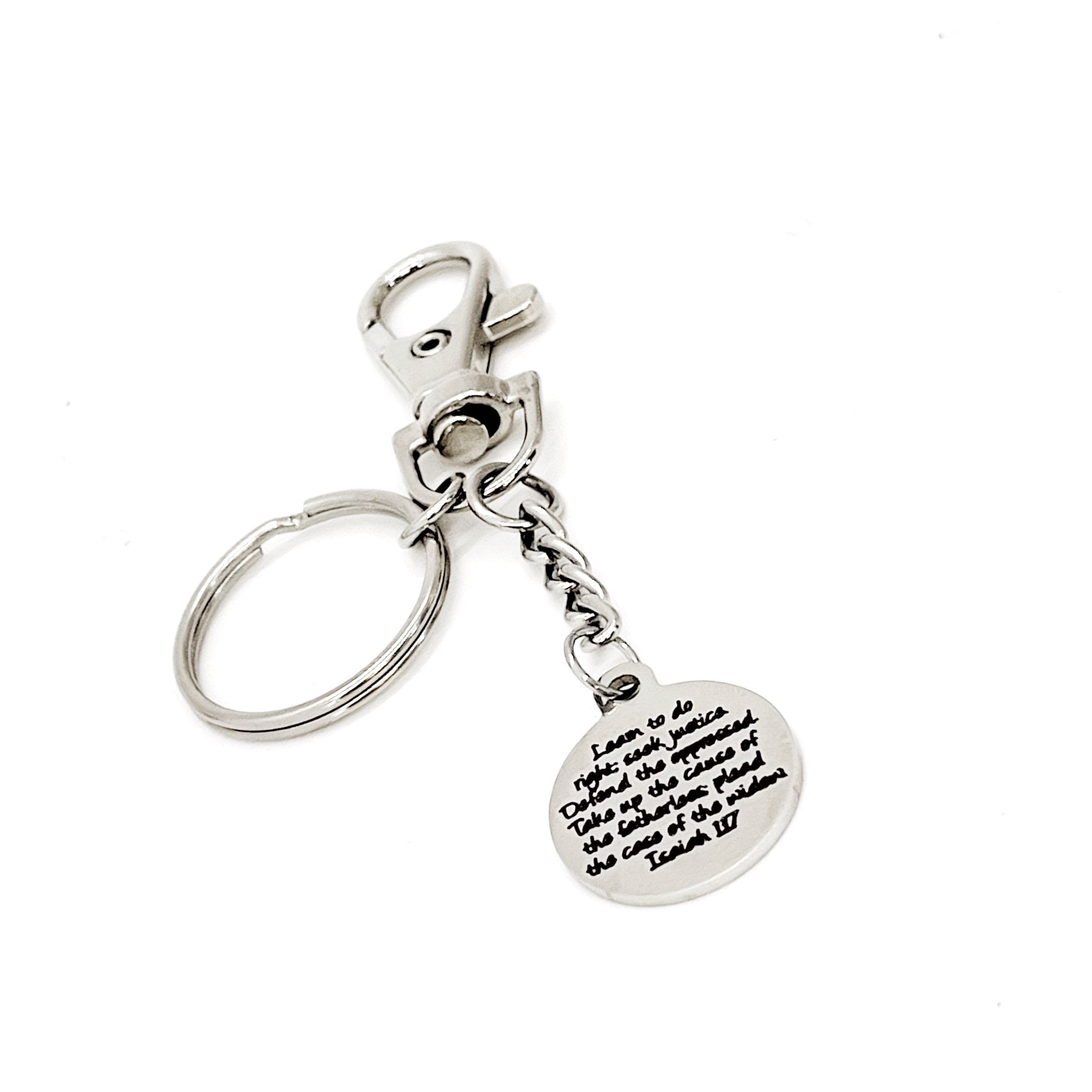 This is a great keychain gift . The keyring can be clipped onto your bag to make it easy to access without digging to the bottom of the bag. It has a stainless steel laser engraved charm with “Learn to do right, seek justice, defend the oppressed. Take up the cause of the fatherless; plead the case of the widow" from Isaiah 1:17 on it. The charm measures approx. 3/4 inch across.