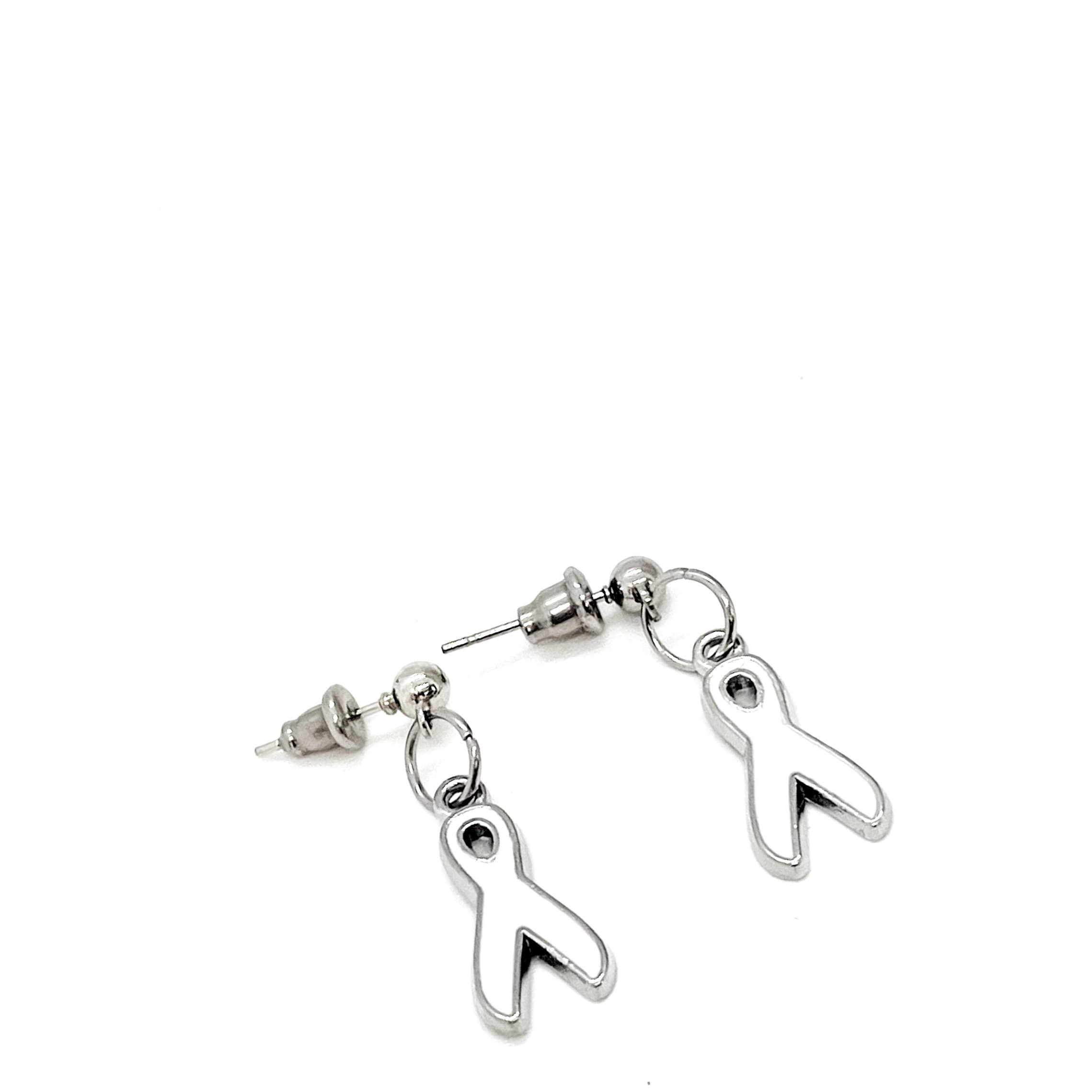This is a great set of silvertone white ribbon charm earrings. The charms measure approx. 3/4 inch.