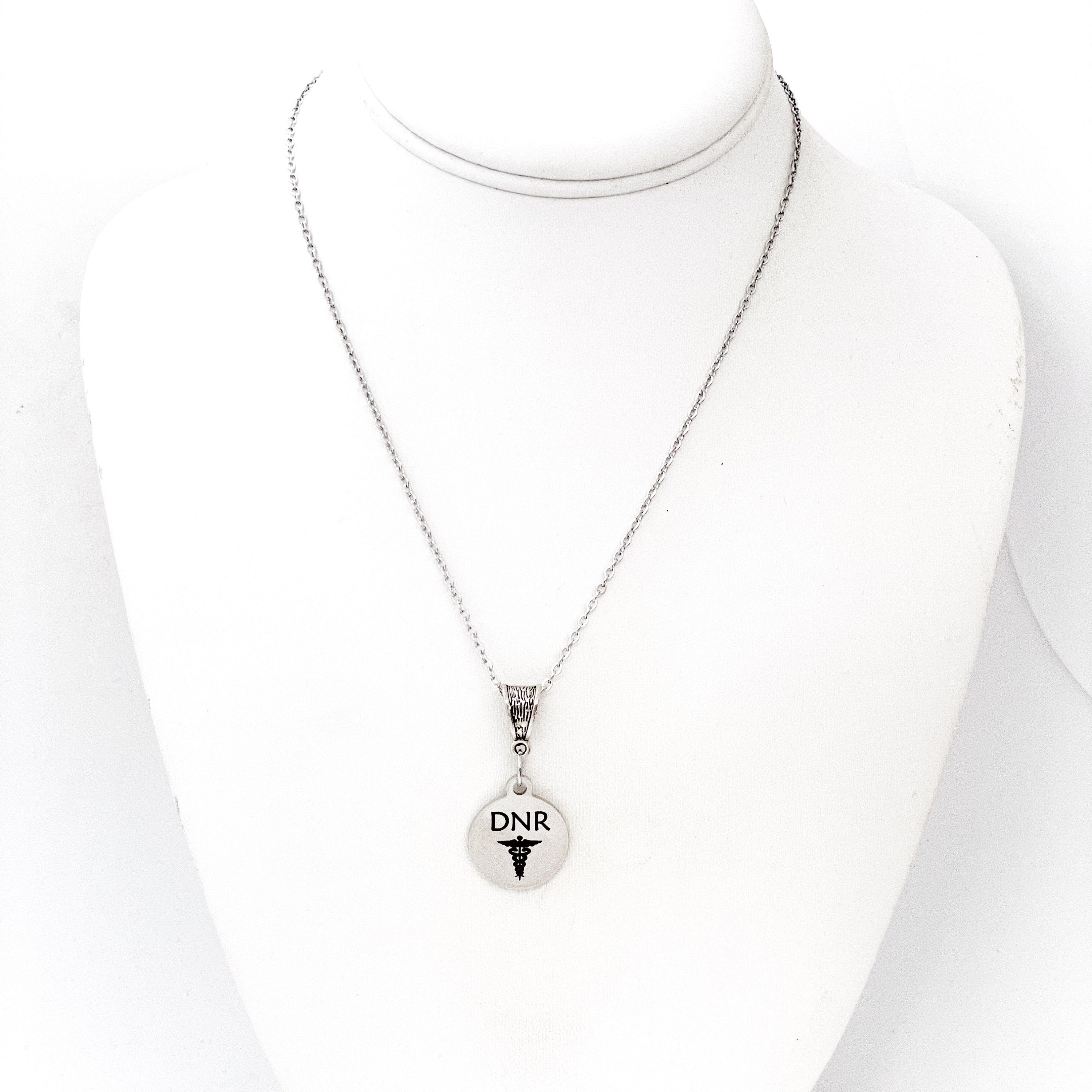 This is a stainless steel laser engraved pendant on a stainless steel chain and a silvertone bail. The pendant has “DNR” and a medical caduceus symbol on it. This pendant is available on your choice of 16, 18, 20, 22, 24, 26, 28 or 30 inch chain. The pendant is also available for individual purchase if you have another chain on which you would like to wear it. For an additional charge, the charm can be customized to meet your specific needs.