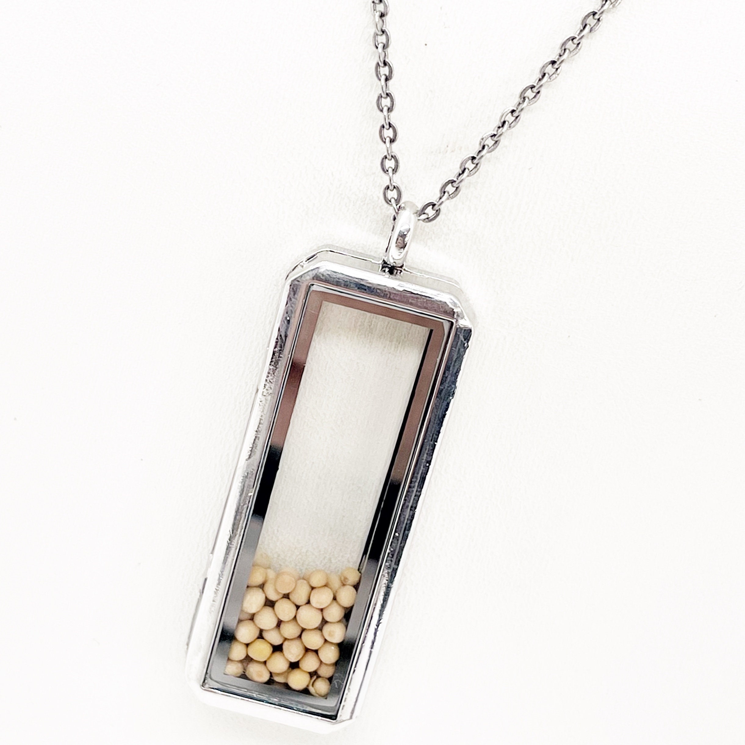 This beautiful necklace would make wonderful gift to remind someone of the scripture of Matthew 17:20 that tells us that with faith the size of a mustard seed, we can move mountains. It is a rectangle silver-tone floating mustard seed pendant on a stainless steel necklace. The pendant measures approx. 19x57x7mm or 2.25 inches in length.