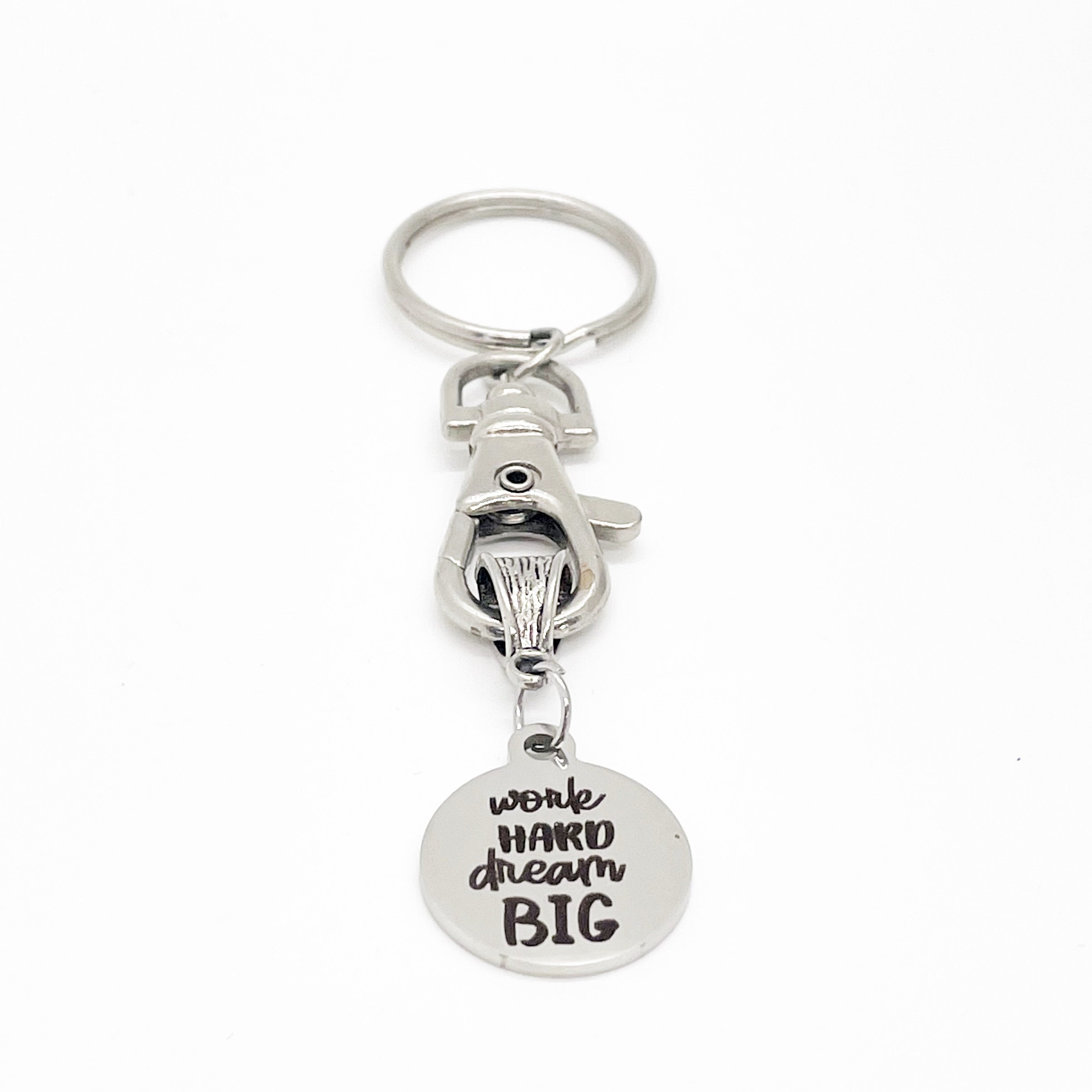 This keychain would make a great gift. It has a stainless steel laser engraved charm with “work hard dream big” on it.