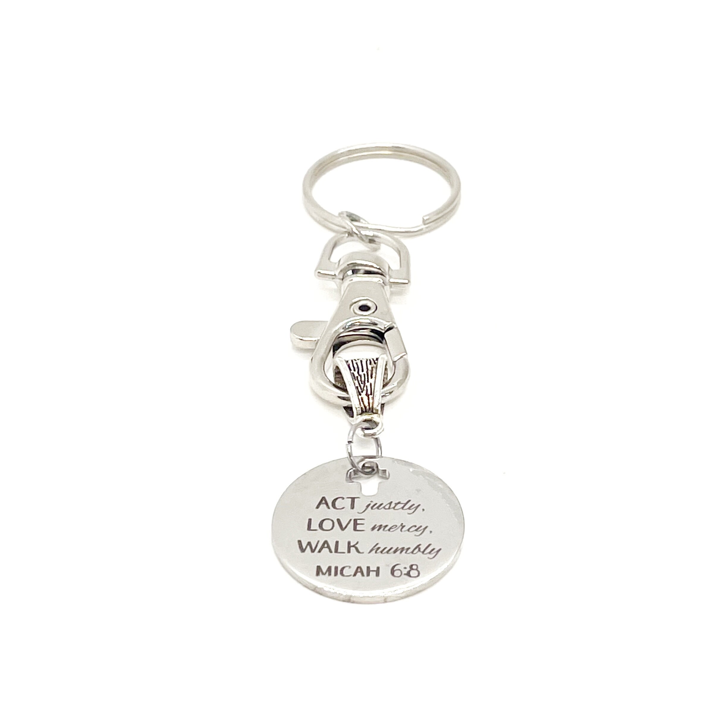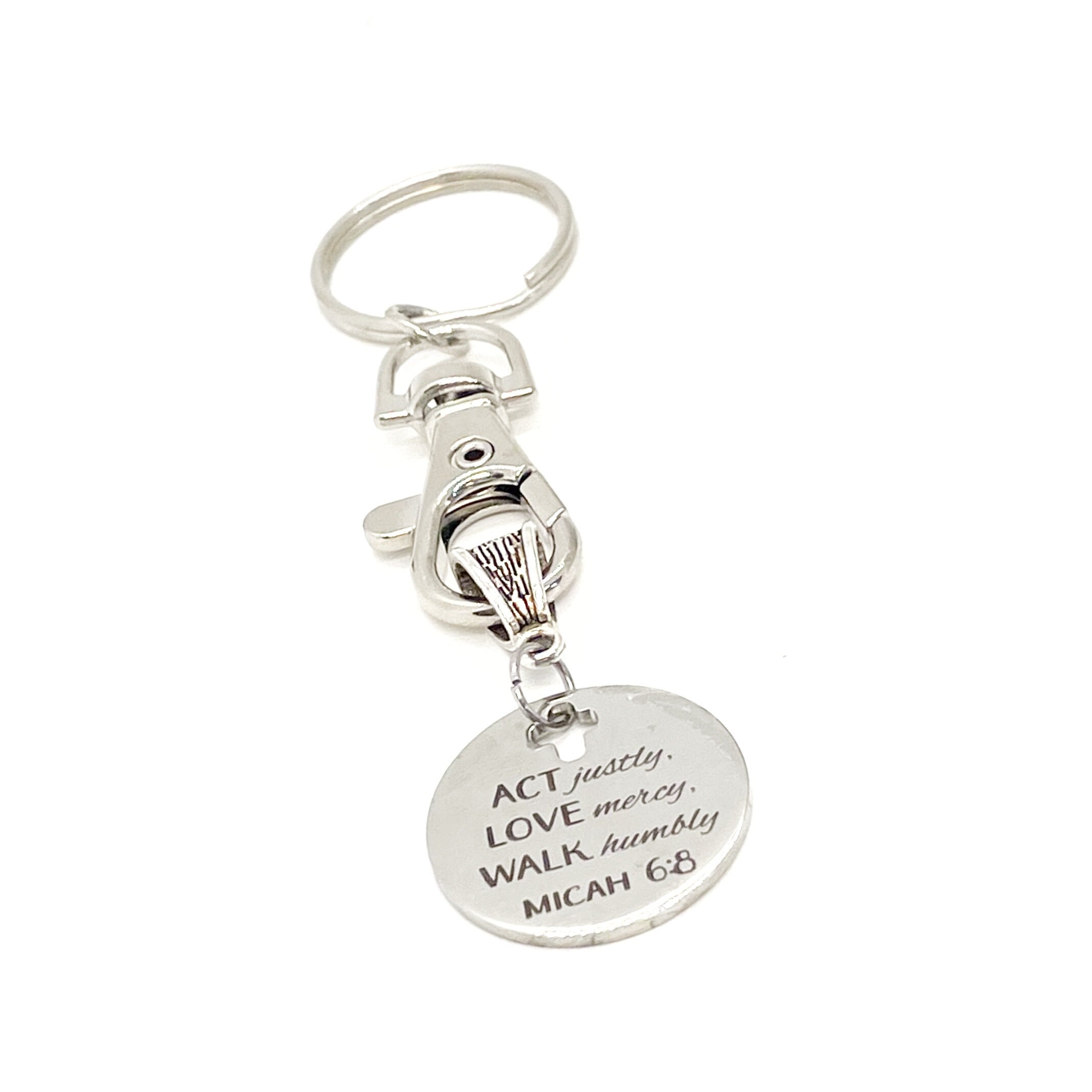 This is a great keychain that has a stainless steel laser engraved charm which says, "Act Justly, Love Mercy, Walk Humbly” from Micah 6:8.