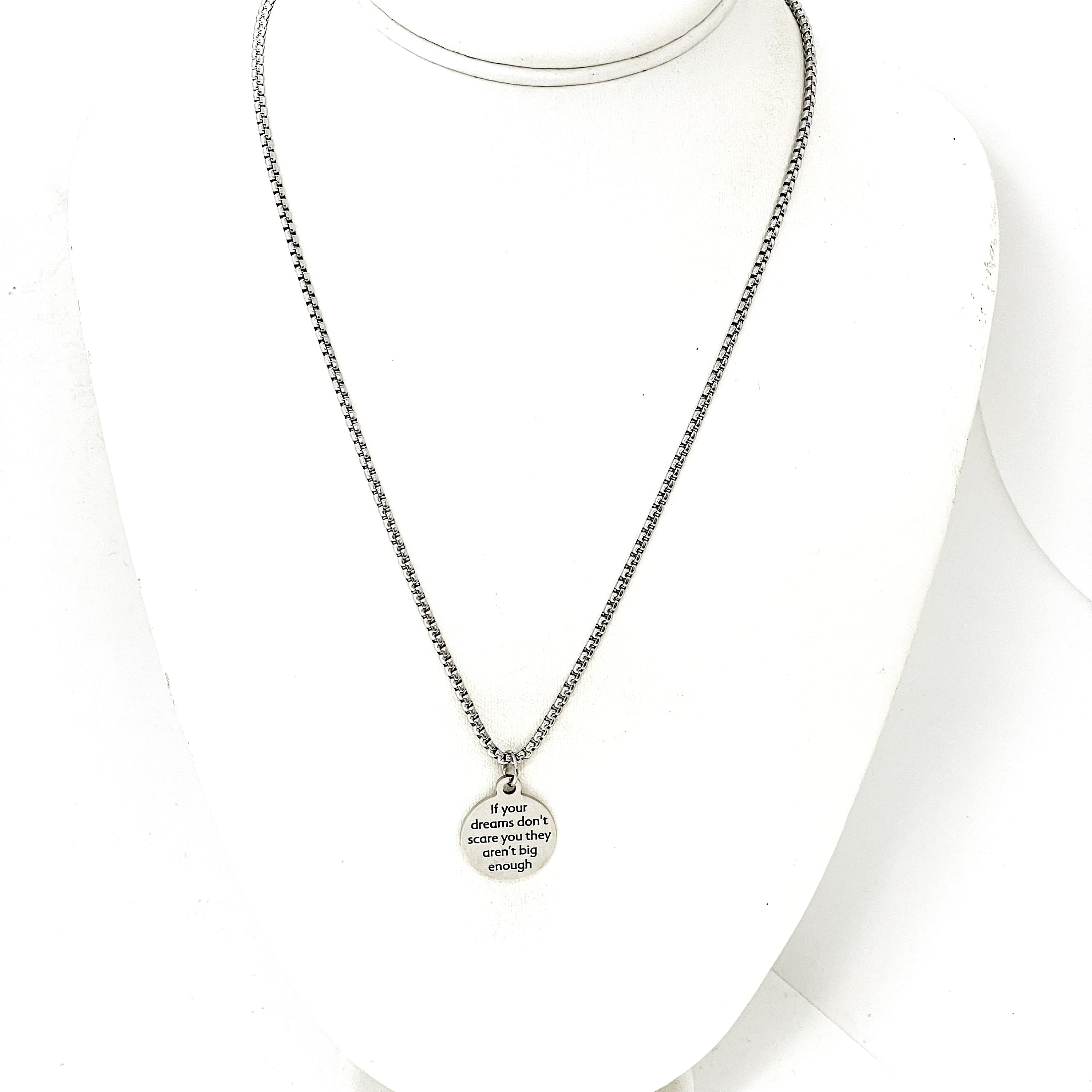 This is great stainless steel necklace for a mom. This necklace comes with a stainless steel laser engraved charm pendant on a 22 inch stainless steel box chain. The pendant has the following on it “If your dreams don’t scare you they aren’t big enough”.